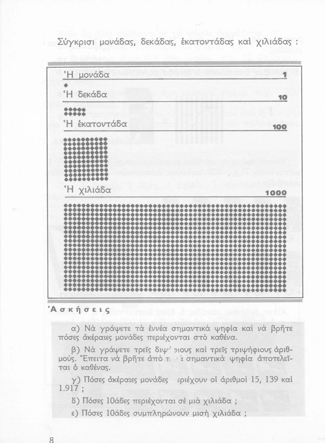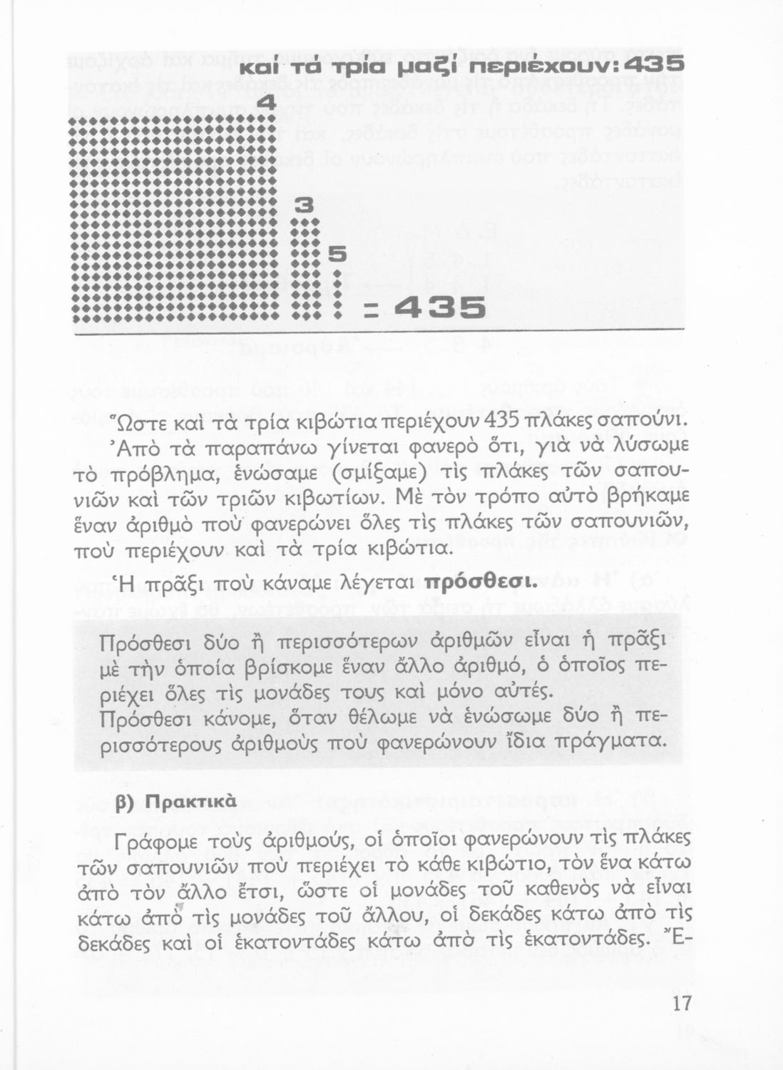 Βαθμίδα εκπαίδευσης: Πρωτοβάθμια Τάξη: Δ' Δημοτικού Μάθημα: Μαθηματικά Γλώσσα: Δημοτική Παρουσίαση περιεχομένου: Σχολικό εγχειρίδιο Αριθμητικής Δ΄ Δημοτικού χωρισμένο σε πρακτικά προβλήματα και τις λύσεις τους που περιλαμβάνει και κάποια στοιχεία Γεωμετρίας. |