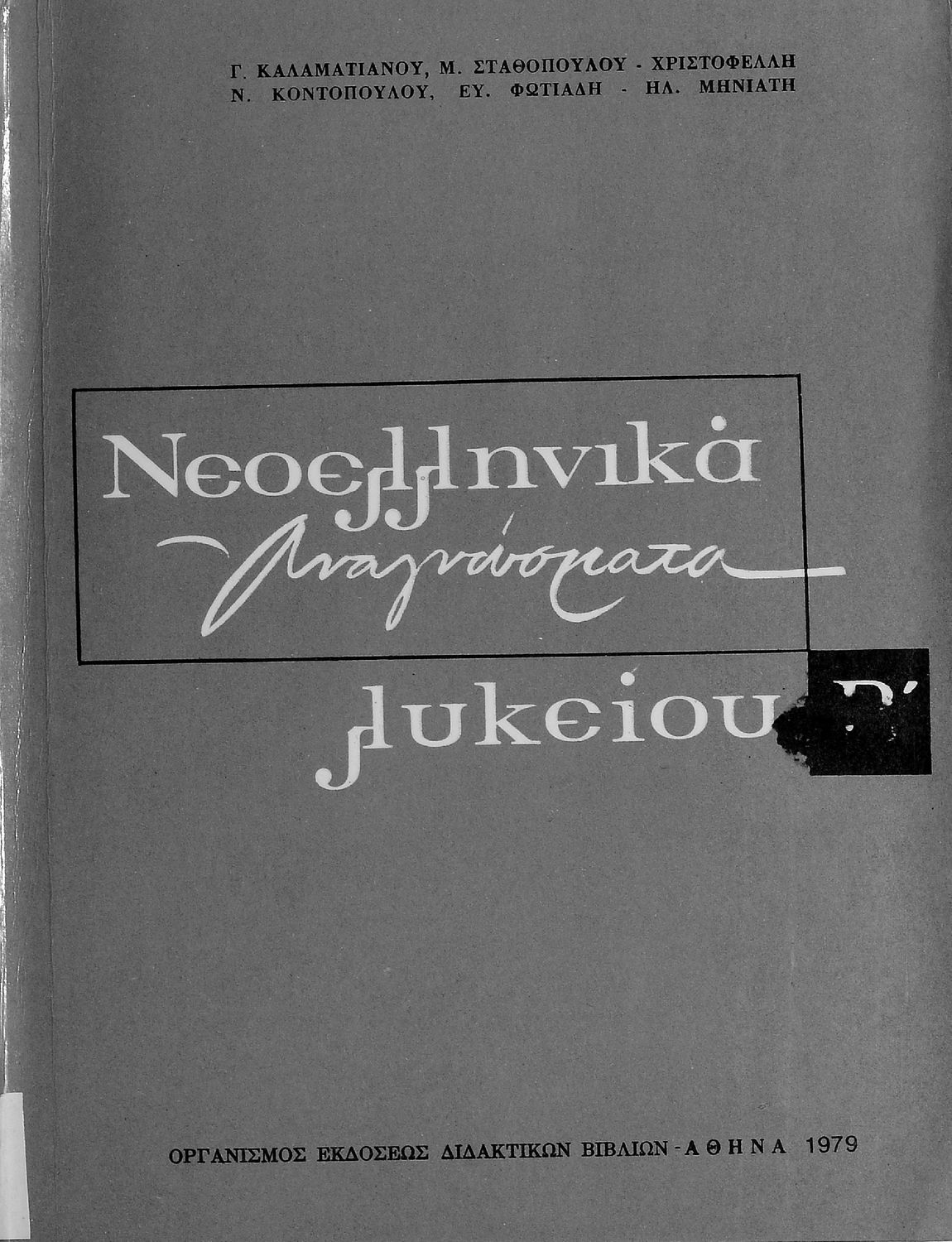 Κωδικός αναγνώρισης: 01-19239 Τίτλος: Νεοελληνικά Αναγνώσματα Β΄ Λυκείου Συγγραφέας: Γ. Καλαματιανός, Μ. Σταθοπούλου- Χριστοφέλλη, Ν. Κοντόπουλος, Ευ. Φωτιάδης, Ηλ. Μηνιάτης Μέγεθος και υπόστρωμα: Σχολικό εγχειρίδιο, μαλακό εξώφυλλο, 352 σελίδες. |