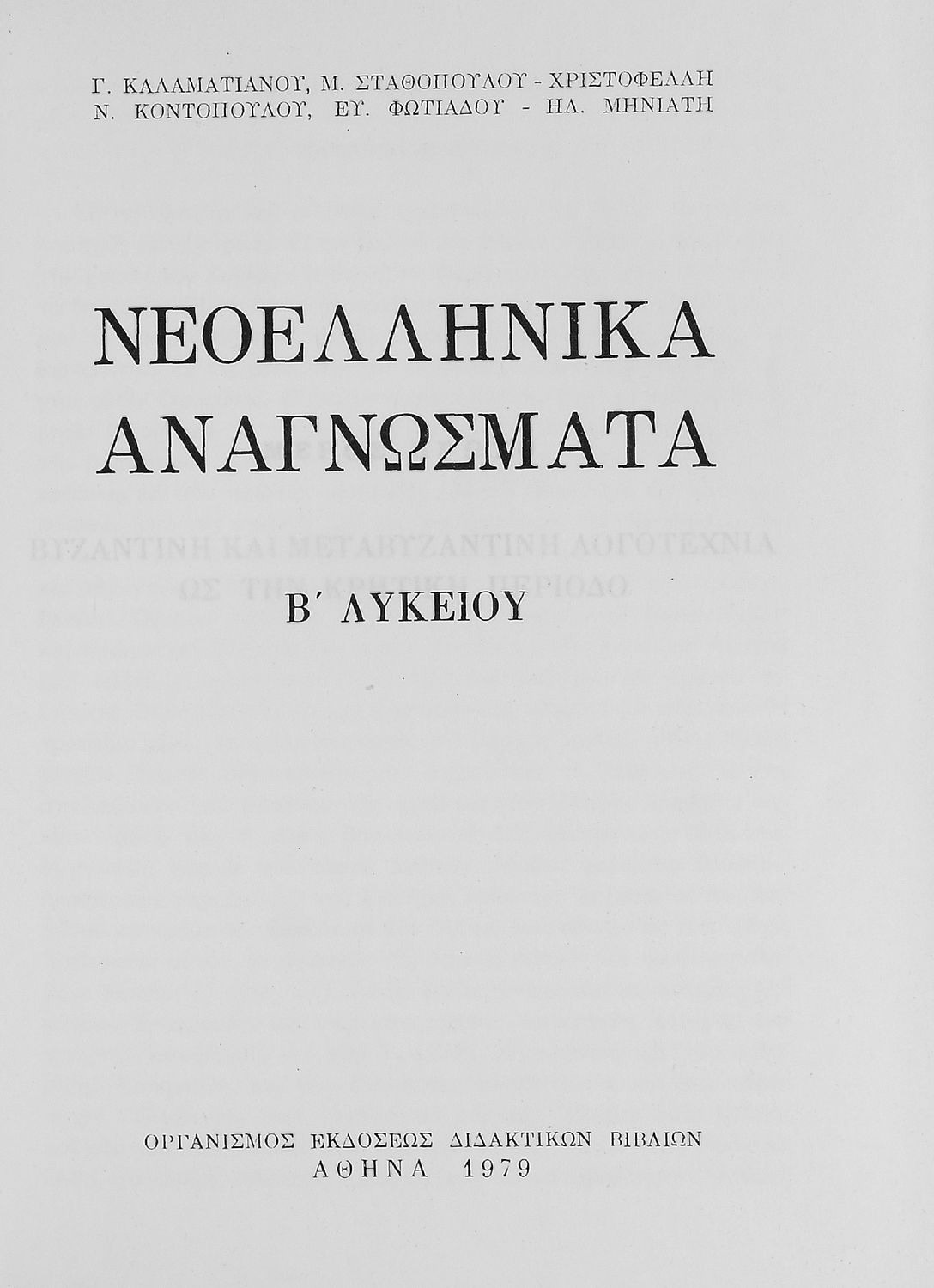 Σχολικό εγχειρίδιο Νέων Ελληνικών για την Β΄ Λυκείου με κείμενα και ποιήματα Ελλήνων και ξένων λογοτεχνών και ποιητών. Τα κείμενα προέρχονται από τη Βυζαντινή περίοδο ως και τη περίοδο των χρόνων του ελεύθερου κράτους. Οι εικόνες είναι από πίνακες ζωγραφικής Ελλήνων ζωγράφων.