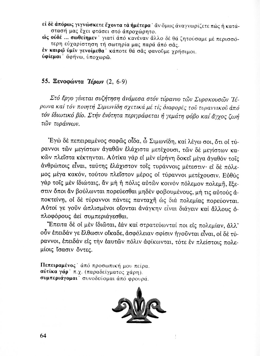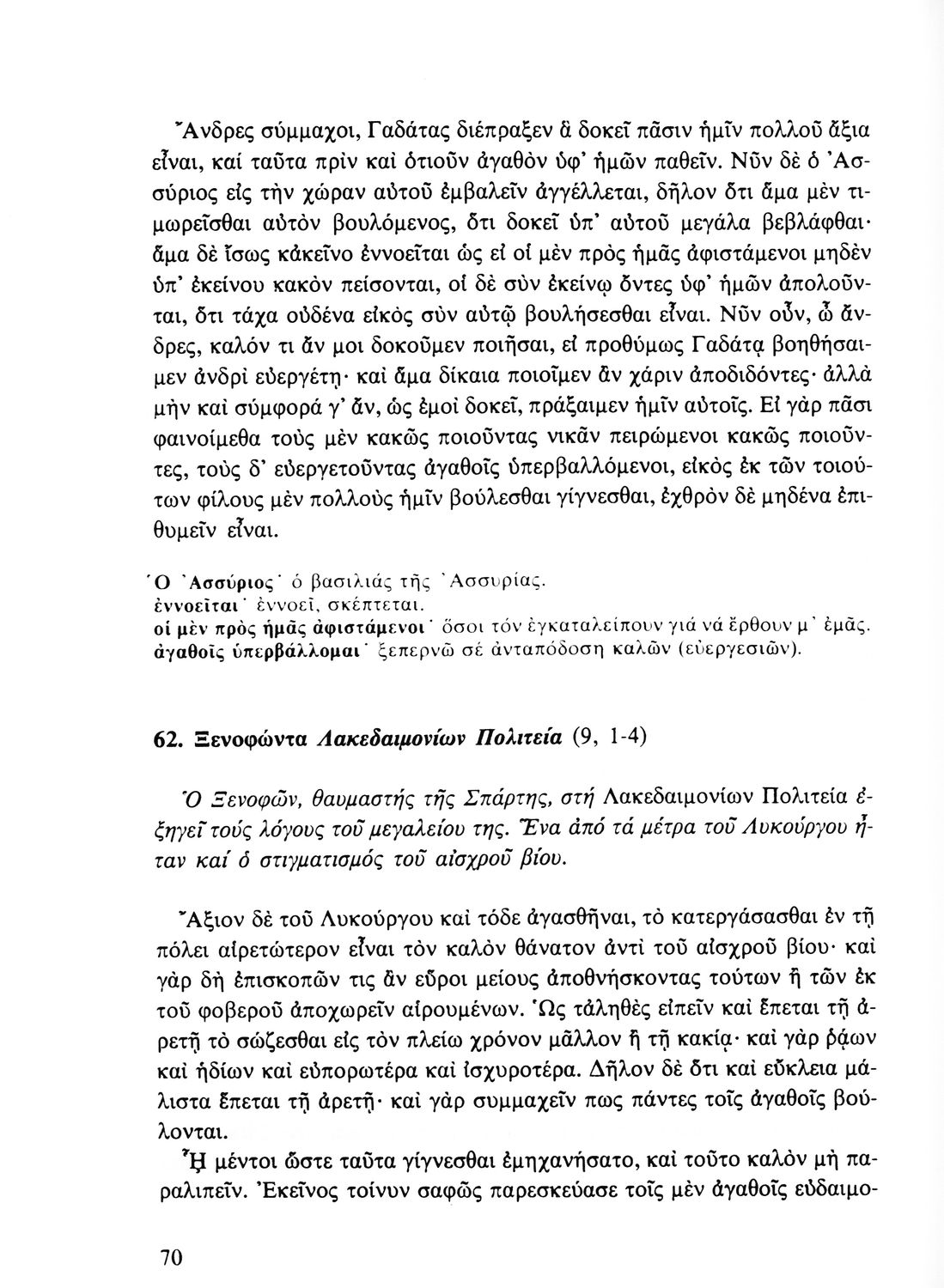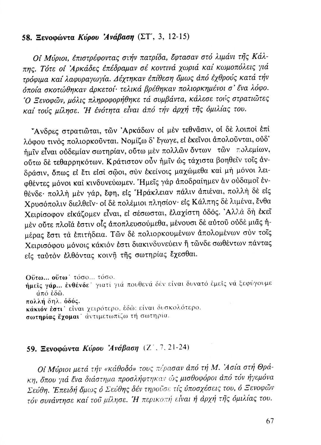 Σχολικό εγχειρίδιο Αρχαίων Ελληνικών Β' Λυκείου που περιλαμβάνει αποσπάσματα από έργα αρχαίων Ελλήνων συγγραφέων και γραμματικές και ερμηνευτικές παρατηρήσεις.