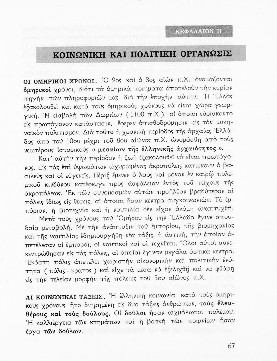 Σχολικό εγχειρίδιο Ιστορίας Α΄ Γυμνασίου που καλύπτει την περίοδο από την εμφάνιση των πρώτων πολιτισμών ως το τέλος της Μακεδονικής Ηγεμονίας. Φέρει το σύμβολο της δικτατορίας.