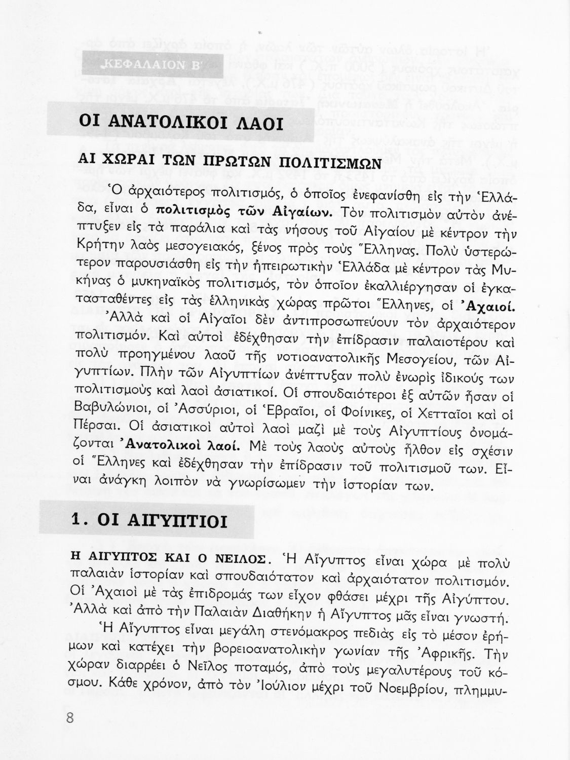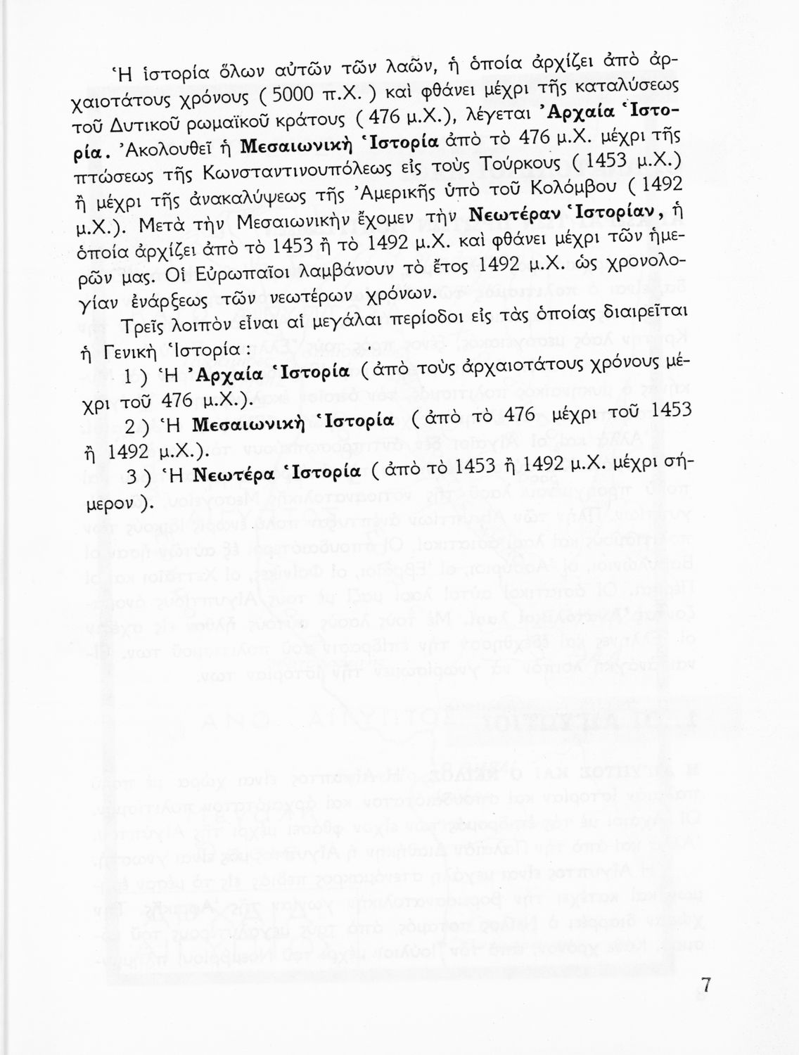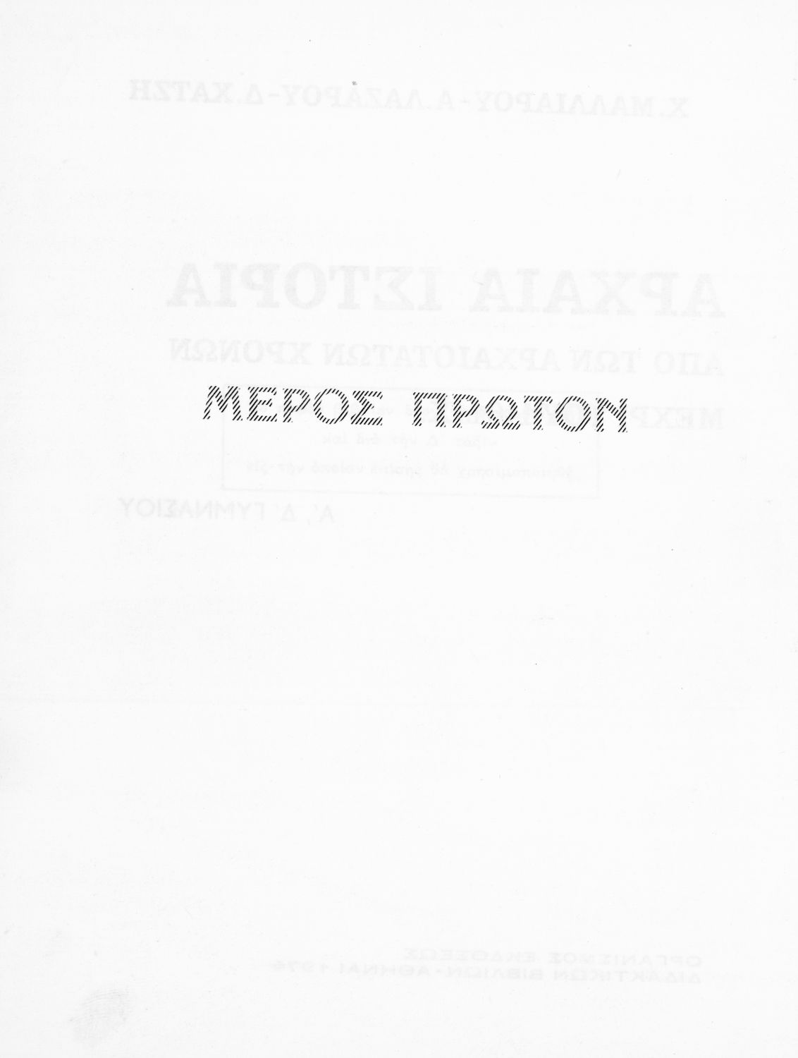 Σχολικό εγχειρίδιο Ιστορίας Α΄ Γυμνασίου που καλύπτει την περίοδο από την εμφάνιση των πρώτων πολιτισμών ως το τέλος της Μακεδονικής Ηγεμονίας. Φέρει το σύμβολο της δικτατορίας.