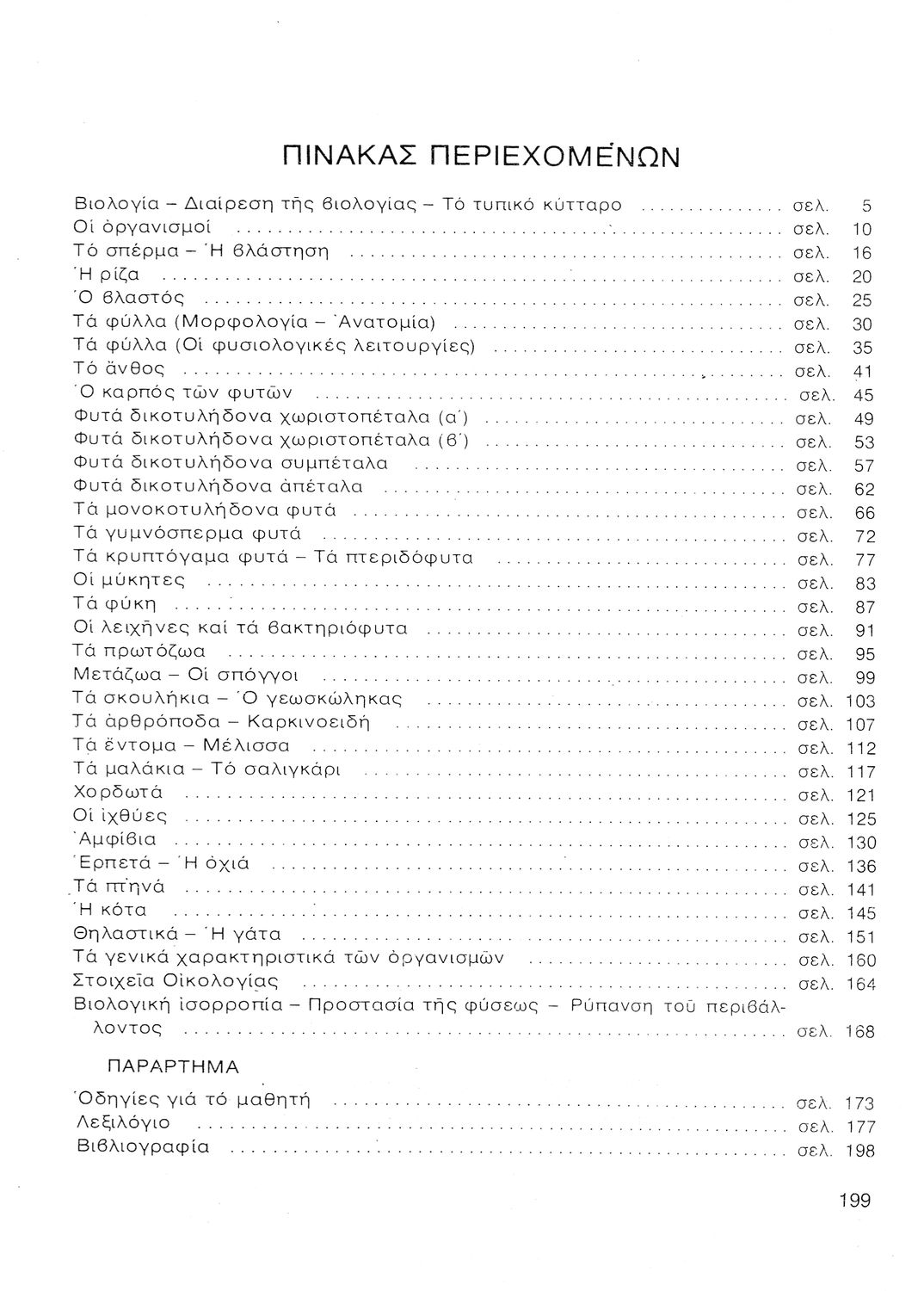 Σχολικό εγχειρίδιο Βοτανικής και Ζωολογίας Α΄ Γυμνασίου που παρουσιάζει ζώα και φυτά με βάση τα χαρακτηριστικά, τις ιδιότητες αναπαραγωγής και εξέλιξής τους καθώς και η ευρύτερη σημασία που έχουν για το ...