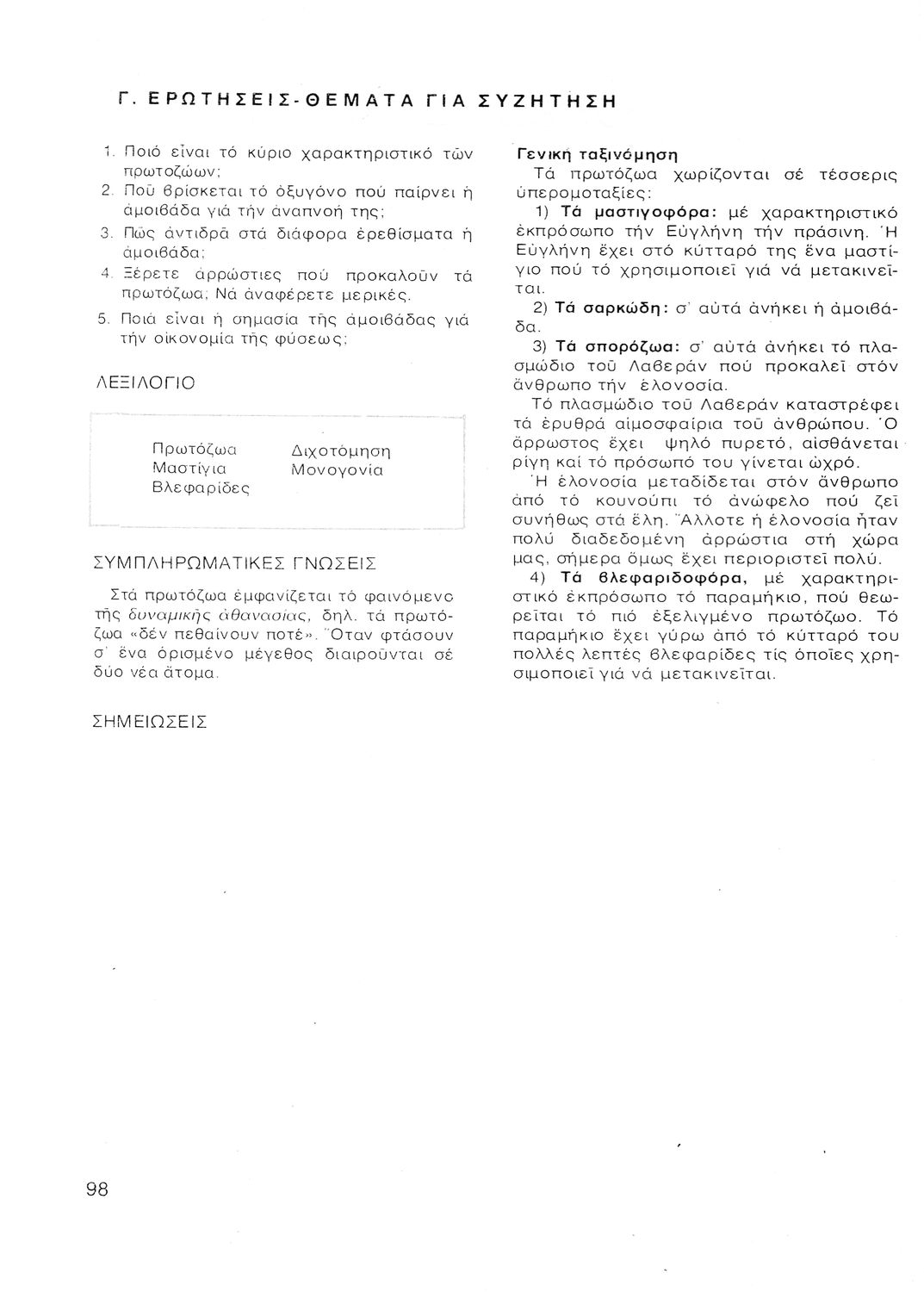 Βαθμίδα εκπαίδευσης: Δευτεροβάθμια Τάξη: Α' Γυμνασίου Γλώσσα: Δημοτική Παρουσίαση περιεχομένου: Σχολικό εγχειρίδιο Βοτανικής και Ζωολογίας Α΄ Γυμνασίου που παρουσιάζει ζώα και φυτά με βάση τα χαρακτηριστικά, τις ιδιότητες αναπαραγωγής και εξέλιξής τους καθώς και η ευρύτερη σημασία που έχουν για το οικοσύστημα. |