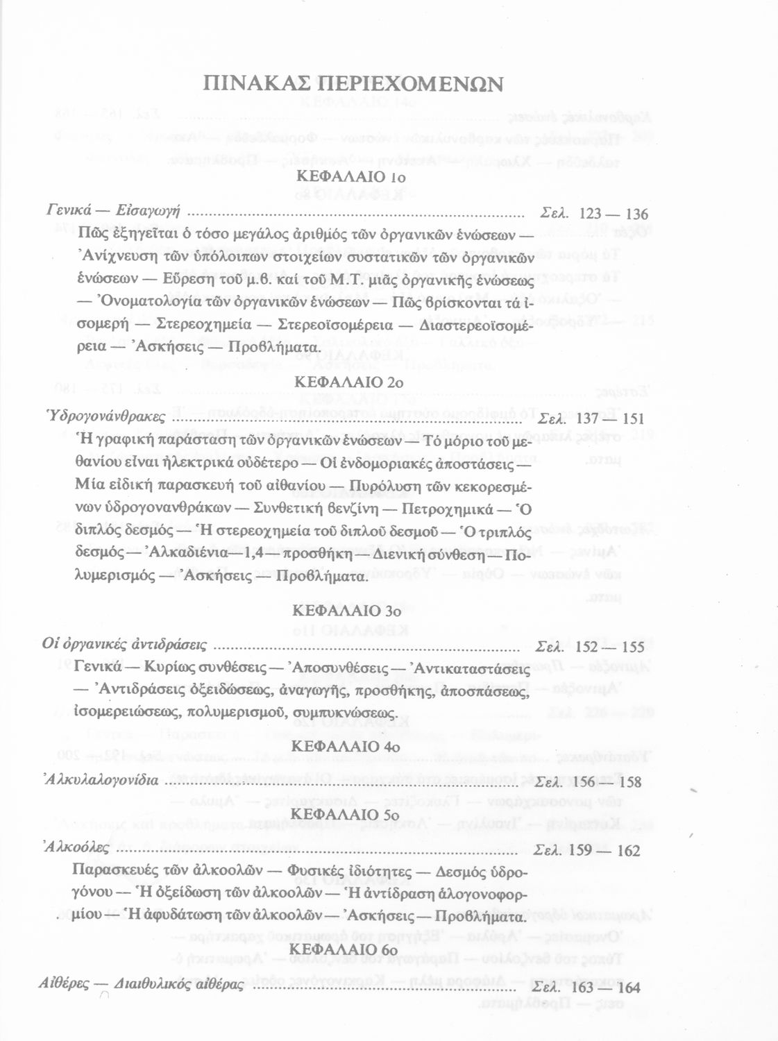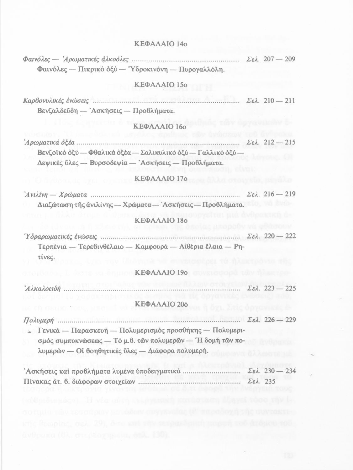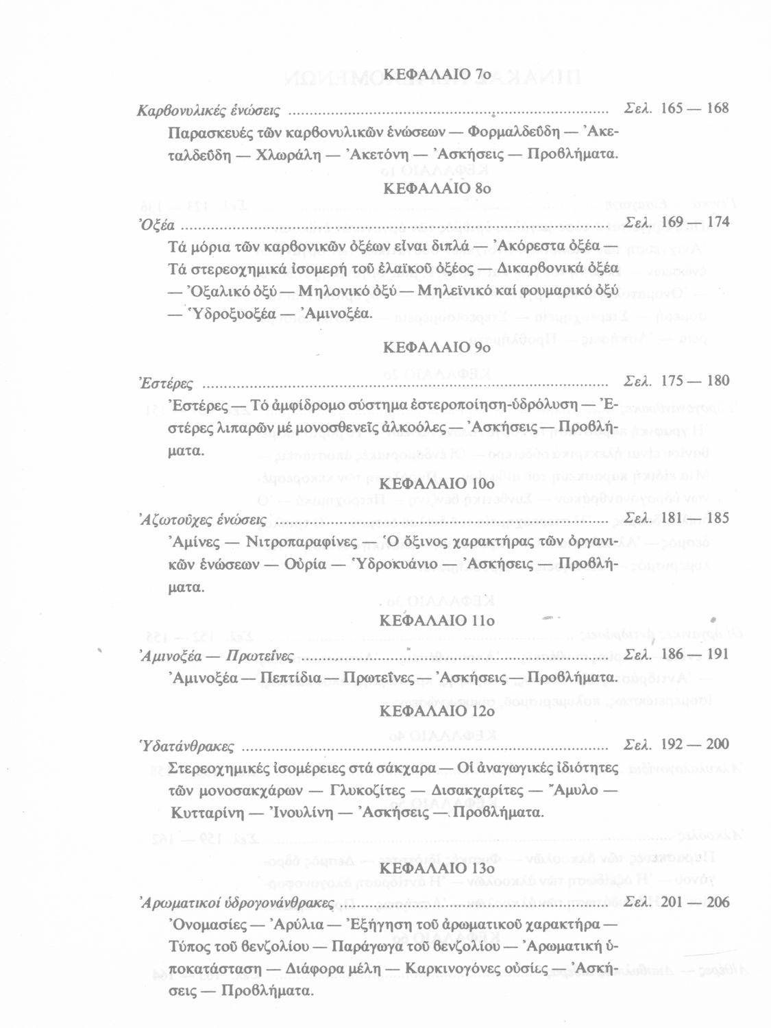 Το βιβλίο προσδιορίζει βασικές έννοιες οργανικής χημείας (οργανικές ενώσεις, χημική ανάλυση, ονοματολογία και συμβολισμοί) καθώς γίνεται αναλυτική περιγραφή των ιδιοτήτων και των ενώσεων αμετάλλων, οξέων, ...