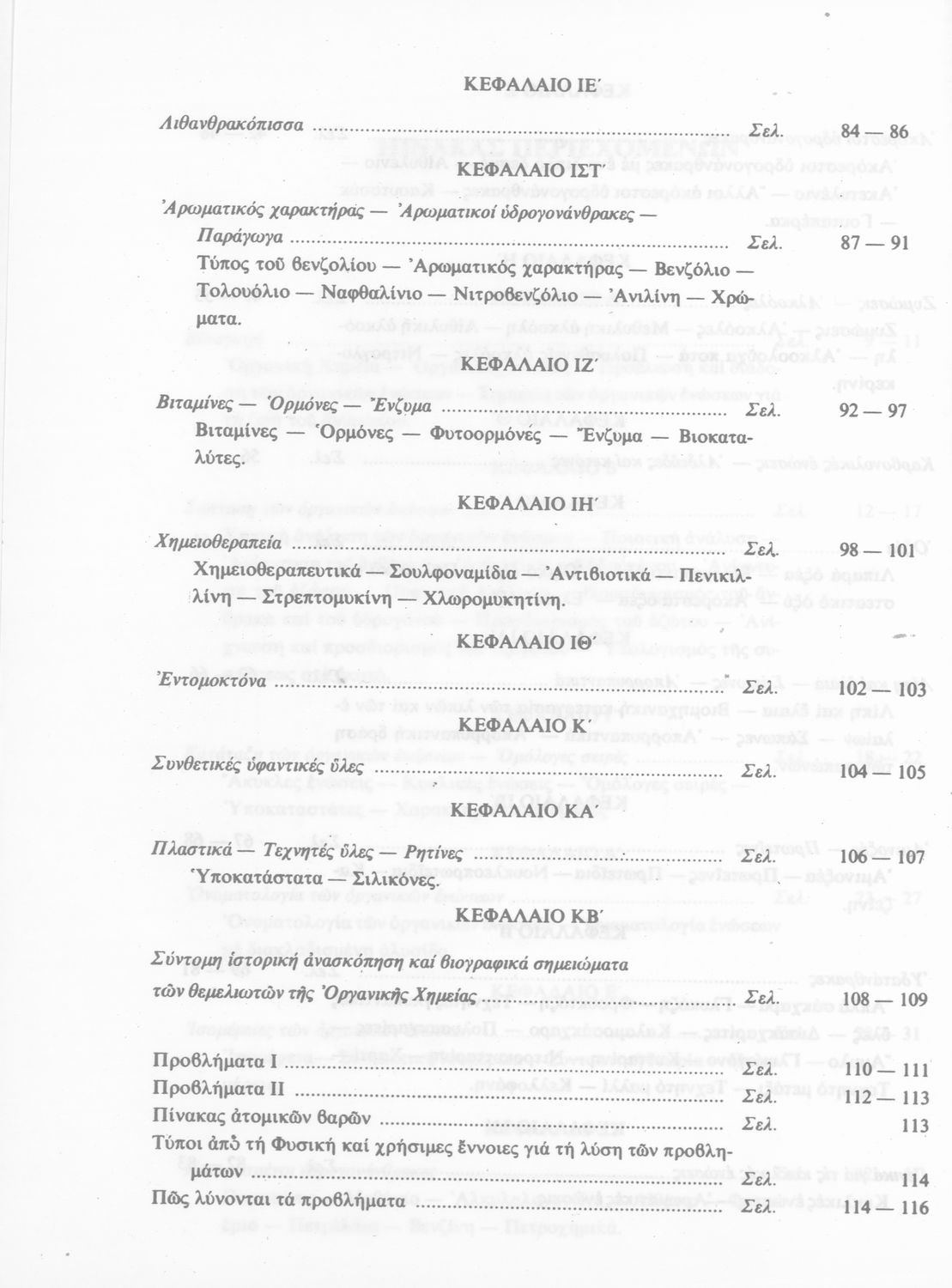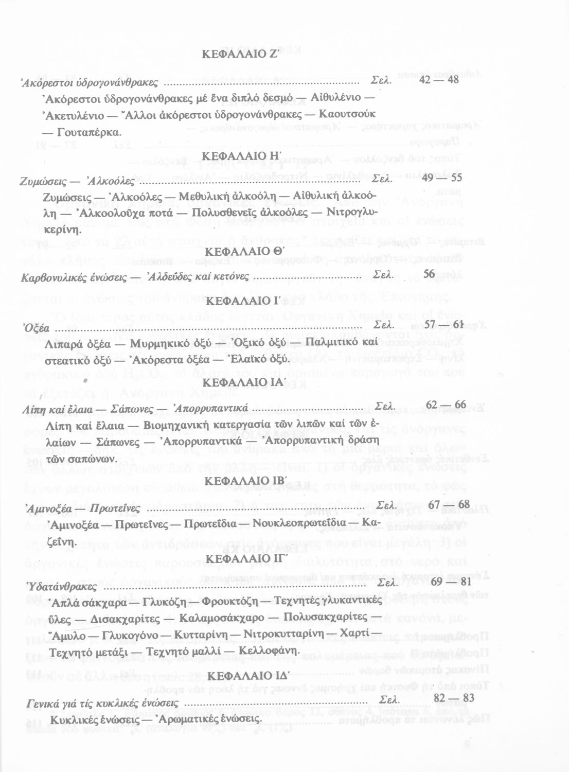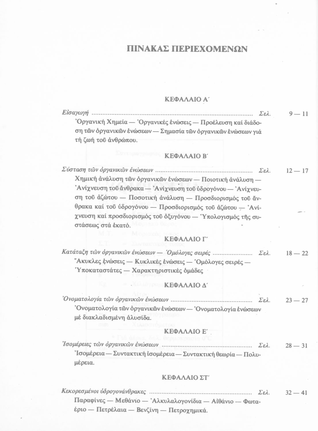 Το βιβλίο προσδιορίζει βασικές έννοιες οργανικής χημείας (οργανικές ενώσεις, χημική ανάλυση, ονοματολογία και συμβολισμοί) καθώς γίνεται αναλυτική περιγραφή των ιδιοτήτων και των ενώσεων αμετάλλων, οξέων, ...
