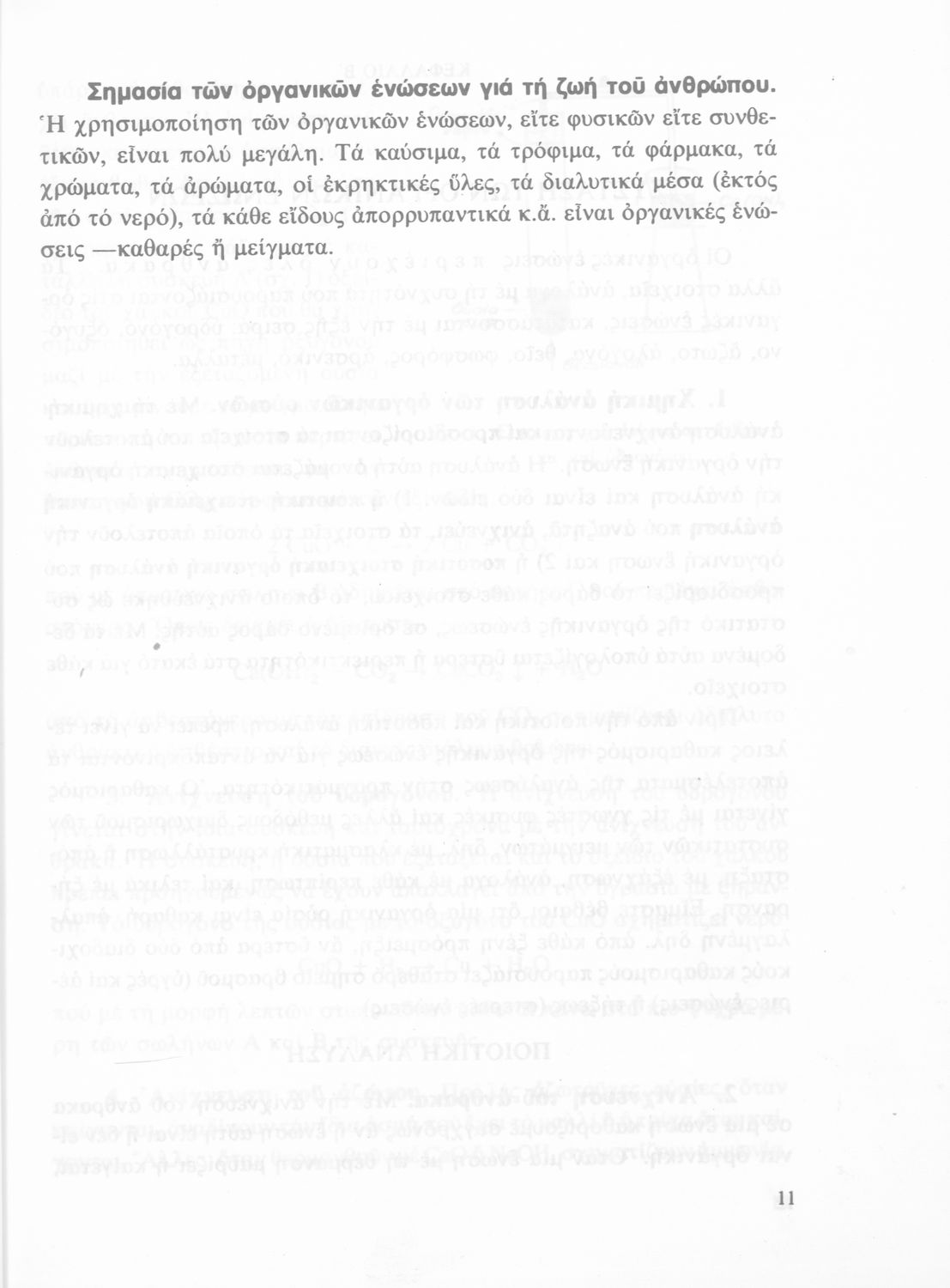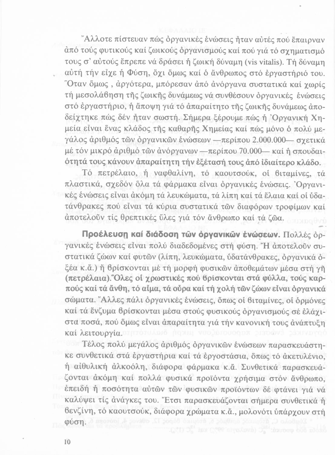 Σχολικό εγχειρίδιο Χημείας που προσδιορίζει βασικές έννοιες οργανικής χημείας (οργανικές ενώσεις, χημική ανάλυση, ονοματολογία και συμβολισμοί) καθώς γίνεται αναλυτική περιγραφή των ιδιοτήτων και των ενώσεων αμετάλλων, οξέων, αρωματικών υδρογονανθράκων.