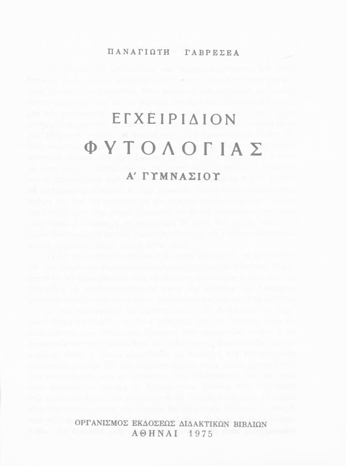 Σχολικό εγχειρίδιο Φυτολογίας για τη Β΄ τάξη των Εξαταξίων Γυμνασίων και Ημιγυμνασίων και τη Δ΄ τάξη των οκταταξίων Γυμνασίων που εξετάζει φυτά της Ελλάδας και παραθέτει στοιχεία γενικής φυτολογίας για την ...