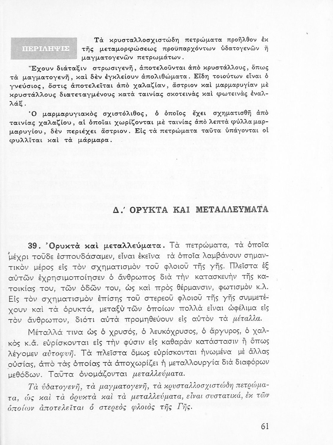 Παρουσίαση περιεχομένου: Σχολικό εγχειρίδιο Γεωλογίας/Ορυκτολογίας για την Α΄ Λυκείου που περιλαμβάνει χθονογραφική, δυναμική και ιστορική γεωλογία, και γενική και ειδική ορυκτολογία. Ο συγγραφέας ήταν καθηγητής πανεπιστημίου και η συγγραφέας φυσικός.