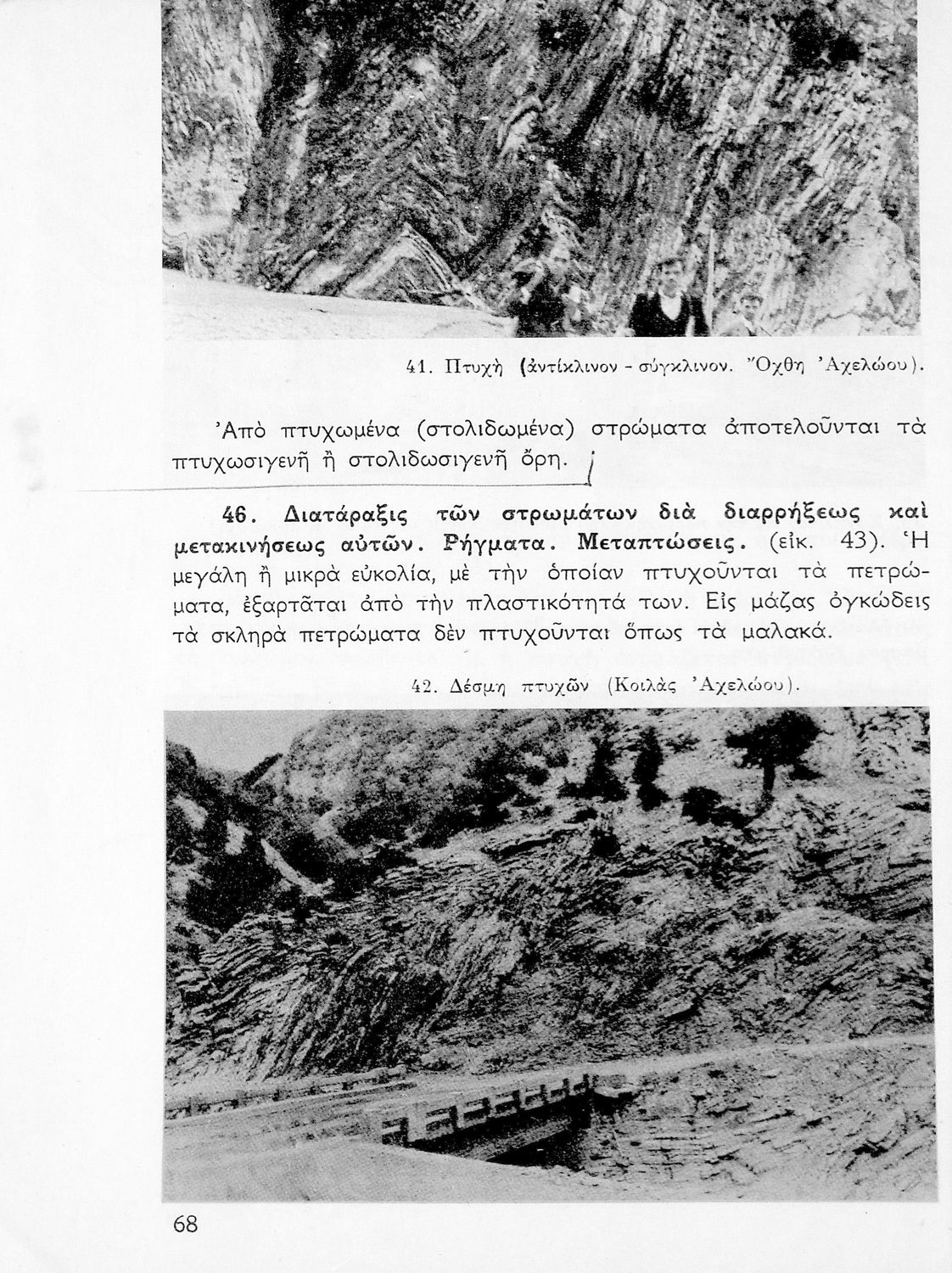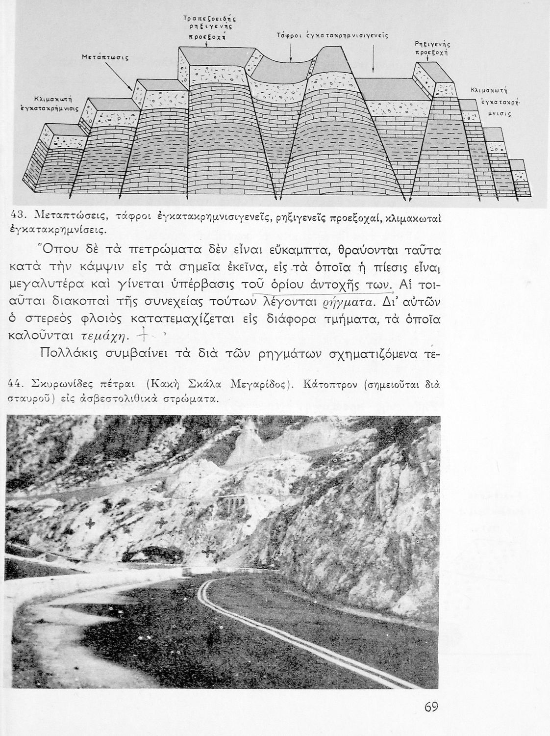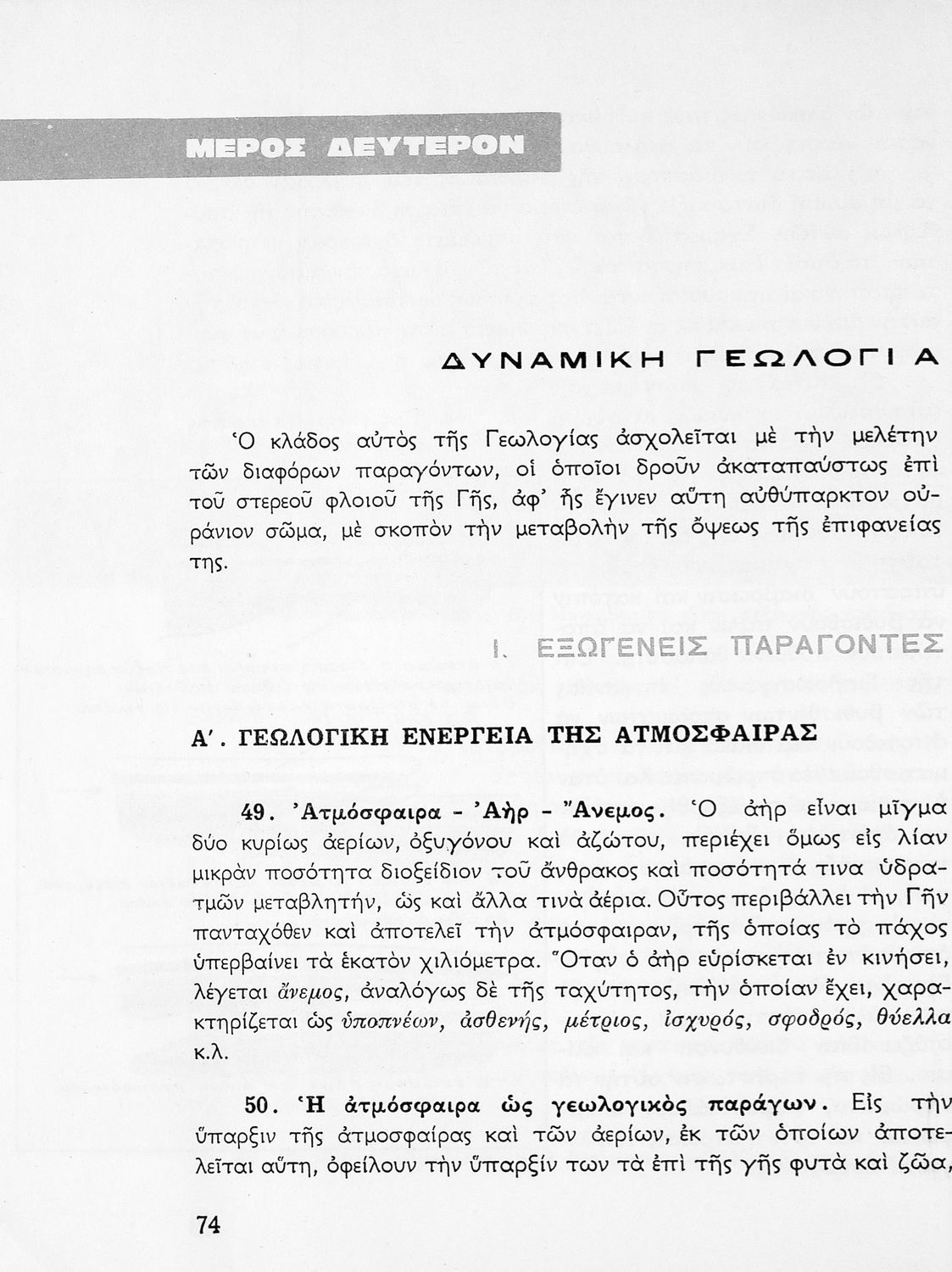 Σχολικό εγχειρίδιο Γεωλογίας/Ορυκτολογίας για την Α΄ Λυκείου που περιλαμβάνει χθονογραφική, δυναμική και ιστορική γεωλογία, και γενική και ειδική ορυκτολογία. Ο συγγραφέας ήταν καθηγητής πανεπιστημίου και η συγγραφέας φυσικός.