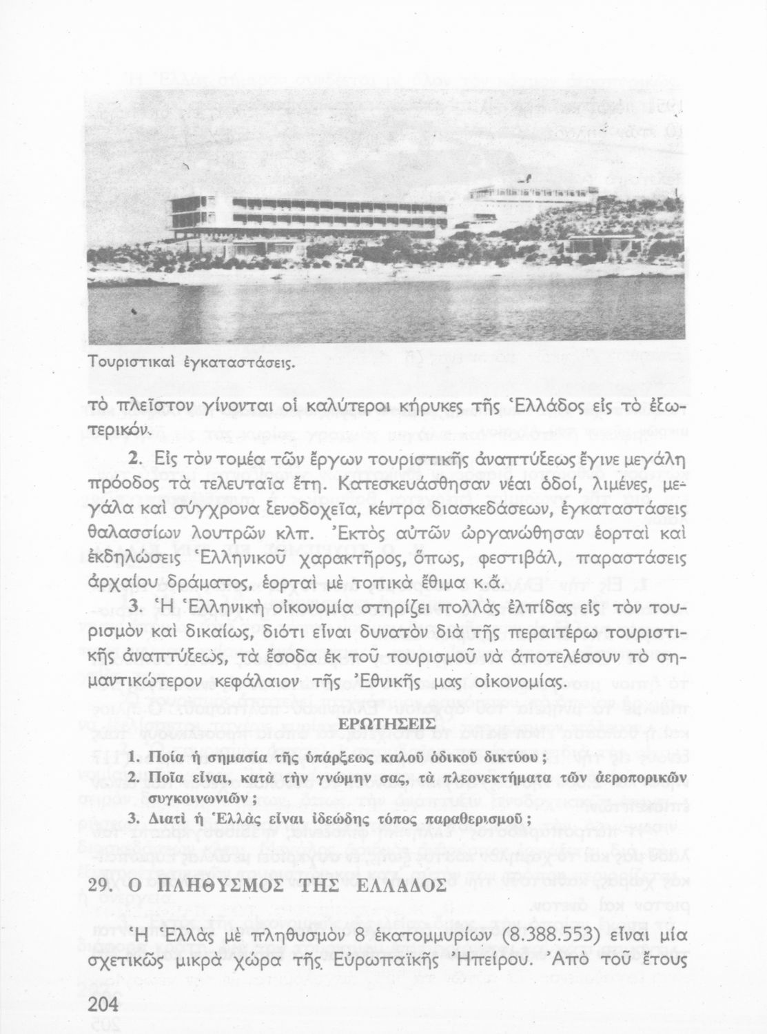 Σχολικό εγχειρίδιο Γεωγραφίας Α΄ Γυμνασίου που εξετάζει την Ελλάδα από γεωφυσική, πολιτική, οικονομική και πολιτισμική άποψη. Φέρει το σύμβολο της δικτατορίας.