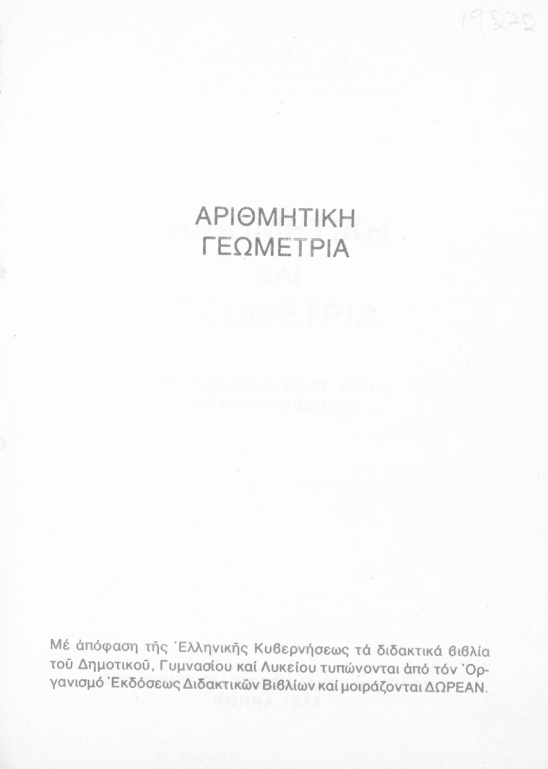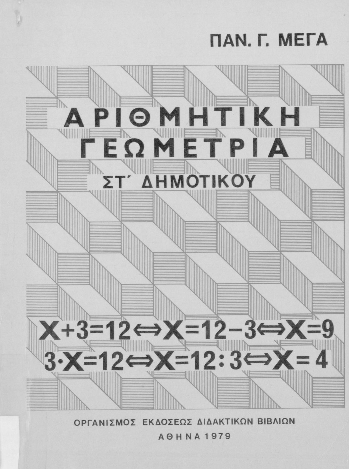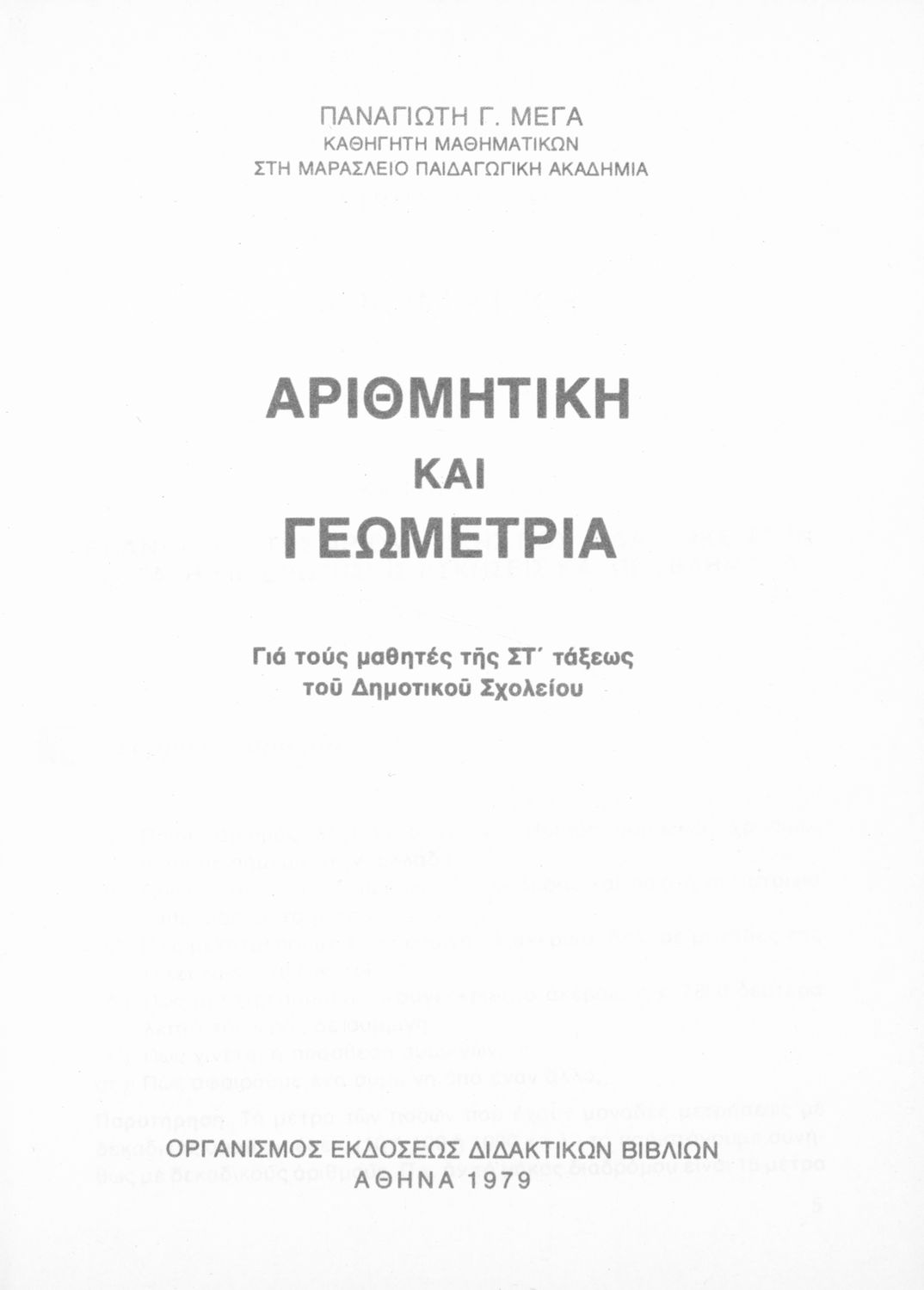 Κωδικός αναγνώρισης: 01-19272 Τίτλος: Αριθμητική και γεωμετρία για τους μαθητές της ΣΤ΄ τάξεως του Δημοτικού Σχολείου Συγγραφέας: Παναγιώτης Γ. Μέγας Εικονογράφος: Μάρθα Καπετανάκου - Ξυνοπούλου Μέγεθος και υπόστρωμα: Σχολικό εγχειρίδιο, 20εκ., μαλακό εξώφυλλο, 204 σελίδες. Εξώφυλλο (έγχρωμο), σκίτσα (έγχρωμα). |