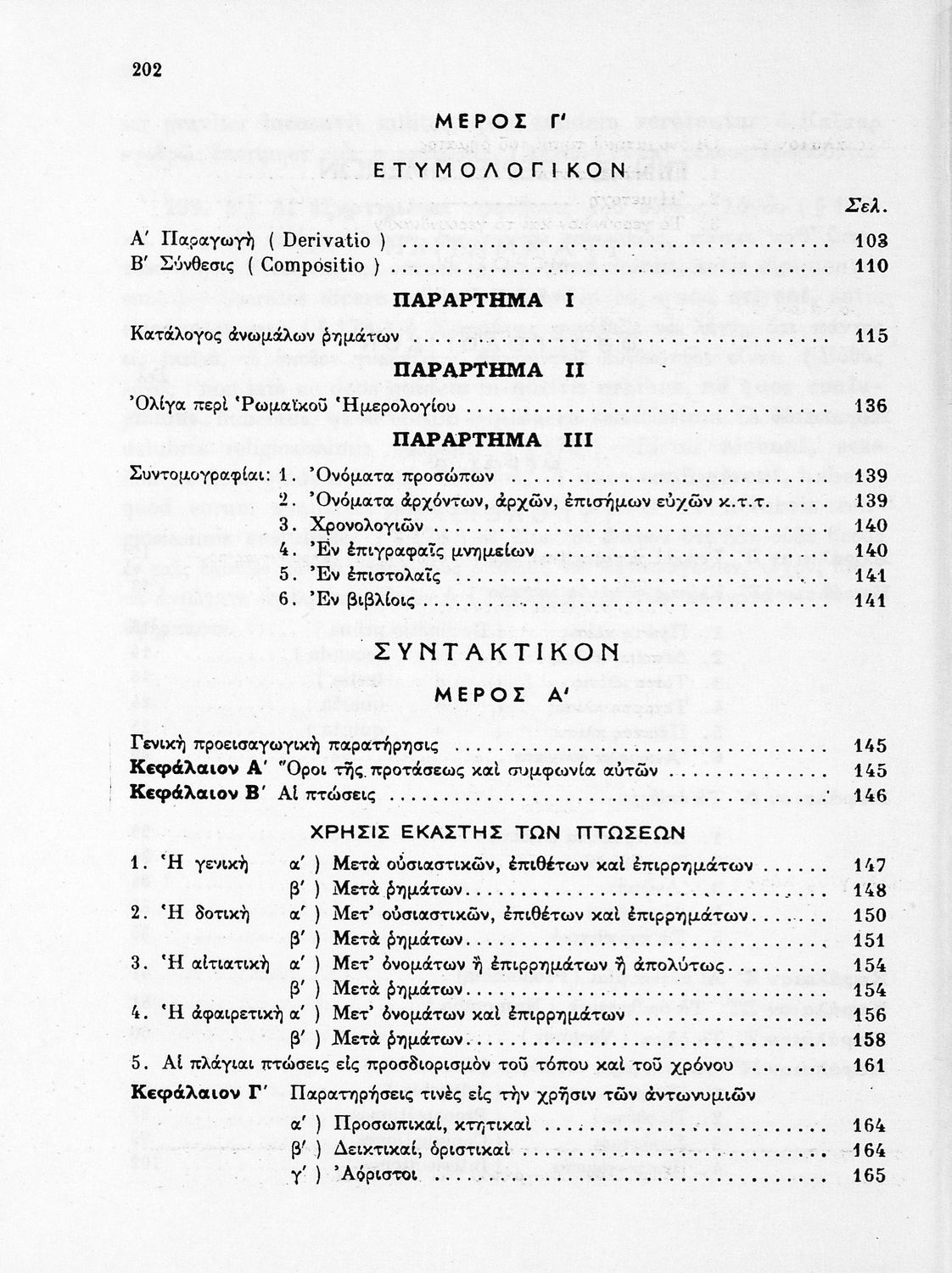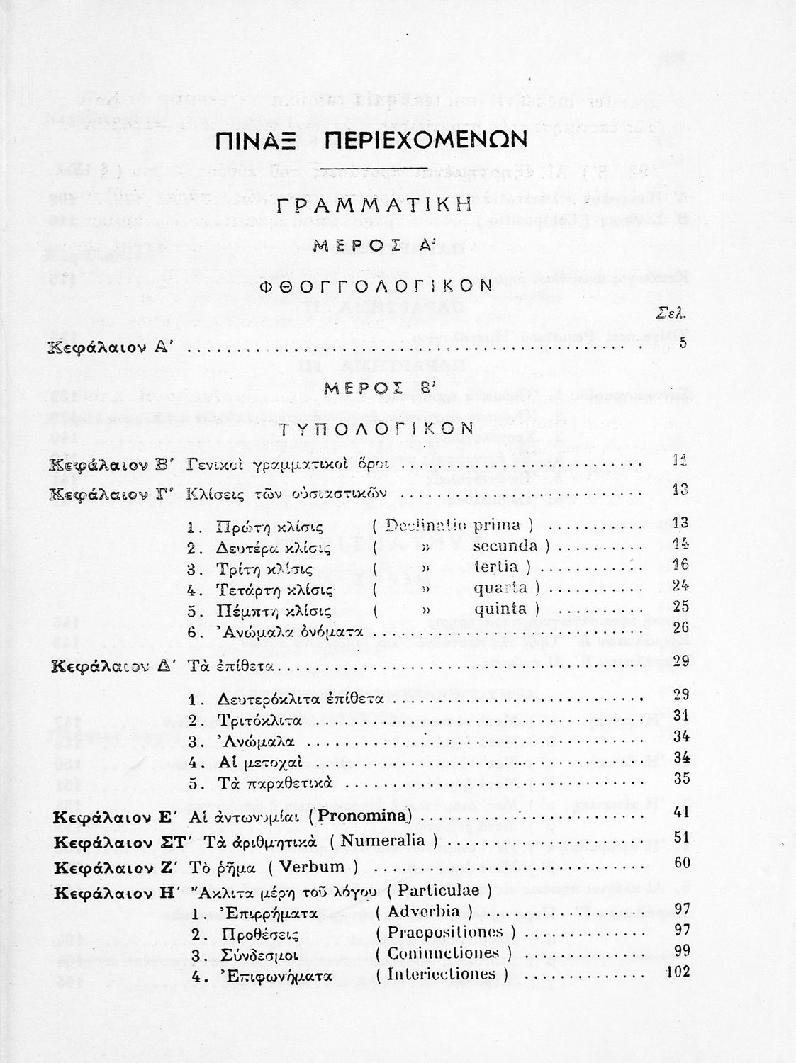 Σχολικό εγχειρίδιο Αρχαίων Ελληνικών Γυμνασίου που περιέχει τους κανόνες γραμματικής και είναι χωρισμένο σε φθογγολογικό, τυπολογικό και ετυμολογικό μέρος. Περιέχει και κατάλογο ανωμάλων ρημάτων.