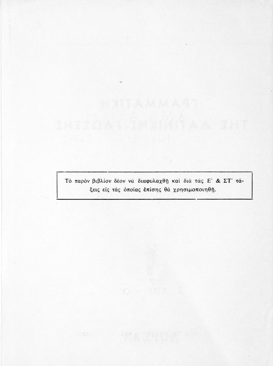 Βαθμίδα εκπαίδευσης: Δευτεροβάθμια Μάθημα: Λατινικά Γλώσσα: Απλή καθαρεύουσα Παρουσίαση περιεχομένου: Σχολικό εγχειρίδιο Λατινικών που περιλαμβάνει τη γραμματική της λατινικής και είναι χωρισμένο στο φθογγολογικό, το τυπολογικό και το ετυμολογικό μέρος. Περιέχει και τους συντακτικούς κανόνες της λατινικής. |