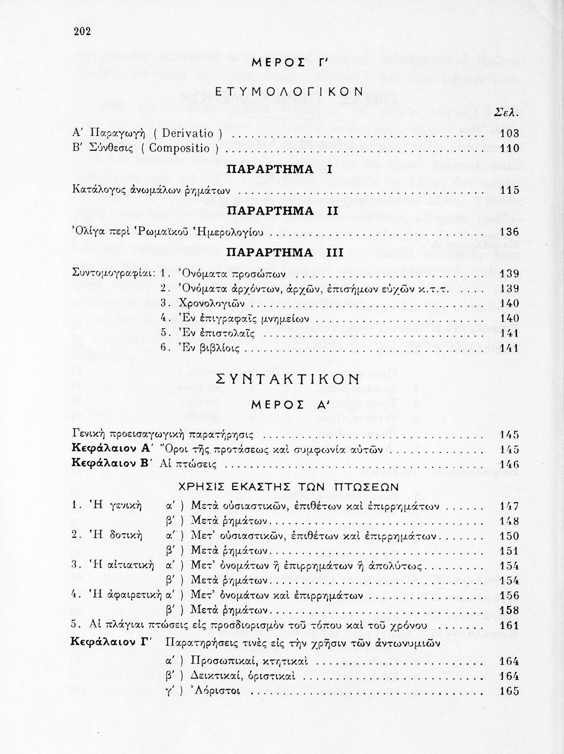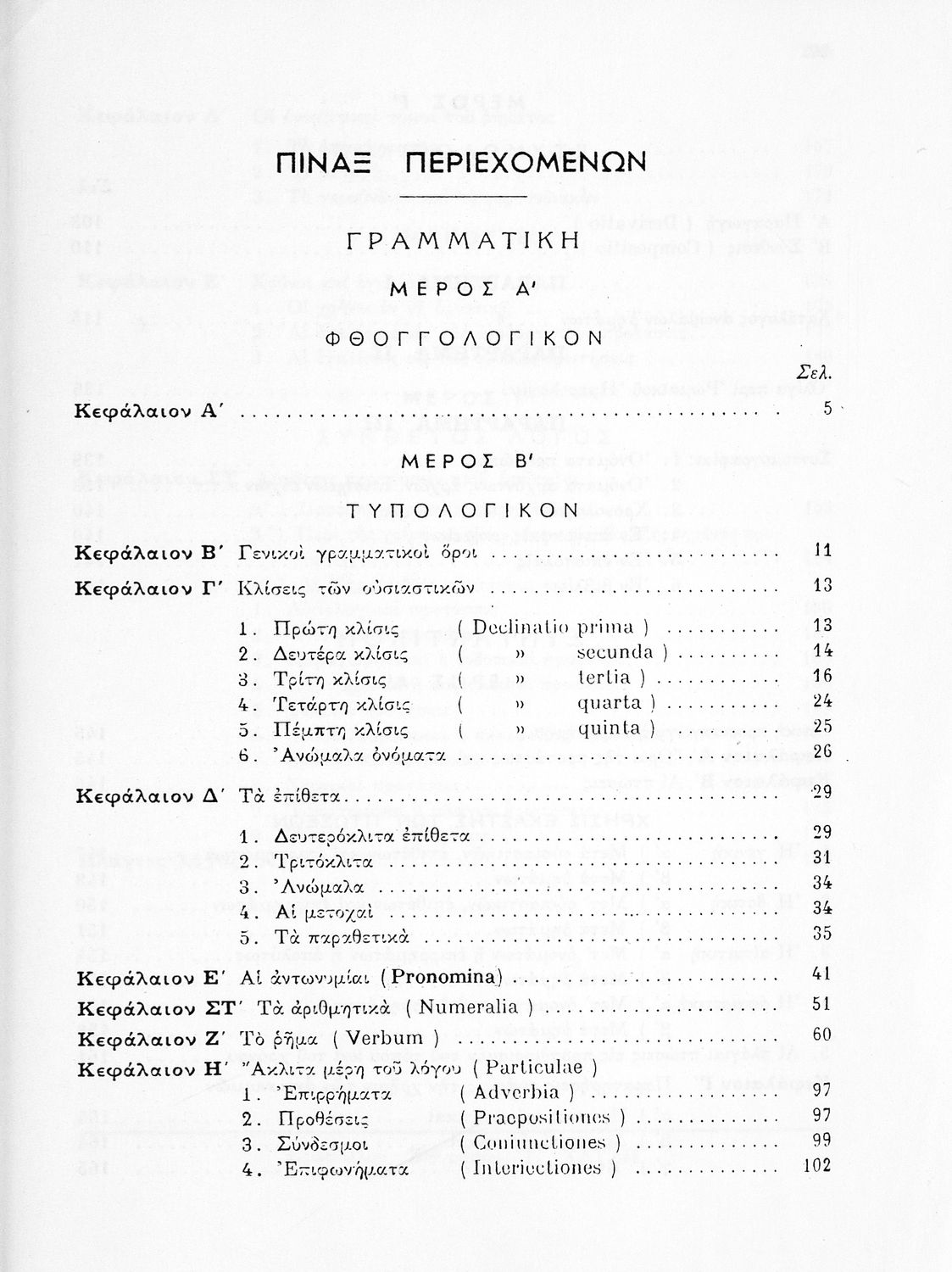 Σχολικό εγχειρίδιο Αρχαίων Ελληνικών Γυμνασίου που περιέχει τους κανόνες γραμματικής και είναι χωρισμένο σε φθογγολογικό, τυπολογικό και ετυμολογικό μέρος. Περιέχει και κατάλογο ανωμάλων ρημάτων.
