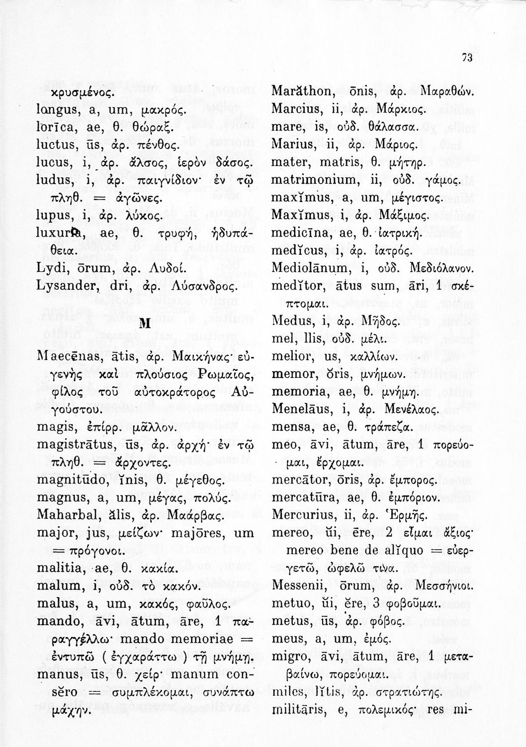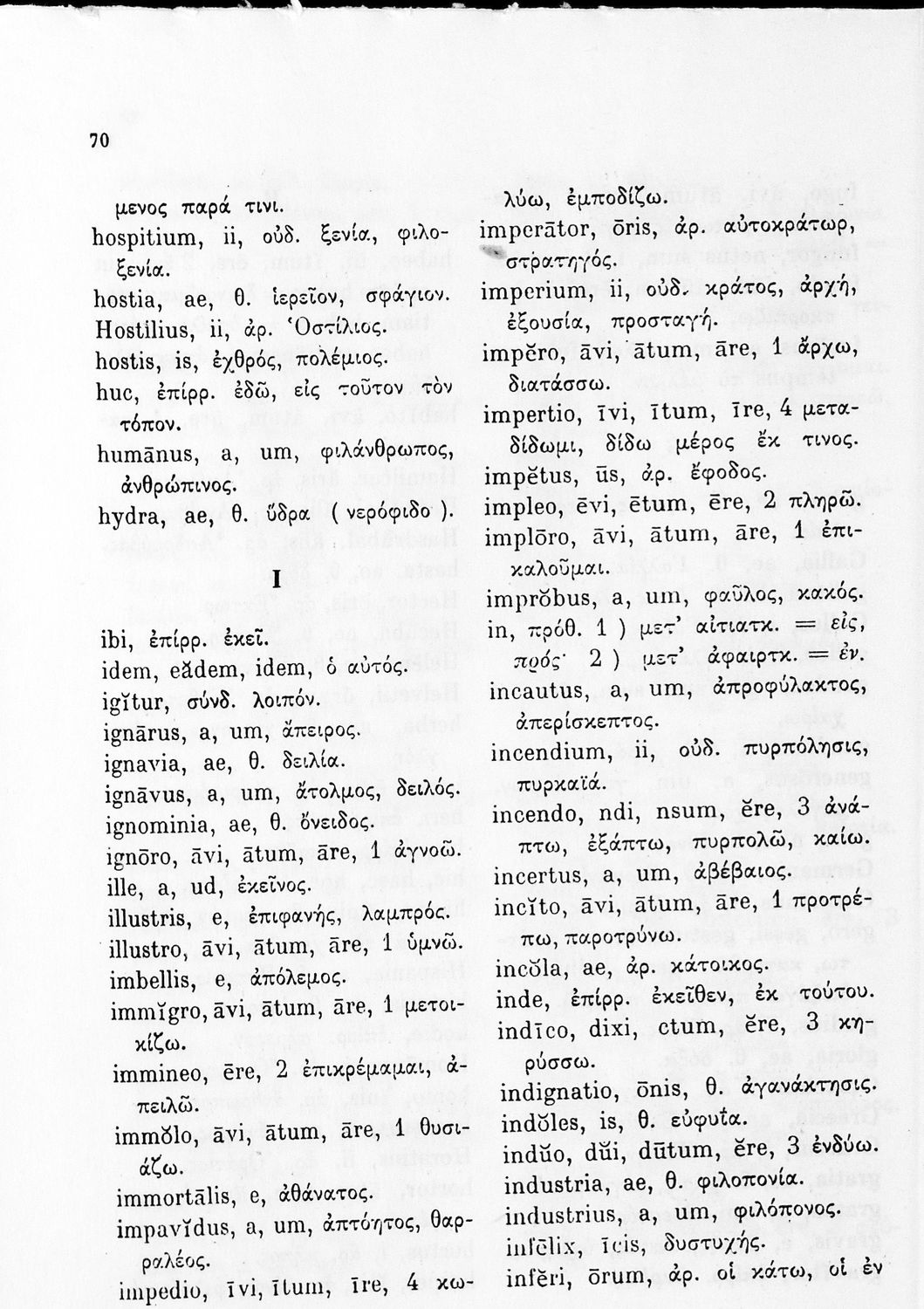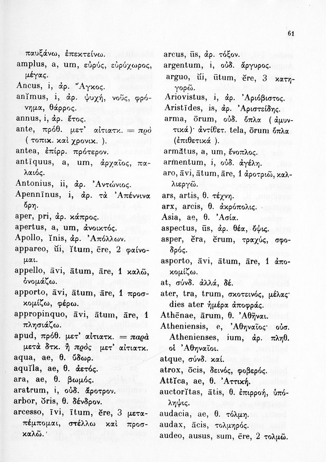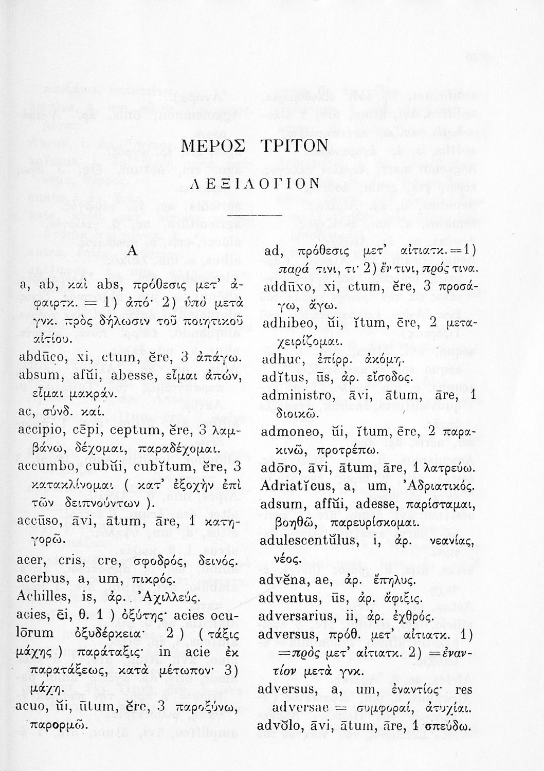 Σχολικό εγχειρίδιο Λατινικών για τη Γ΄ Γυμνασίου που περιέχει 54 κείμενα/περικοπές στα λατινικά, ερμηνευτικά υπομνήματα, λεξιλόγιο και κατάλογο με τα συντακτικά φαινόμενα (αφαιρετική, προθέσεις, σύνδεσμοι) που