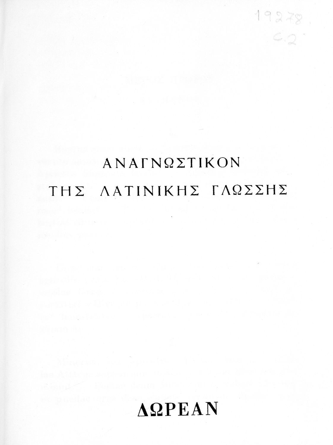 Κωδικός αναγνώρισης: 01-19278b Τίτλος: Αναγνωστικόν της λατινικής γλώσσης Δ΄ Γυμνασίου Συγγραφέας: Κυριάκος Κοσμάς Μέγεθος και υπόστρωμα: Σχολικό εγχειρίδιο, 20εκ., μαλακό εξώφυλλο, 86 σελίδες. |