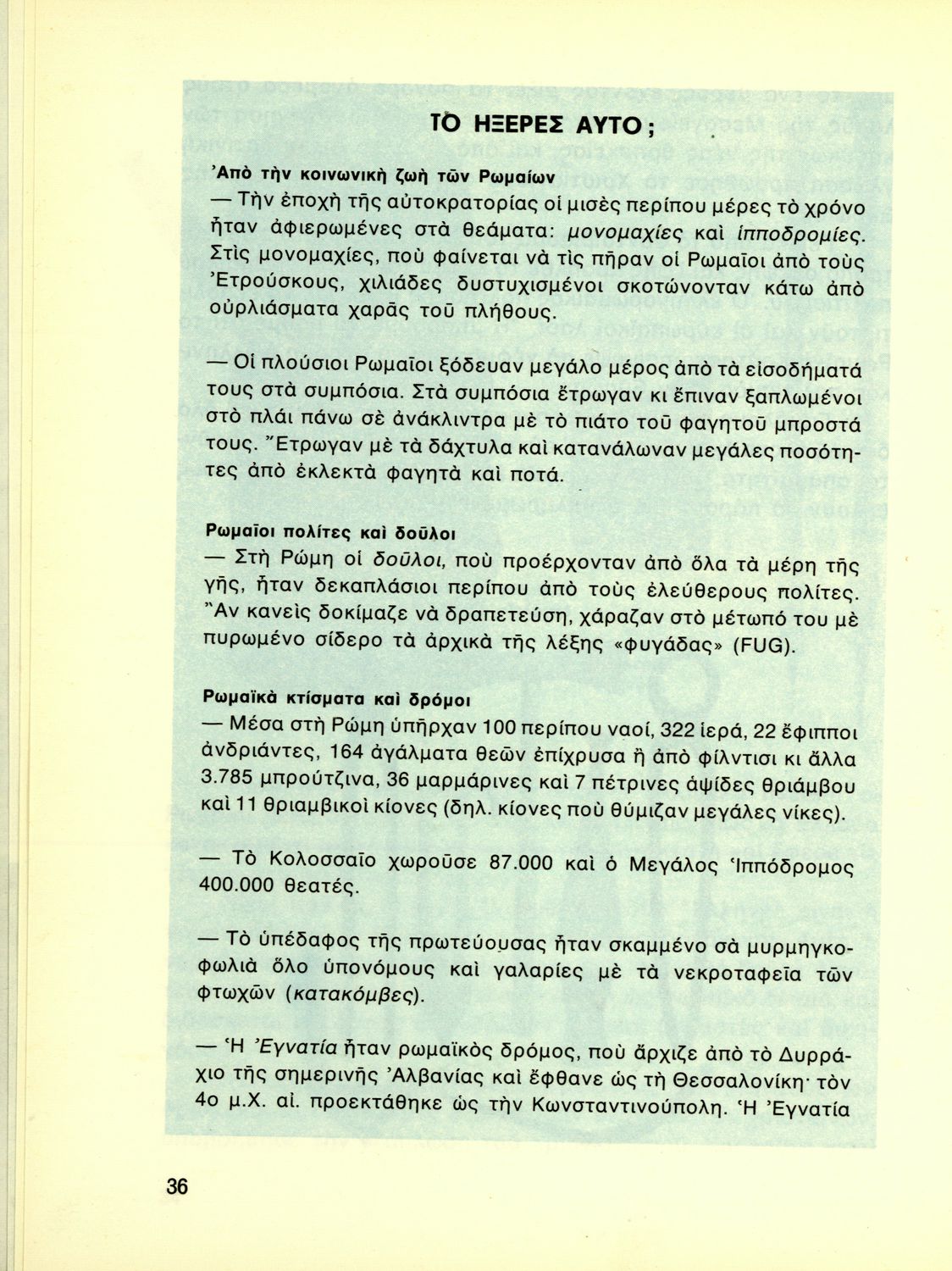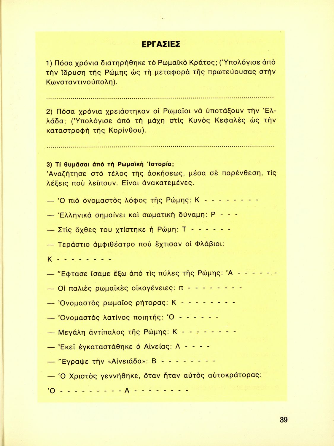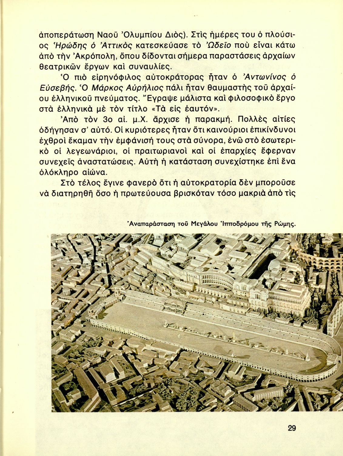 Σχολικό εγχειρίδιο της Ε΄ Δημοτικού για το μάθημα της Ιστορίας. Αναφέρεται στη ρωμαϊκή και Βυζαντινή Αυτοκρατορία. Αναλύεται το έργο και η δράση κάθε αυτοκράτορα τελειώνει με την άλωση και την επικράτηση των Οθωμανών. Στο τέλος αναφέρεται στα γράμματα και τις ανακαλύψεις των νέων χωρών.