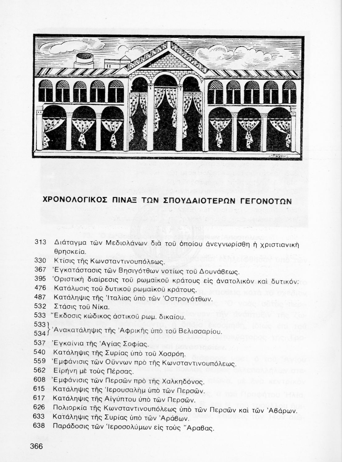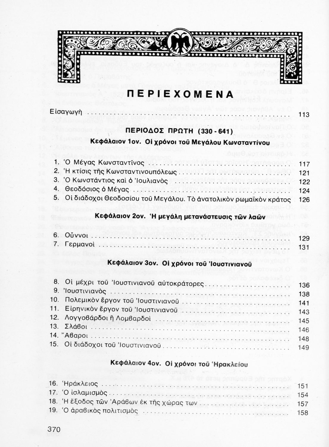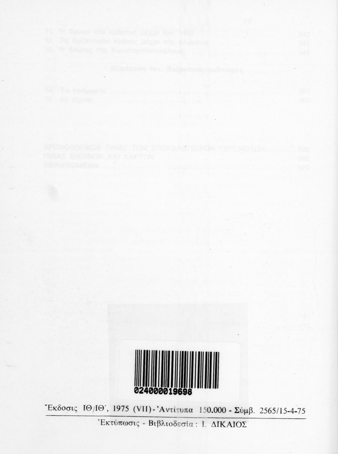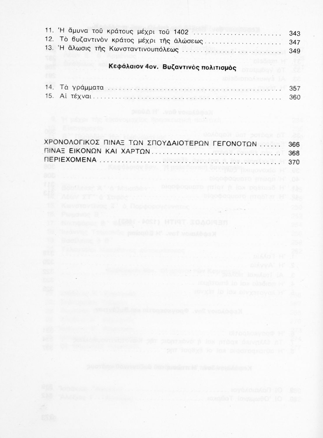 Σχολικό εγχειρίδιο Ιστορίας Β΄ και Ε΄ Γυμνασίου που καλύπτει την περίοδο από την άνοδο του Μ. Κωνσταντίνου στο θρόνο μέχρι και την άλωση της Κωνσταντινούπολης. Παρουσιάζει και τα πνευματικά και καλλιτεχνικά ρεύματα της περιόδου.