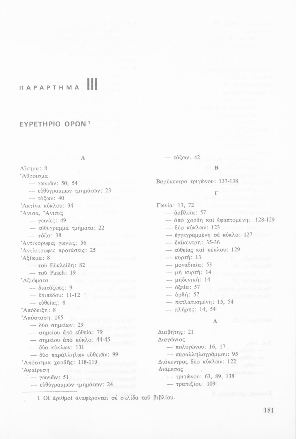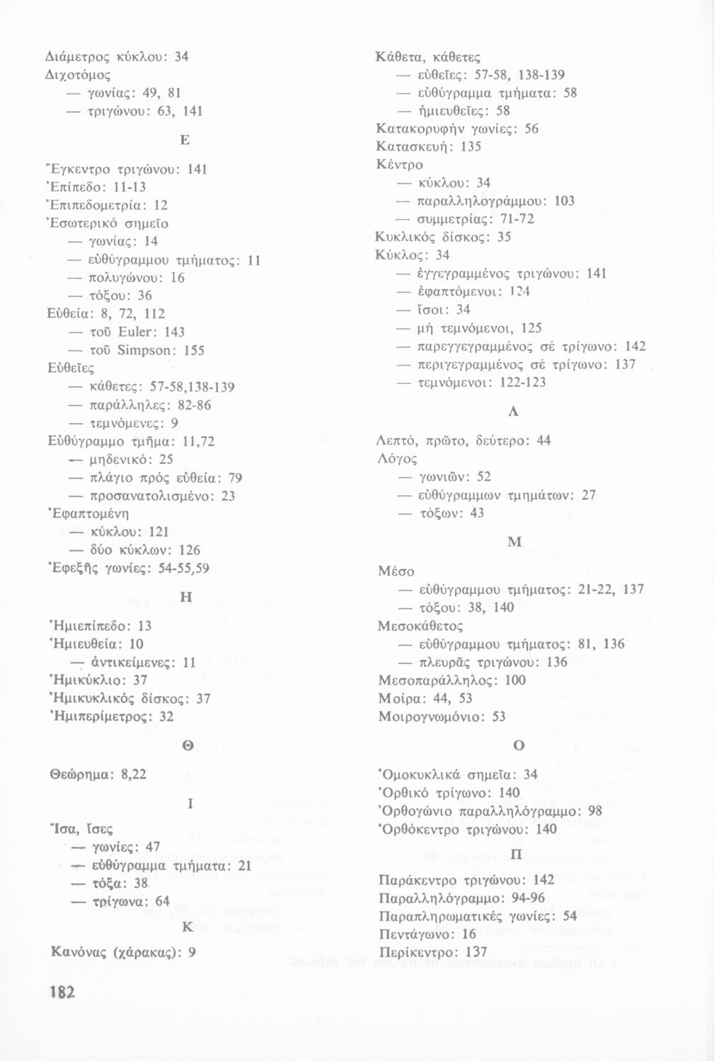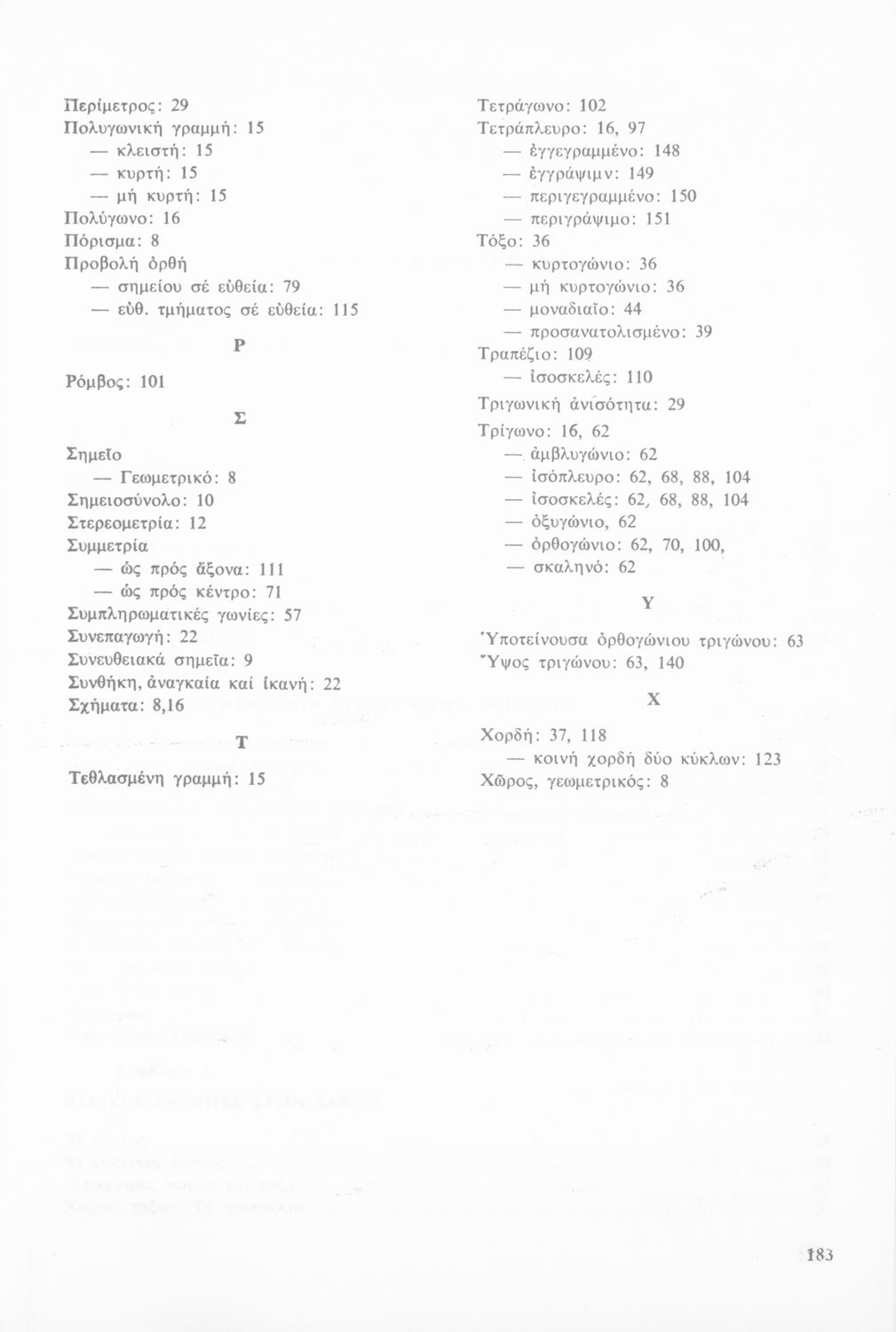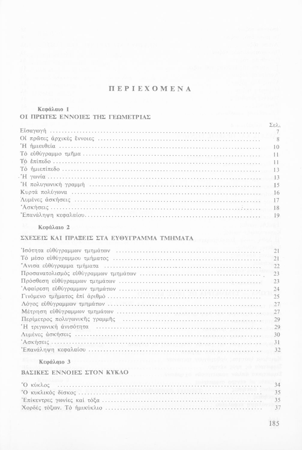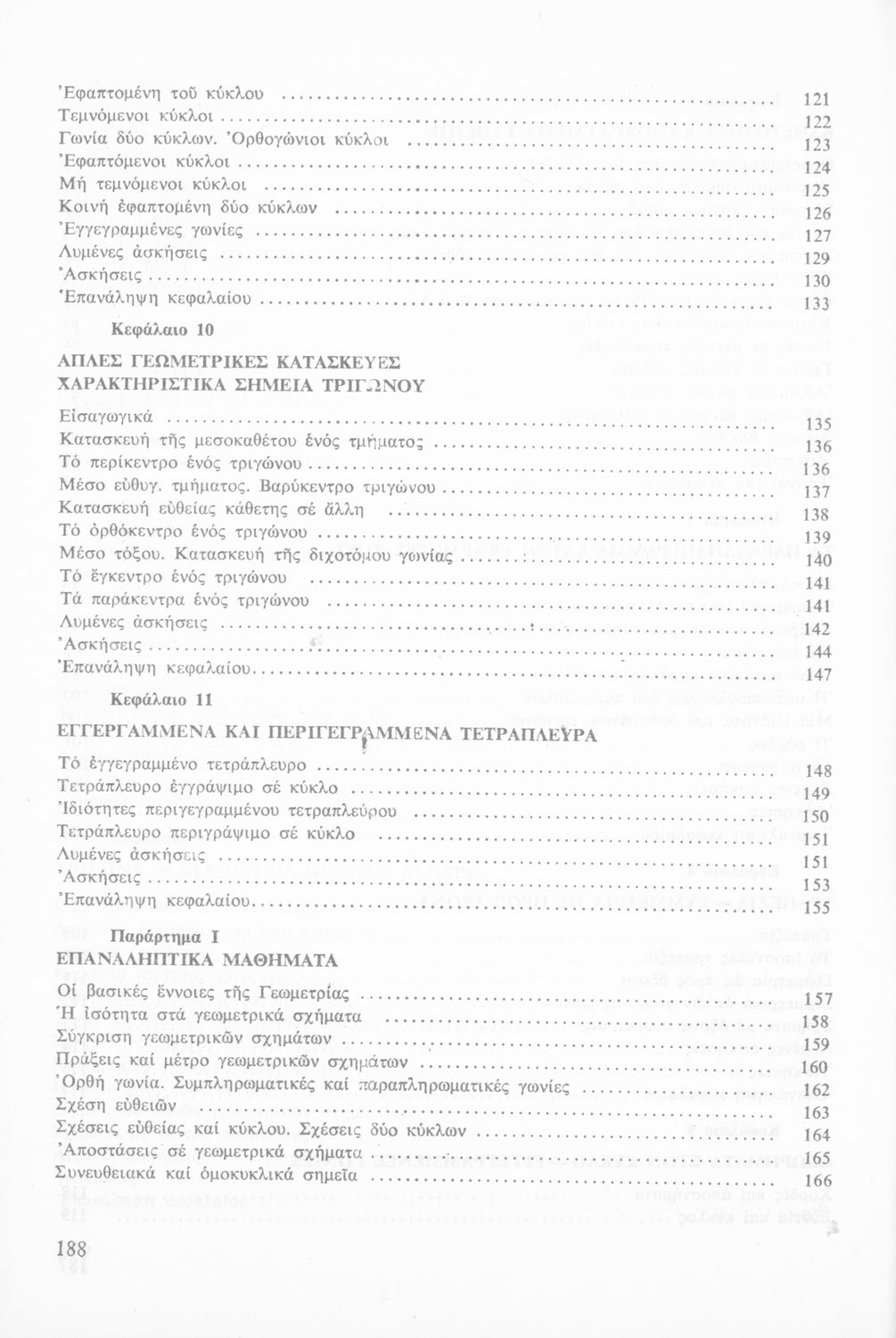 Σχολικό εγχειρίδιο Γεωμετρίας Γ΄ Γυμνασίου χωρισμένο σε θεωρήματα, λυμένες ασκήσεις, ασκήσεις και επαναλήψεις κεφαλαίου. Περιέχει ένα παράρτημα με επαναληπτικά μαθήματα και ένα με ευρετήριο όρων.