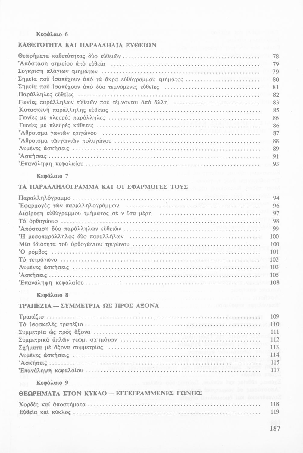 Σχολικό εγχειρίδιο Γεωμετρίας Α΄ Λυκείου χωρισμένο σε θεωρήματα, λυμένες ασκήσεις, ασκήσεις και επαναλήψεις κεφαλαίου. Περιέχει ένα παράρτημα με επαναληπτικά μαθήματα και ένα με ευρετήριο όρων.