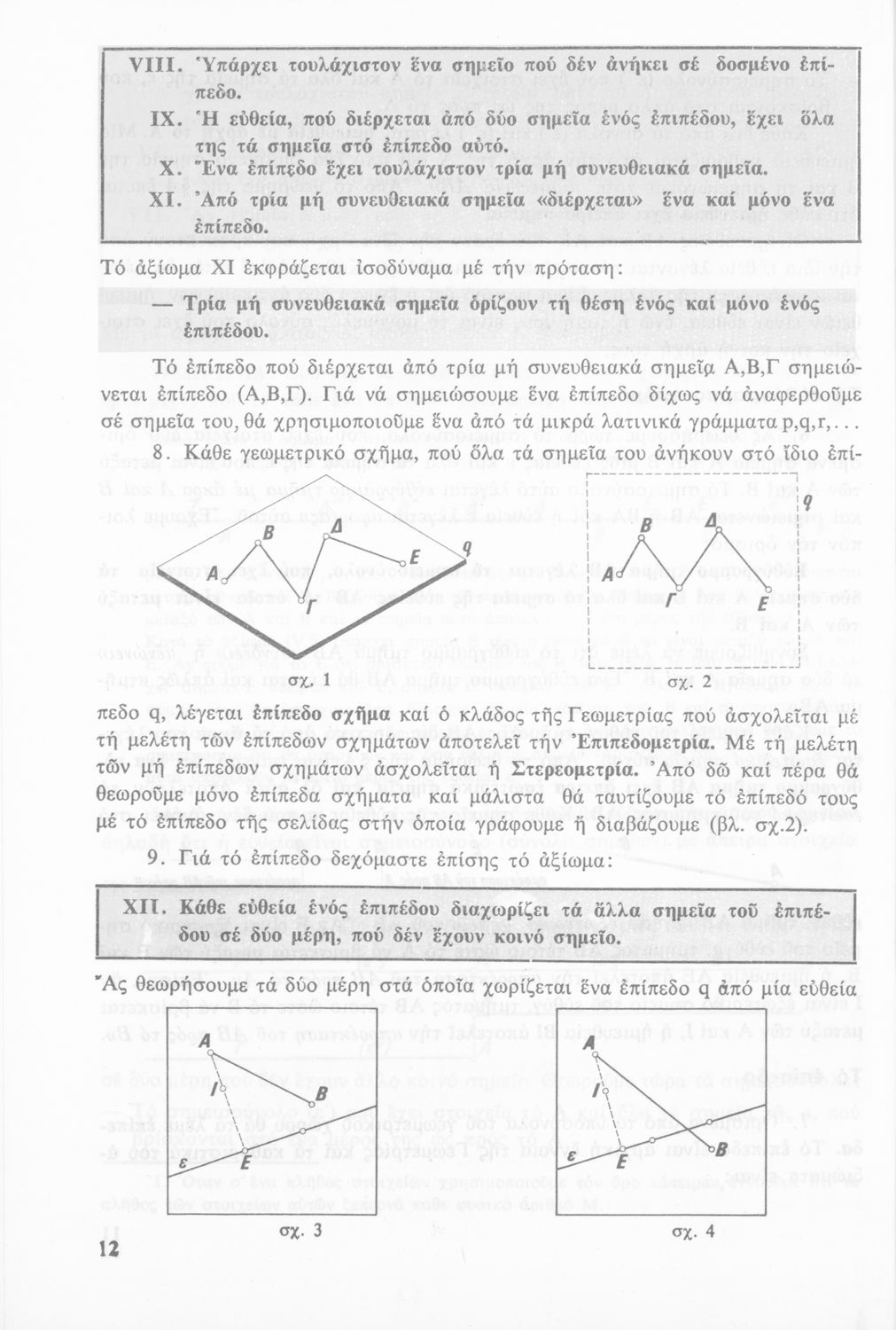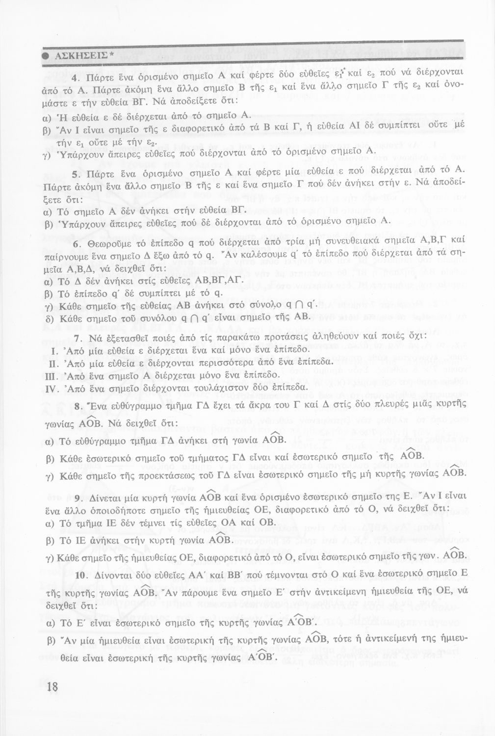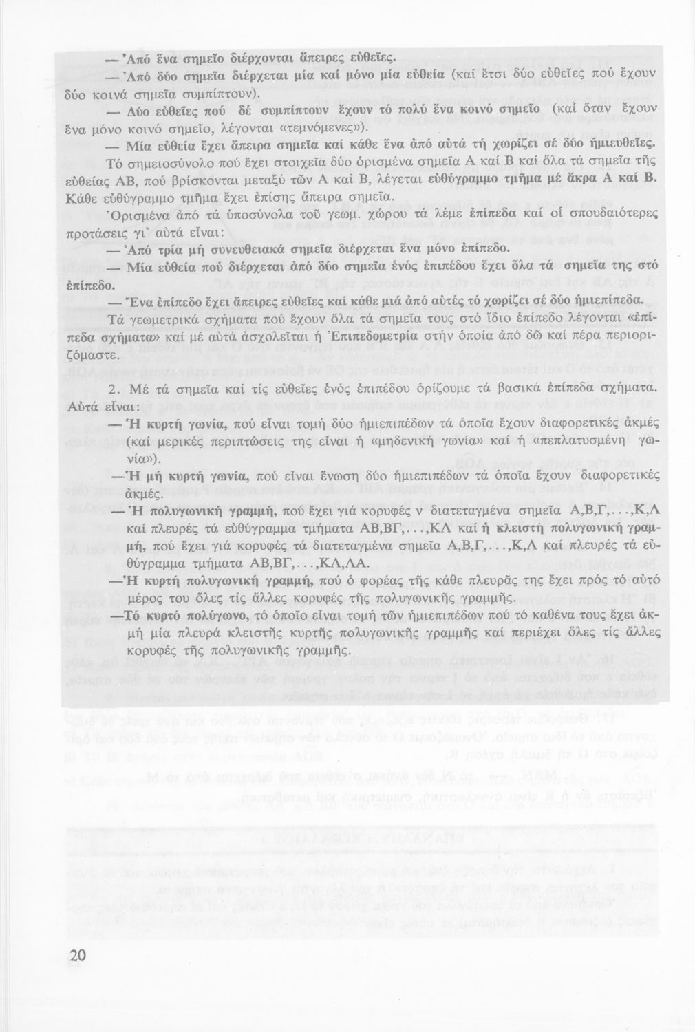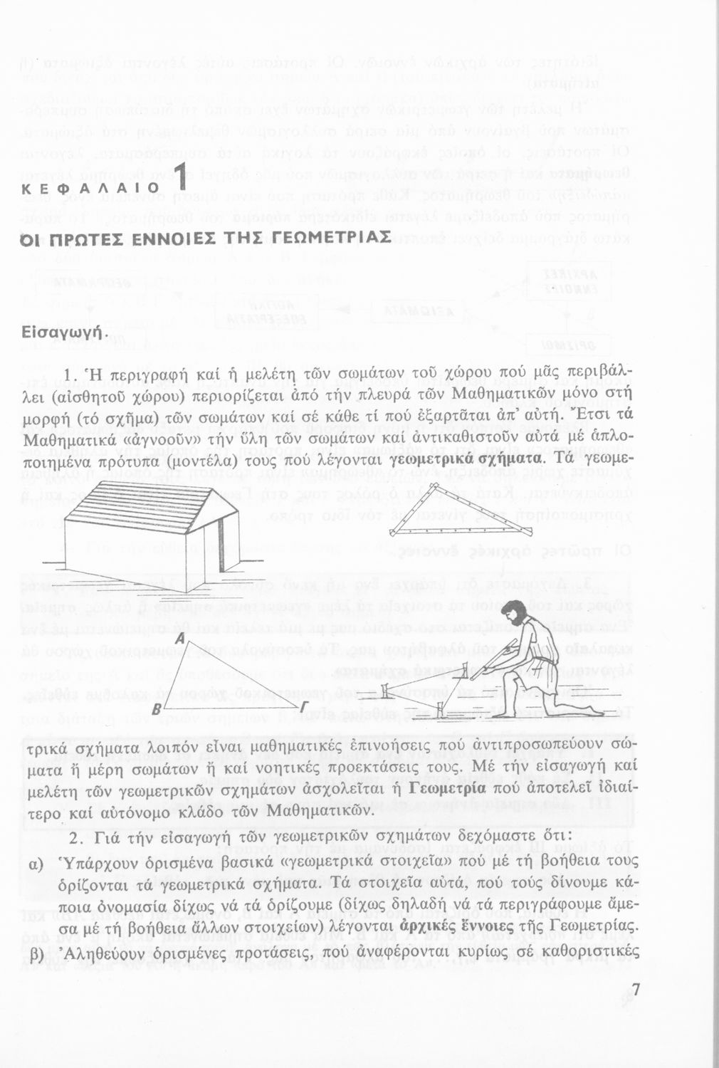 Σχολικό εγχειρίδιο Γεωμετρίας Α΄ Λυκείου χωρισμένο σε θεωρήματα, λυμένες ασκήσεις, ασκήσεις και επαναλήψεις κεφαλαίου. Περιέχει ένα παράρτημα με επαναληπτικά μαθήματα και ένα με ευρετήριο όρων.