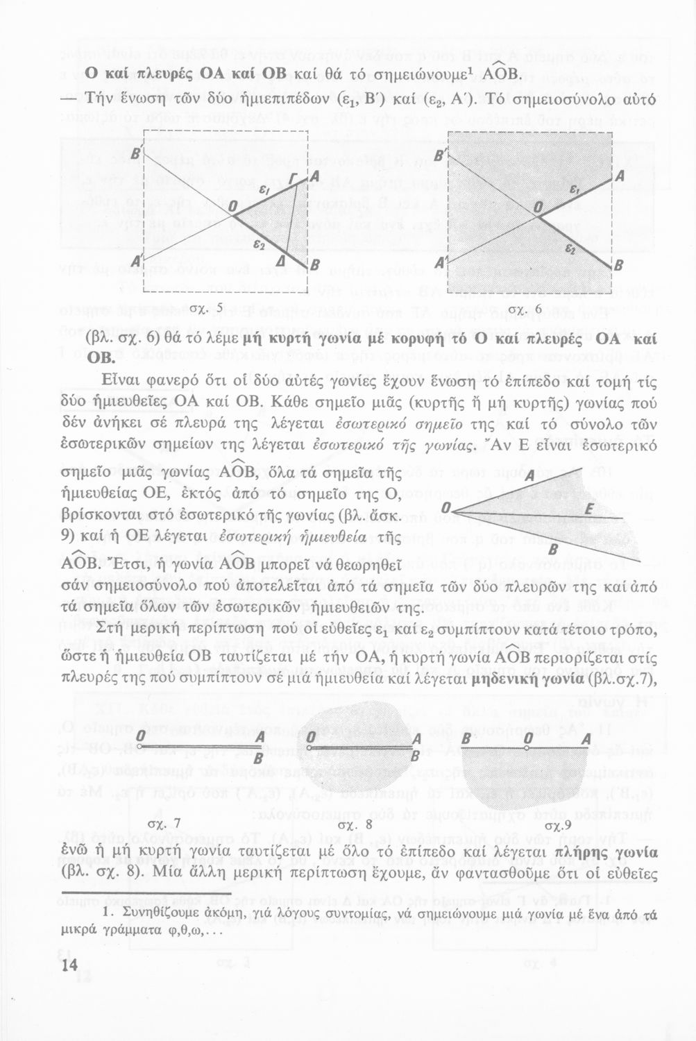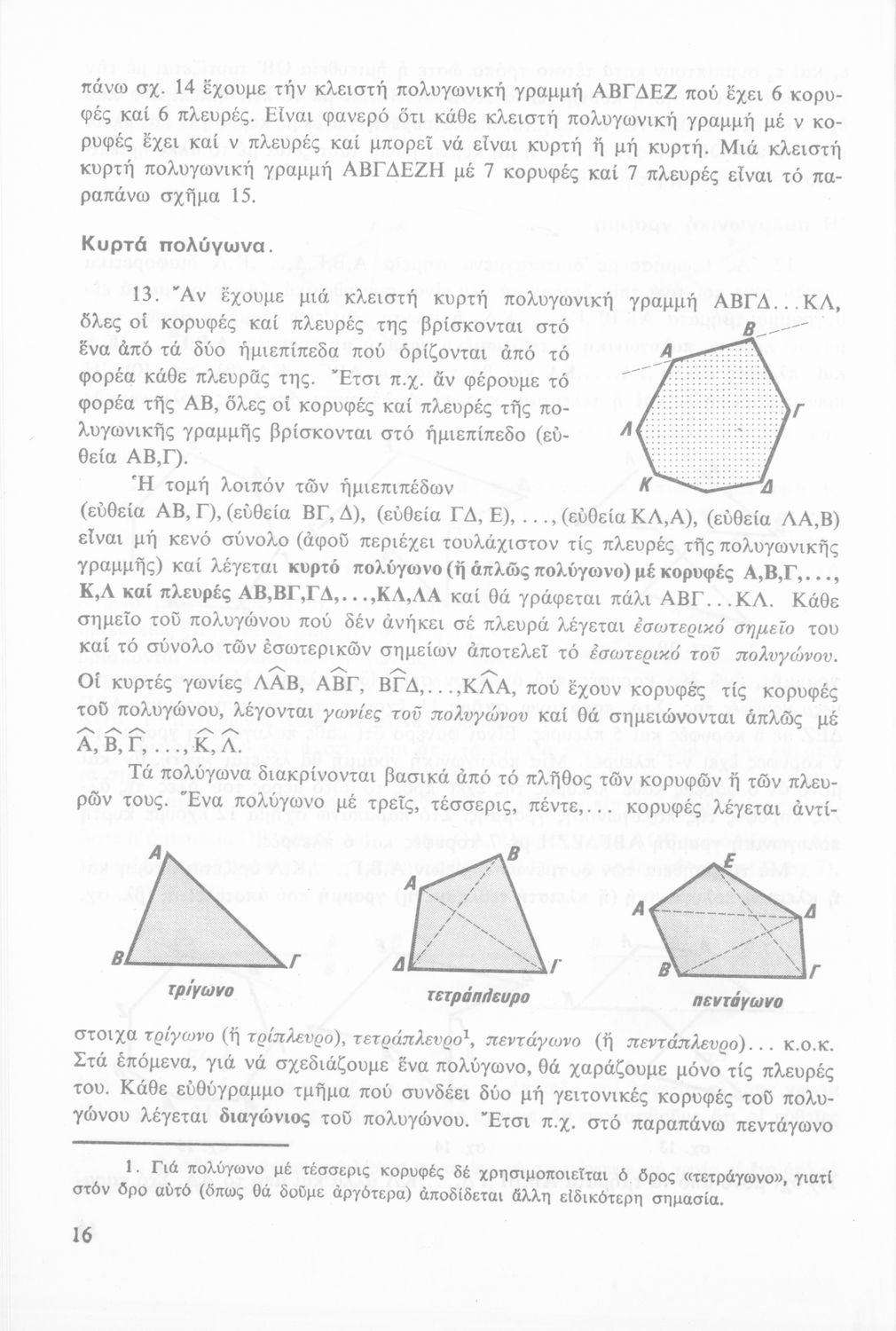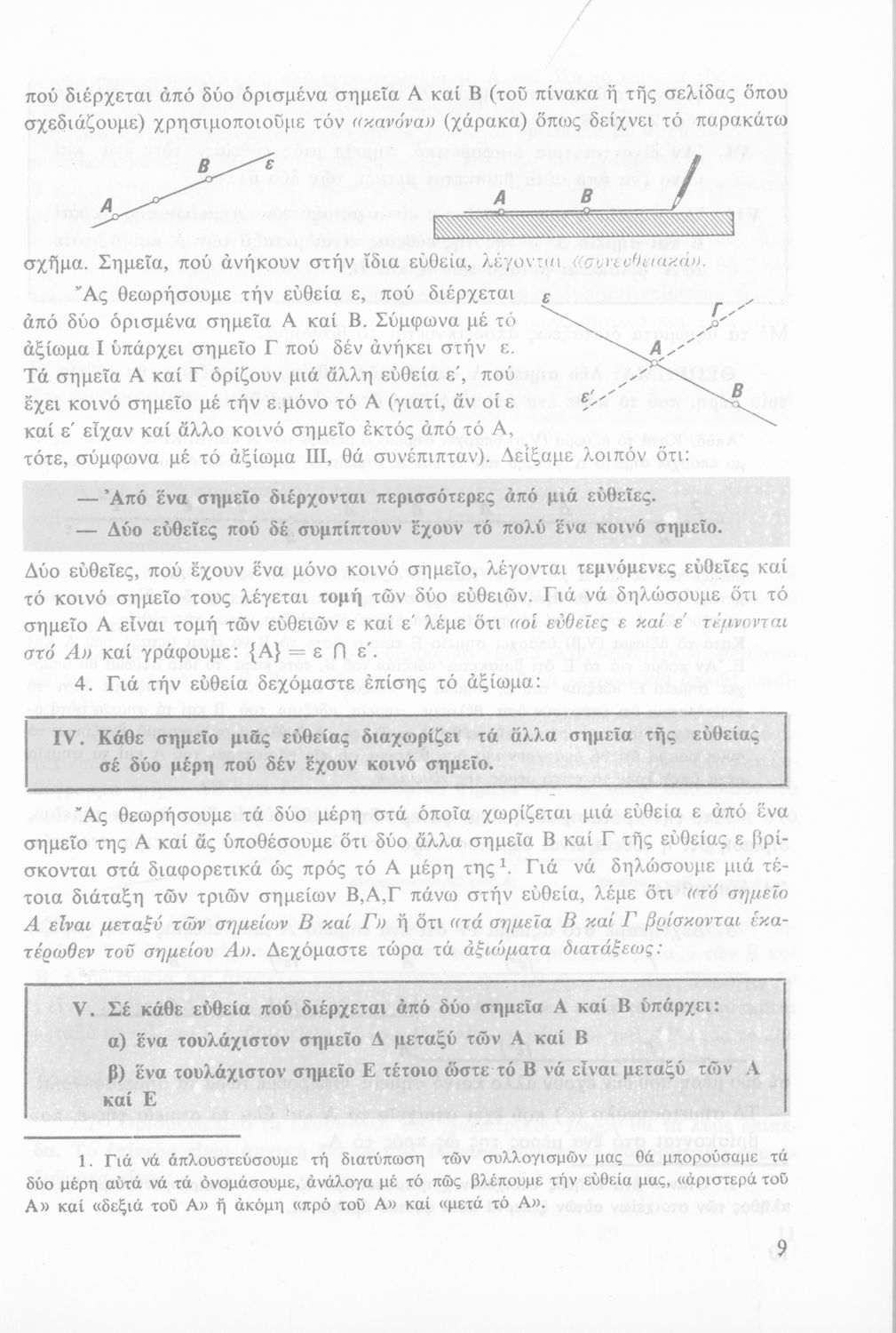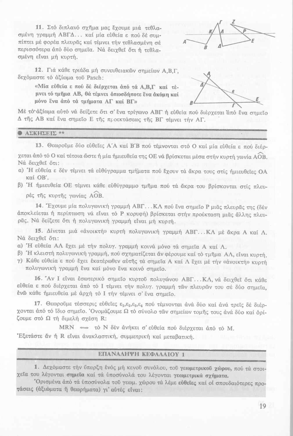 Σχολικό εγχειρίδιο Γεωμετρίας Α΄ Λυκείου χωρισμένο σε θεωρήματα, λυμένες ασκήσεις, ασκήσεις και επαναλήψεις κεφαλαίου. Περιέχει ένα παράρτημα με επαναληπτικά μαθήματα και ένα με ευρετήριο όρων.
