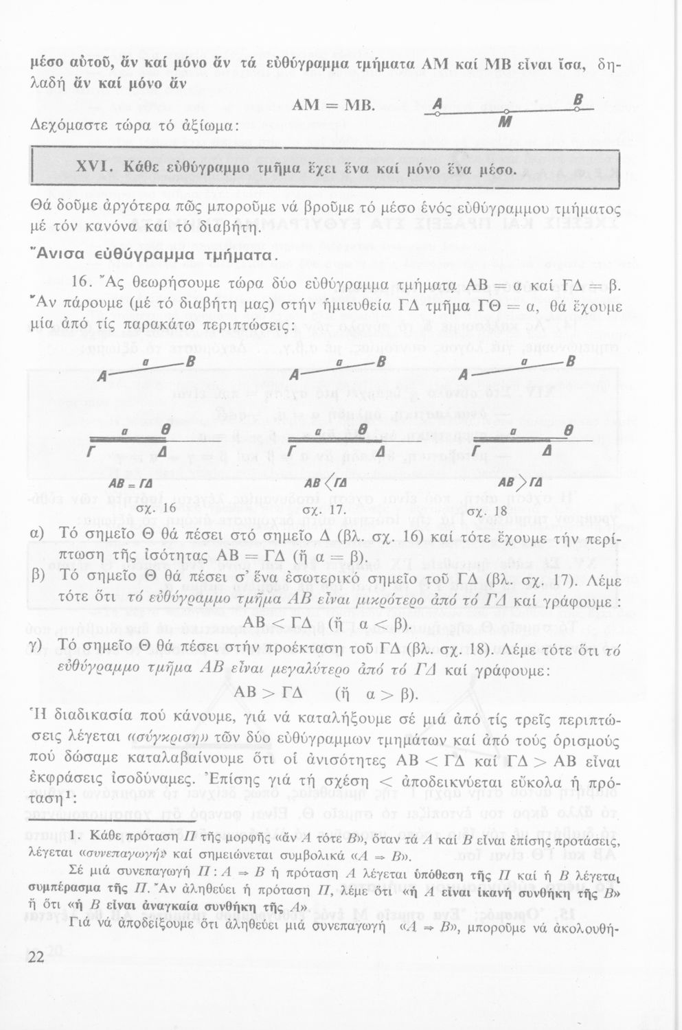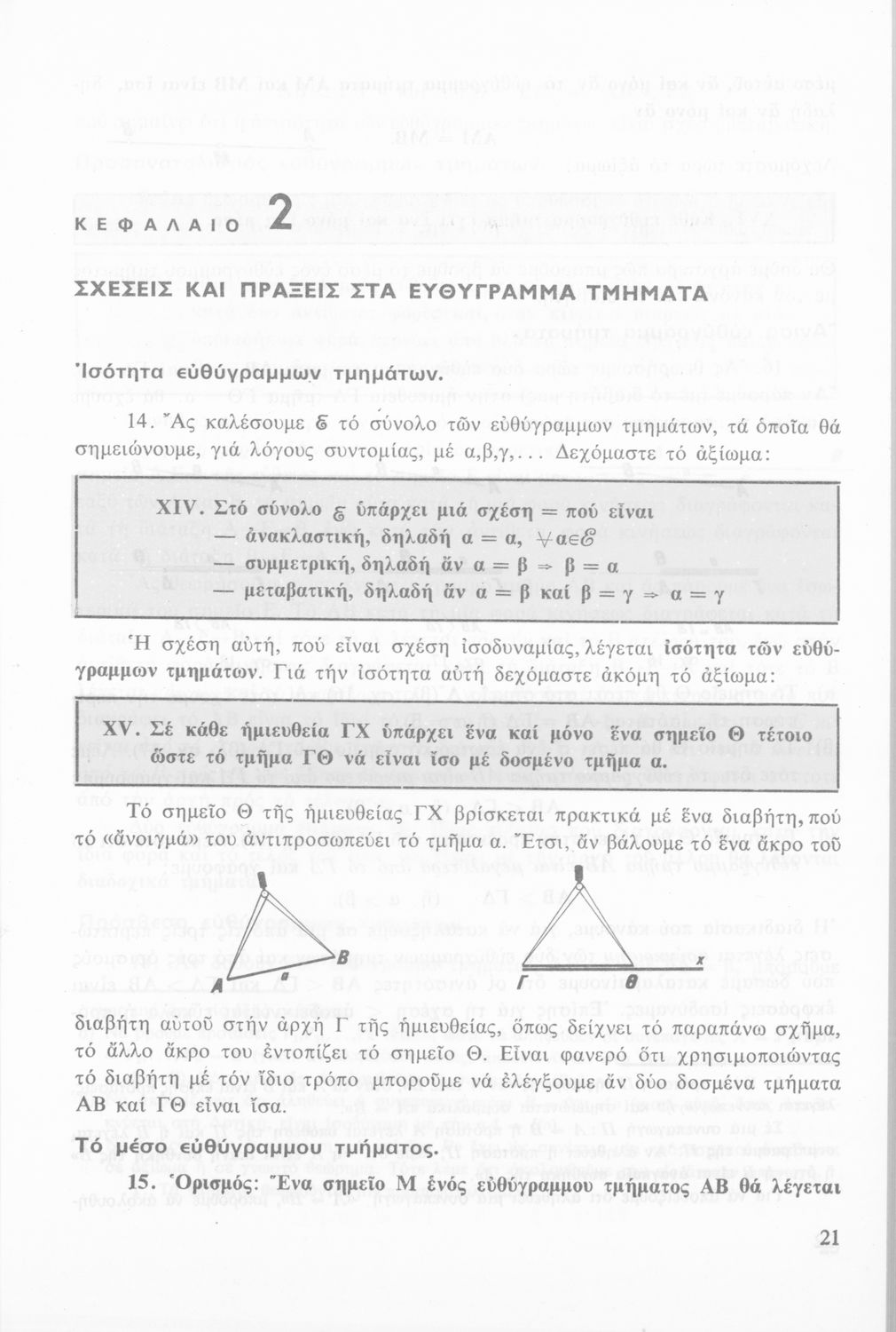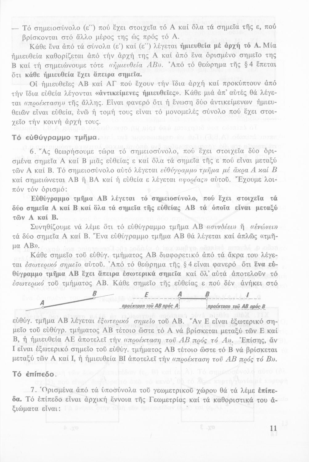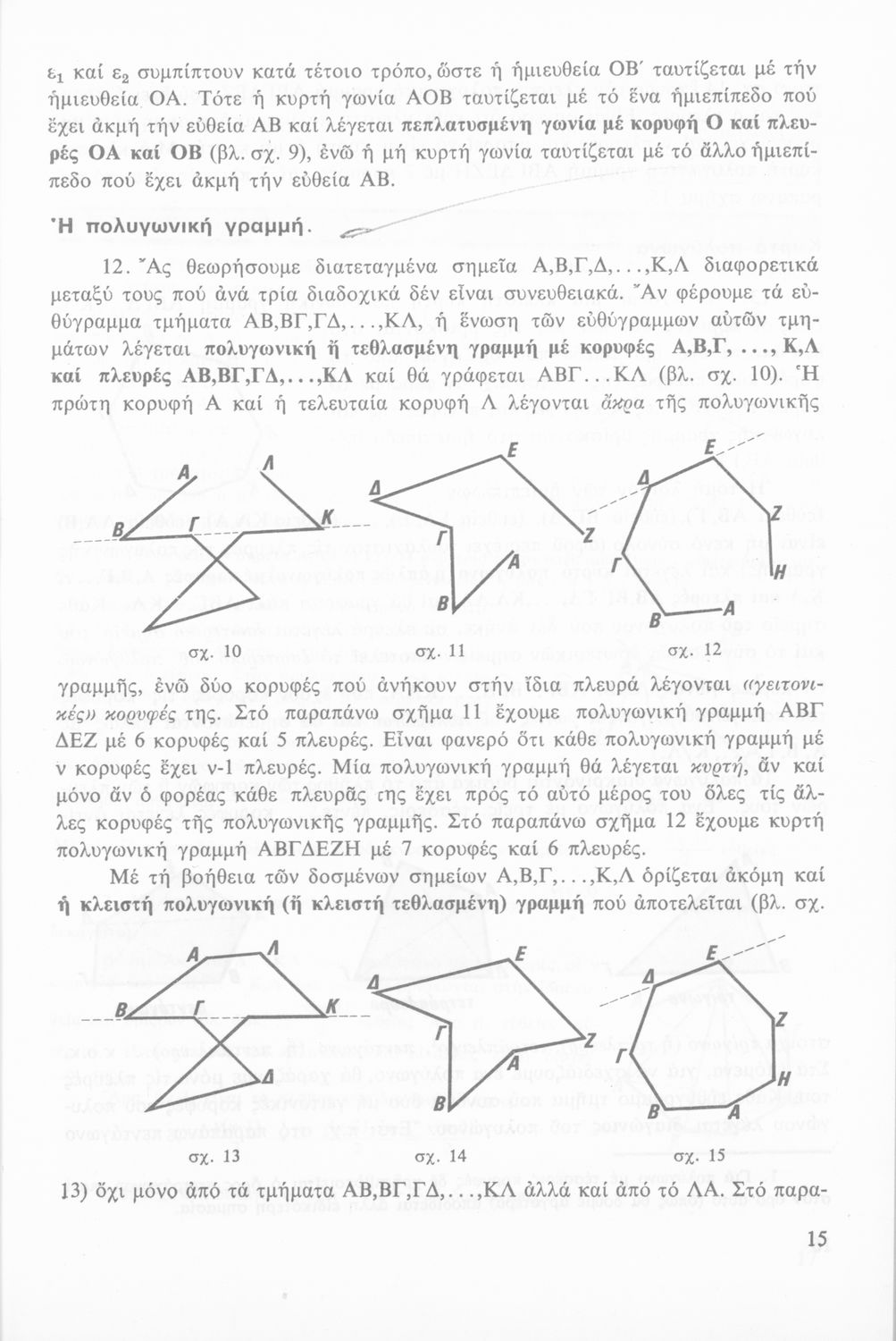 Σχολικό εγχειρίδιο Γεωμετρίας Α΄ Λυκείου χωρισμένο σε θεωρήματα, λυμένες ασκήσεις, ασκήσεις και επαναλήψεις κεφαλαίου. Περιέχει ένα παράρτημα με επαναληπτικά μαθήματα και ένα με ευρετήριο όρων.
