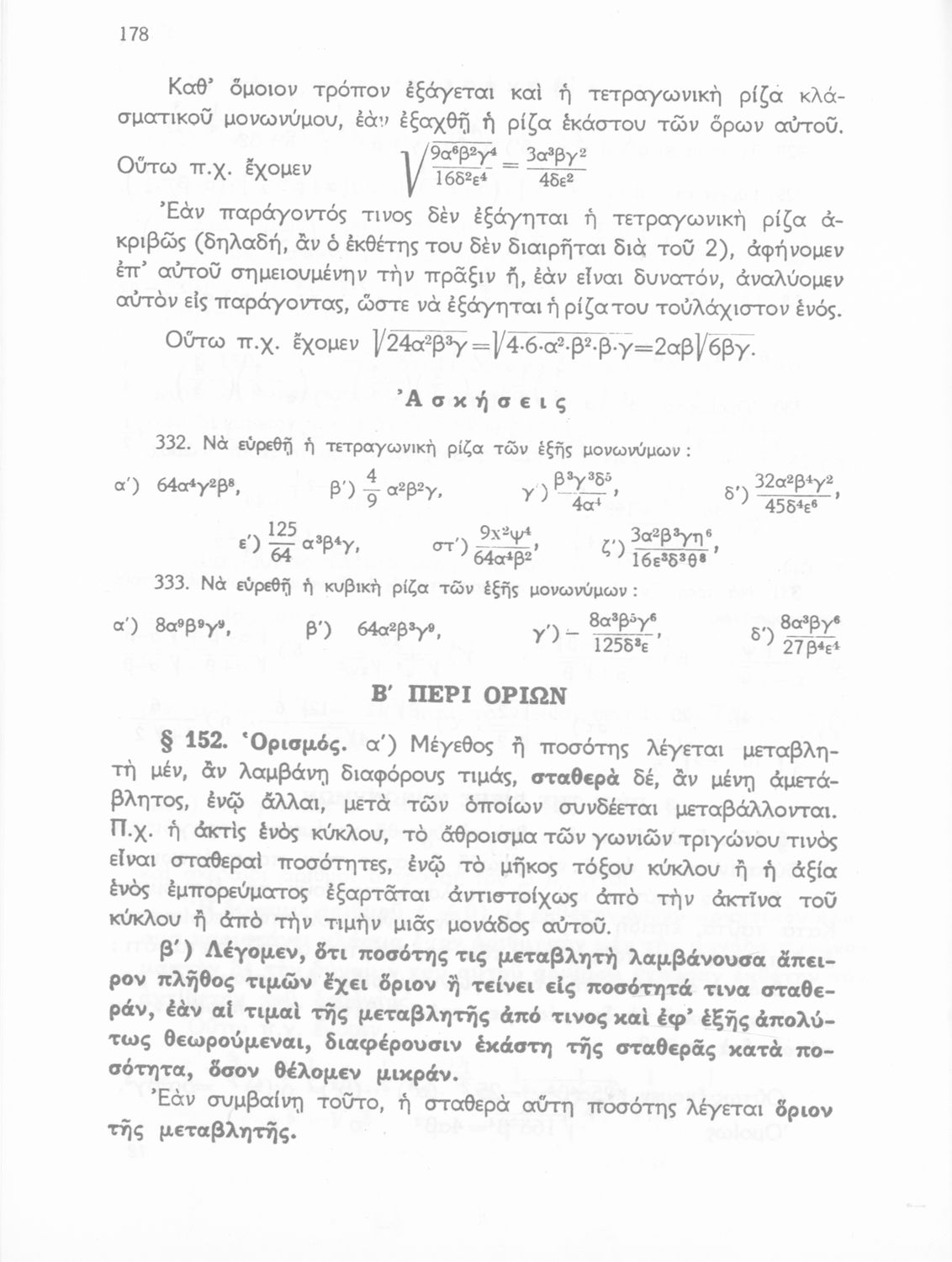 Παρουσίαση περιεχομένου: Σχολικό εγχειρίδιο Μαθηματικών Δ', Ε' και ΣΤ΄ τάξεων του Γυμνασίου που παρουσιάζει τις βασικές έννοιες της Άλγεβρας, εστιάζει τις ιδιότητες των αριθμών και περιέχει ασκήσεις εξισώσεων, λογαρίθμων και παραγώγων.