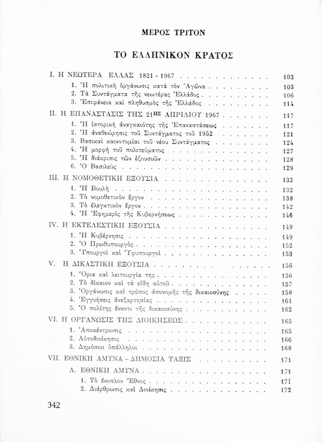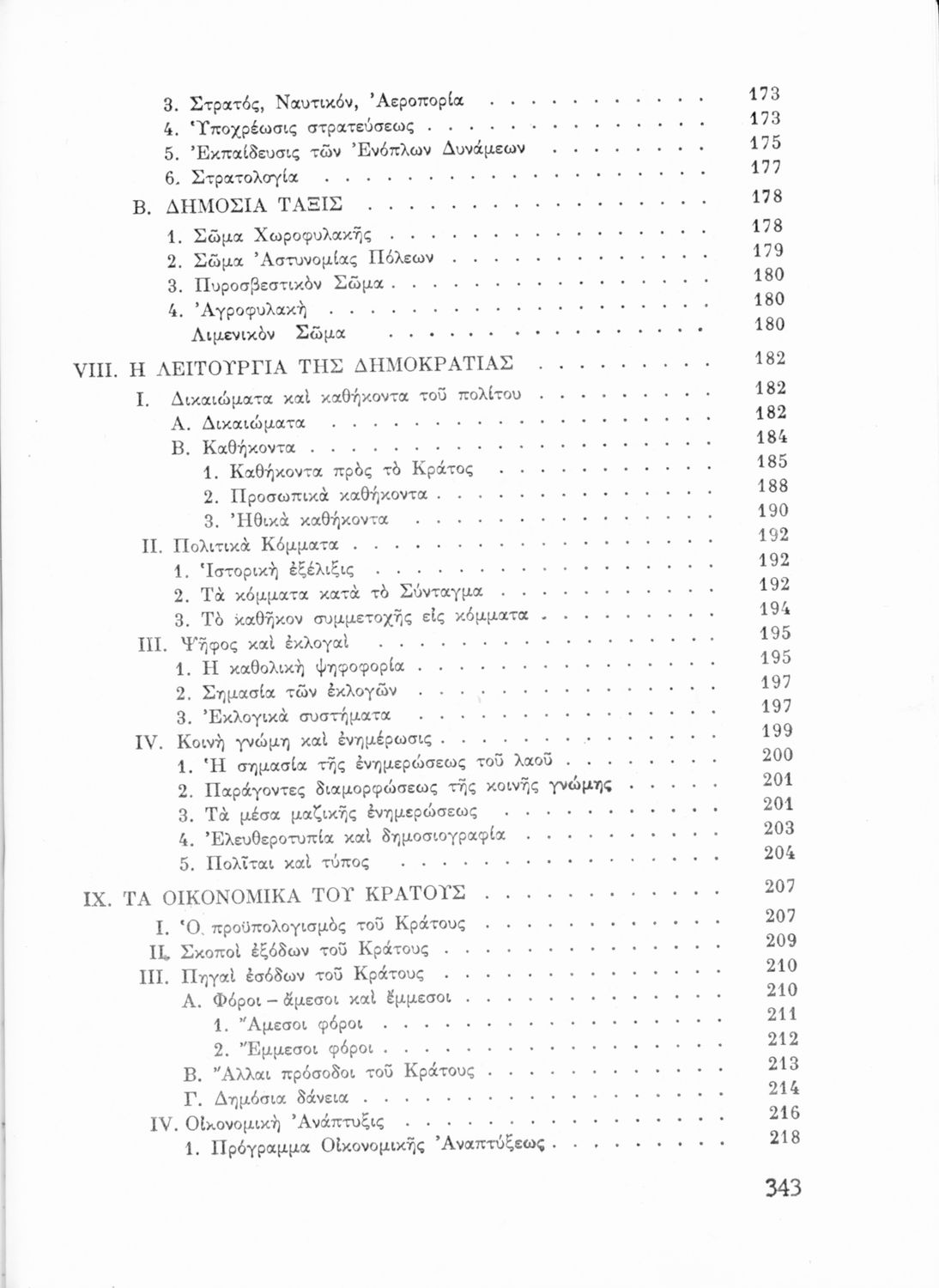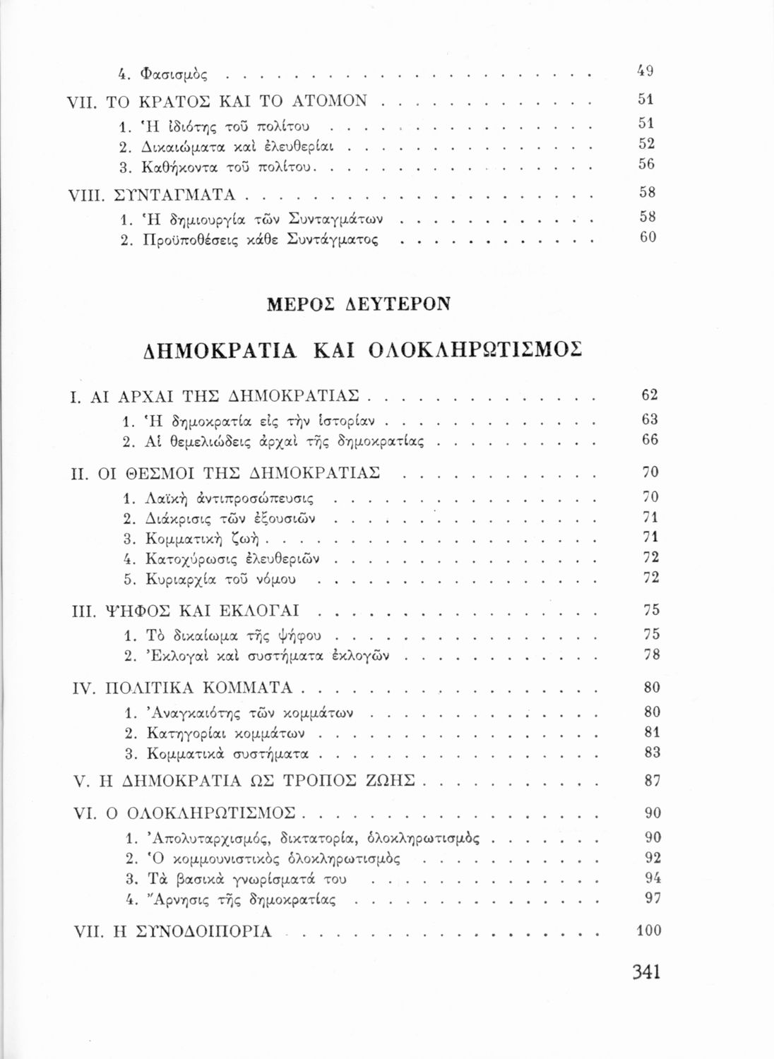 Σχολικό εγχειρίδιο της Γ΄ Γυμνασίου για το μάθημα της Πολιτικής Αγωγής. Αναφέρεται στις γενικές έννοιες του δικαίου, τις μορφές των πολιτευμάτων, τους θεσμούς, το διαχωρισμό των εξουσιών. Συνεχίζει με τη διοίκηση και τις εξουσίες στο Ελληνικό Κράτος. Έπειτα παρουσιάζει τα οικονομικά του κράτους και τους διάφορους τομείς της κοινωνικής ζωής. Αναφέρει την απειλή του Κομμουνισμού και επισημαίνει τα εθνικά σύμβολα. Τέλος γίνεται αναφορά στους Διεθνείς Οργανισμούς. Σκοπός του μαθήματος είναι να αποκτήσουν οι μαθητές ως πολίτες ειδικές αναμορφωμένες στα κοινά γνώσεις, καθώς και την καλλιέργειά της εθνικής συνείδησής.