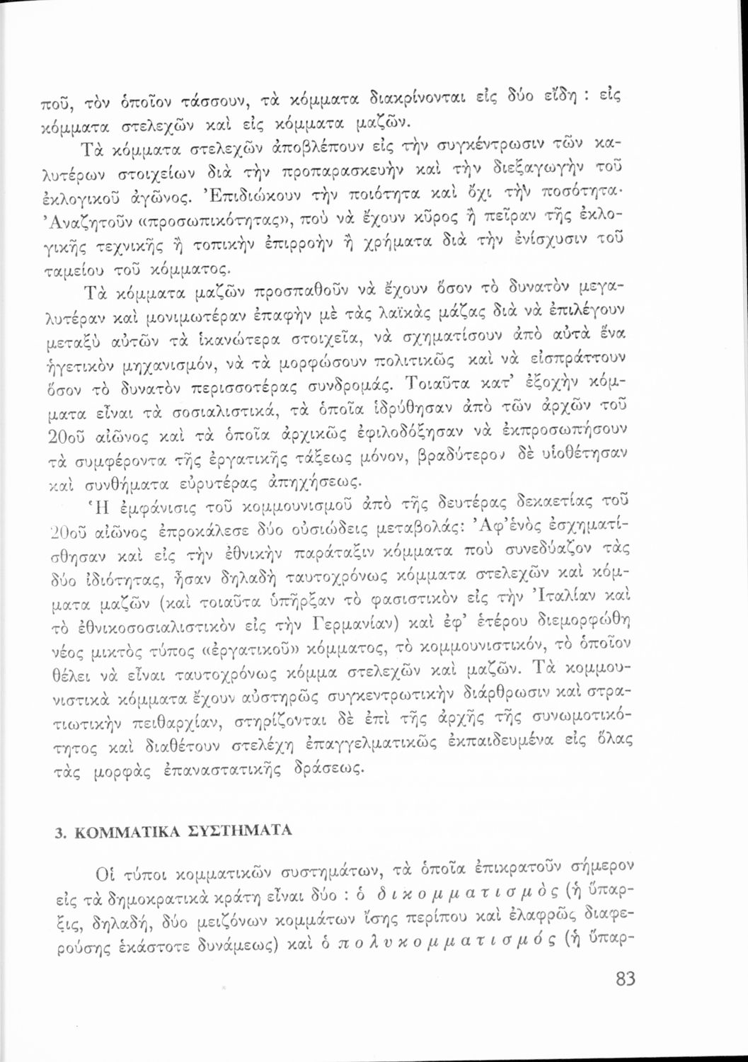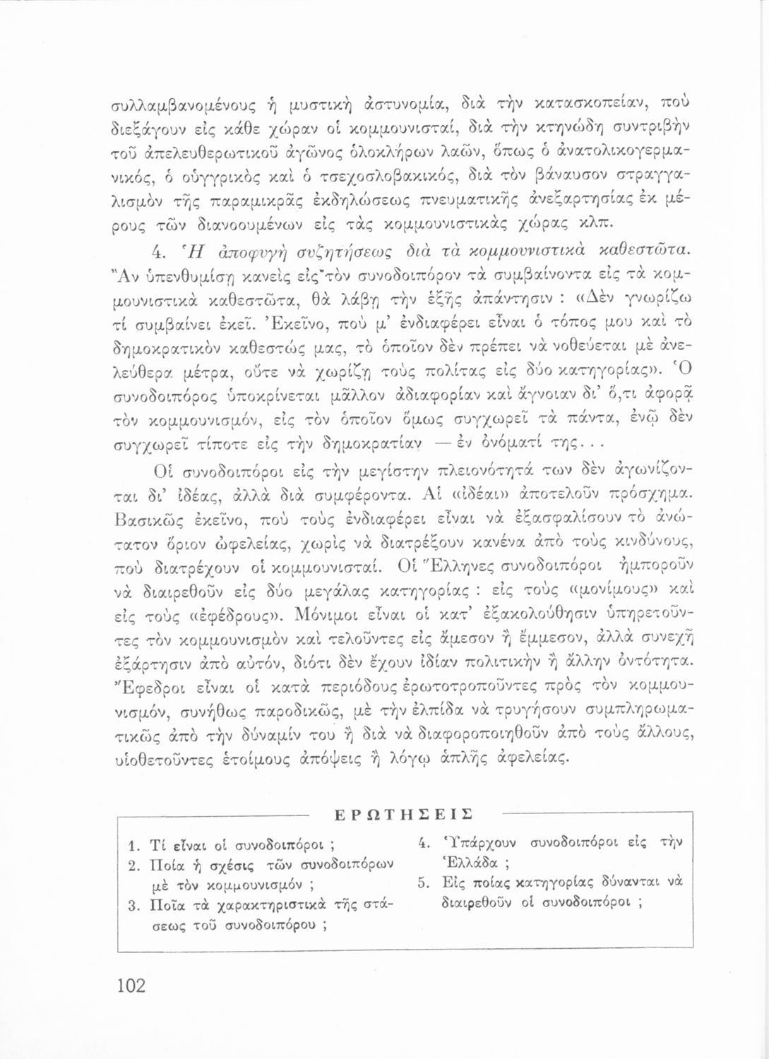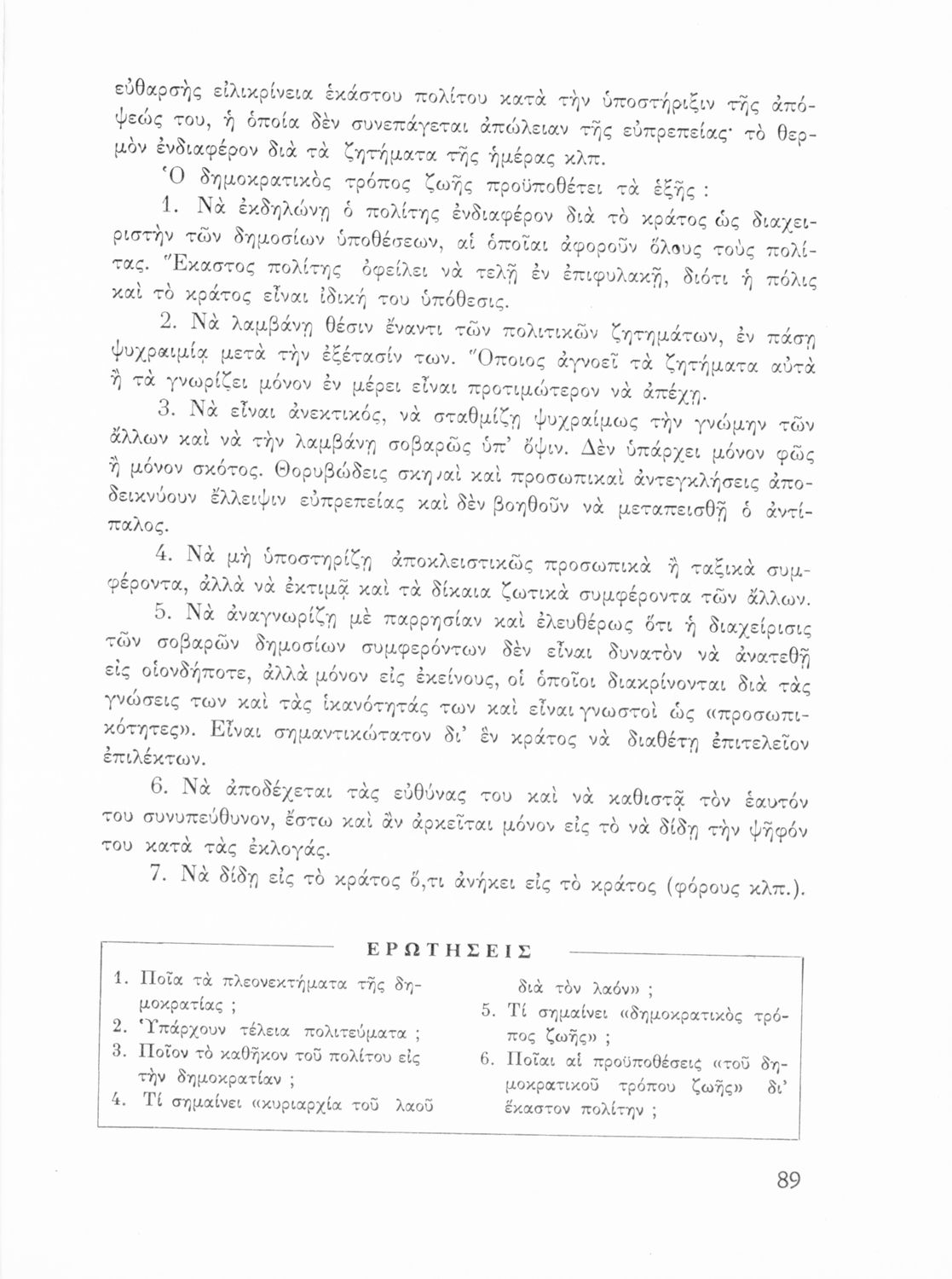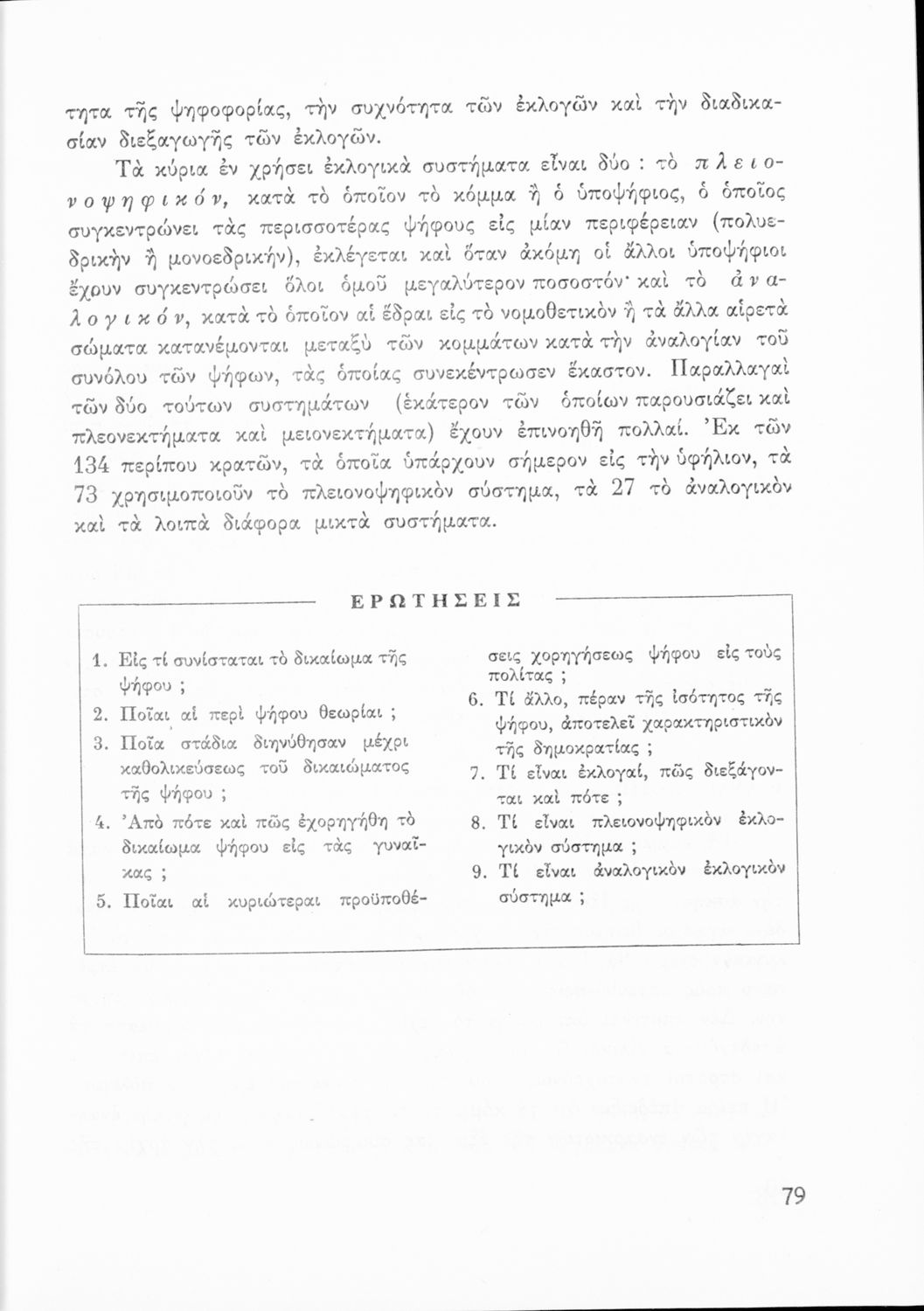 Σχολικό εγχειρίδιο της Γ΄ Γυμνασίου για το μάθημα της Πολιτικής Αγωγής. Αναφέρεται στις γενικές έννοιες του δικαίου, τις μορφές των πολιτευμάτων, τους θεσμούς, το διαχωρισμό των εξουσιών. Συνεχίζει με τη διοίκηση και τις εξουσίες στο Ελληνικό Κράτος. Έπειτα παρουσιάζει τα οικονομικά του κράτους και τους διάφορους τομείς της κοινωνικής ζωής. Αναφέρει την απειλή του Κομμουνισμού και επισημαίνει τα εθνικά σύμβολα. Τέλος γίνεται αναφορά στους Διεθνείς Οργανισμούς. Σκοπός του μαθήματος είναι να αποκτήσουν οι μαθητές ως πολίτες ειδικές αναμορφωμένες στα κοινά γνώσεις, καθώς και την καλλιέργειά της εθνικής συνείδησής.