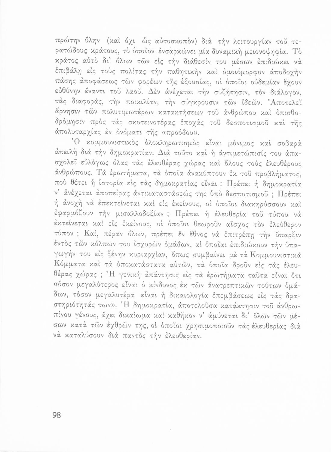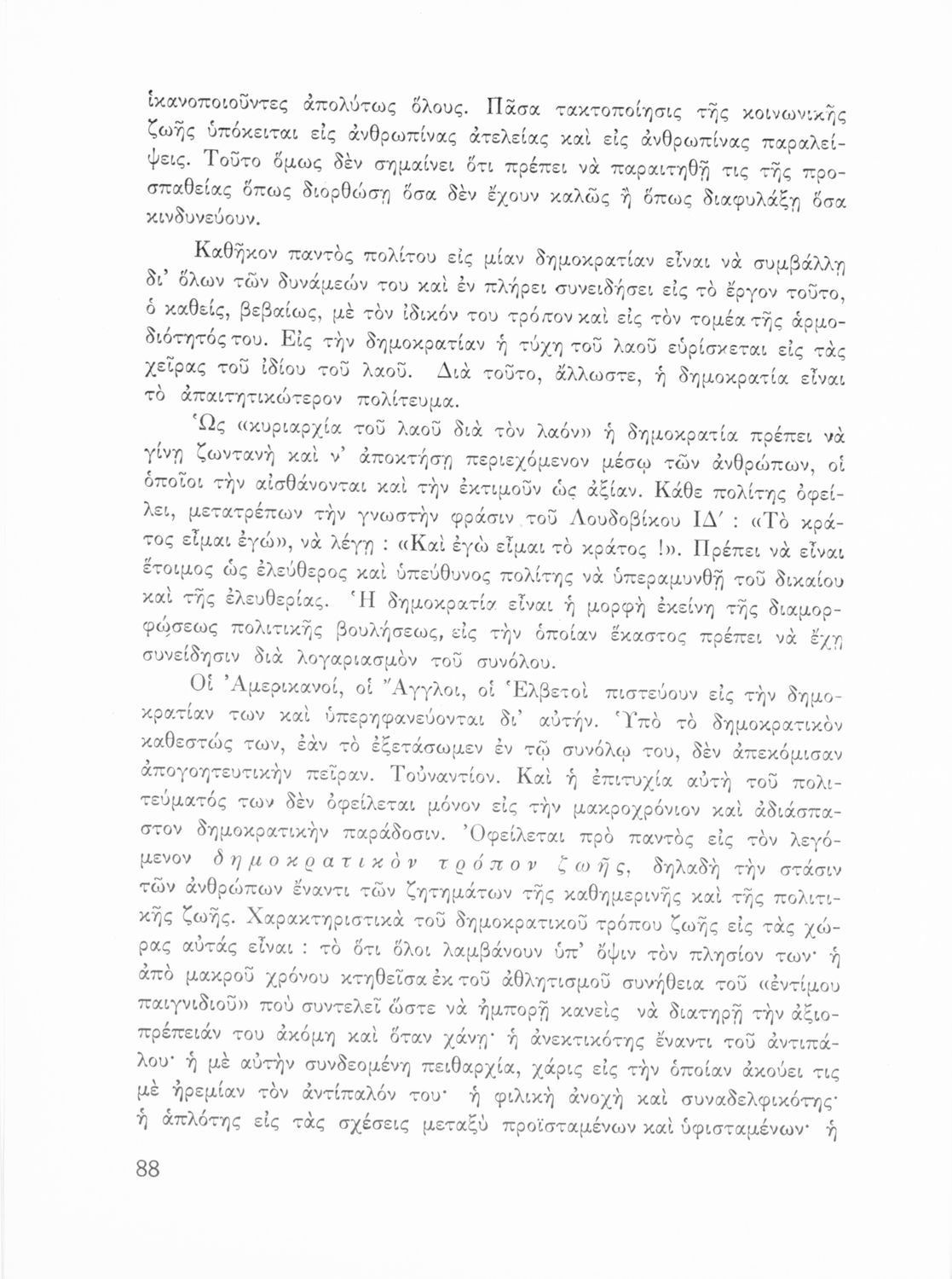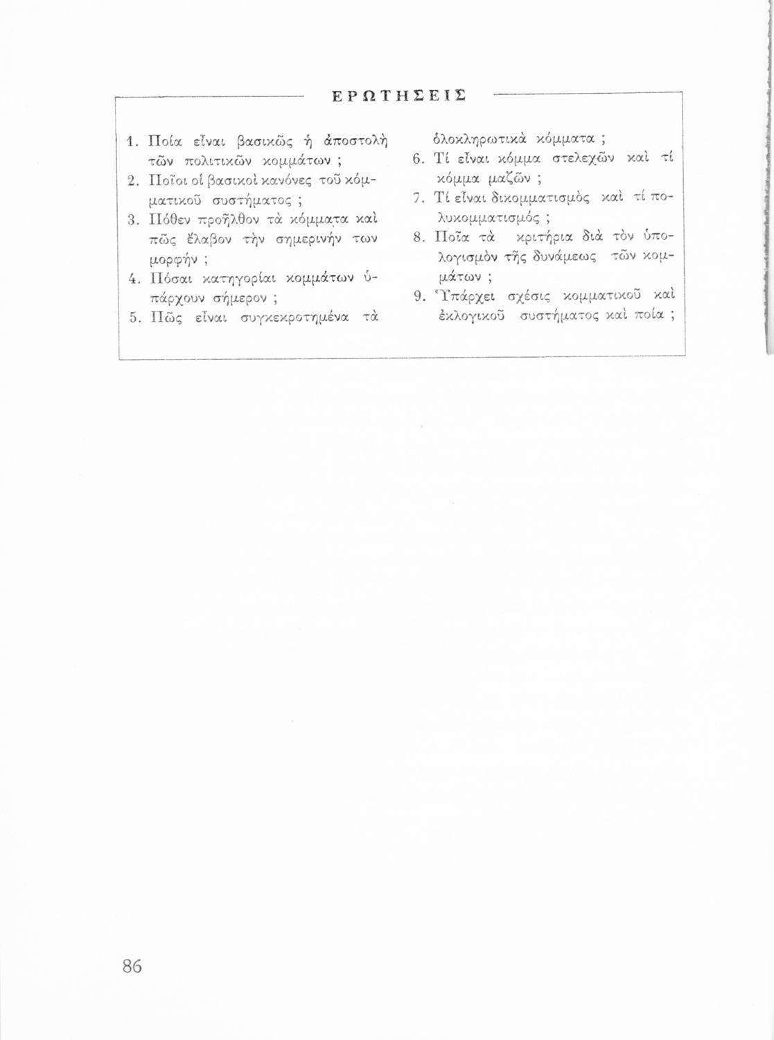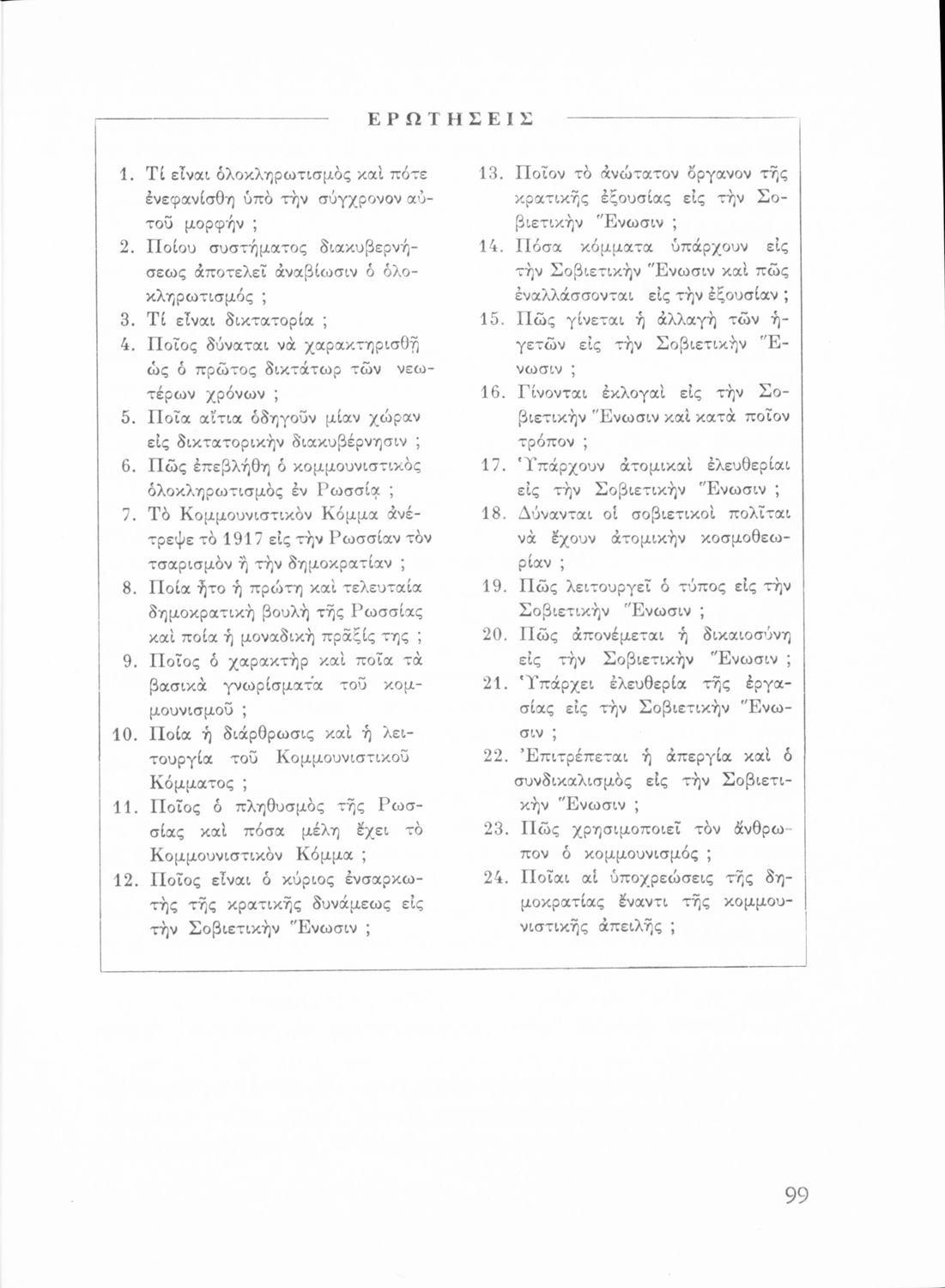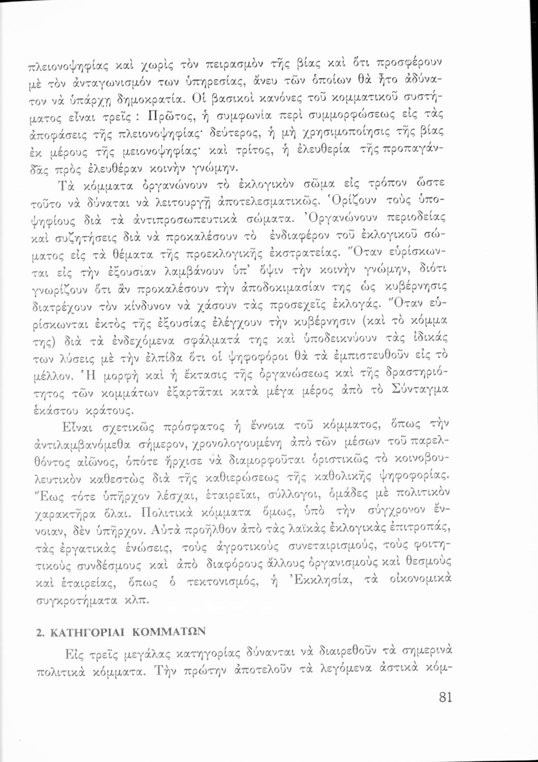 Σχολικό εγχειρίδιο της Γ΄ Γυμνασίου για το μάθημα της Πολιτικής Αγωγής. Αναφέρεται στις γενικές έννοιες του δικαίου, τις μορφές των πολιτευμάτων, τους θεσμούς, το διαχωρισμό των εξουσιών. Συνεχίζει με τη διοίκηση και τις εξουσίες στο Ελληνικό Κράτος. Έπειτα παρουσιάζει τα οικονομικά του κράτους και τους διάφορους τομείς της κοινωνικής ζωής. Αναφέρει την απειλή του Κομμουνισμού και επισημαίνει τα εθνικά σύμβολα. Τέλος γίνεται αναφορά στους Διεθνείς Οργανισμούς. Σκοπός του μαθήματος είναι να αποκτήσουν οι μαθητές ως πολίτες ειδικές αναμορφωμένες στα κοινά γνώσεις, καθώς και την καλλιέργειά της εθνικής συνείδησής.