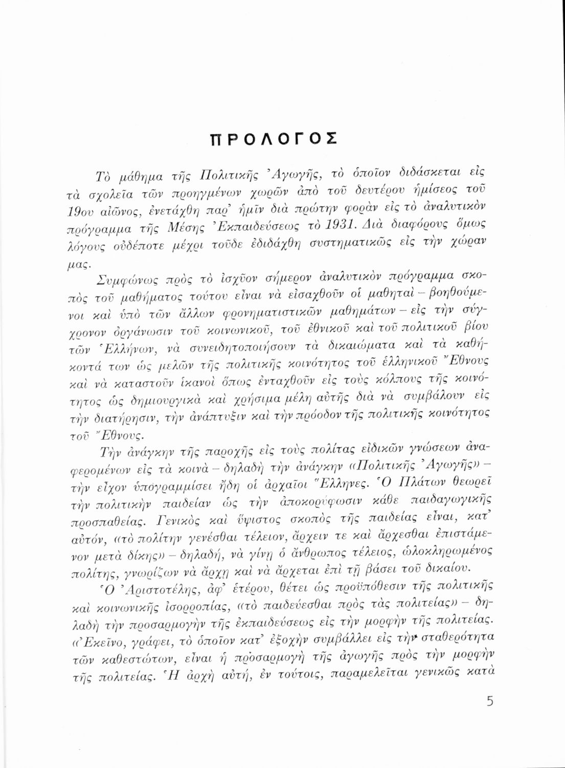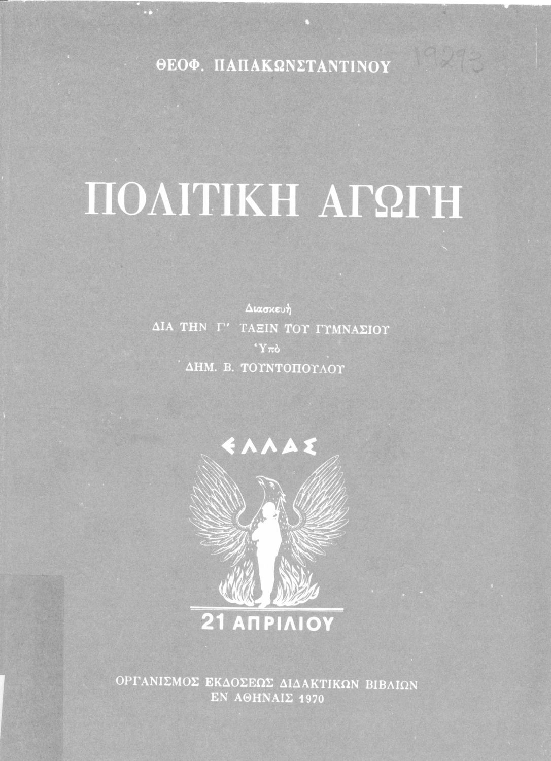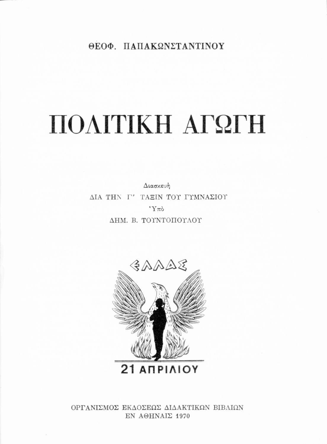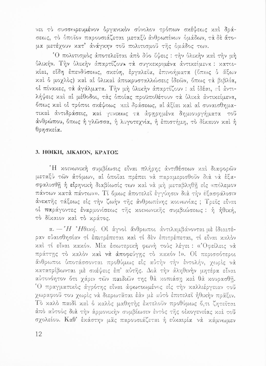 Σχολικό εγχειρίδιο της Γ΄ Γυμνασίου για το μάθημα της Πολιτικής Αγωγής. Αναφέρεται στις γενικές έννοιες του δικαίου, τις μορφές των πολιτευμάτων, τους θεσμούς, το διαχωρισμό των εξουσιών. Συνεχίζει με τη διοίκηση και τις εξουσίες στο Ελληνικό Κράτος. Έπειτα παρουσιάζει τα οικονομικά του κράτους και τους διάφορους τομείς της κοινωνικής ζωής. Αναφέρει την απειλή του Κομμουνισμού και επισημαίνει τα εθνικά σύμβολα. Τέλος γίνεται αναφορά στους Διεθνείς Οργανισμούς. Σκοπός του μαθήματος είναι να αποκτήσουν οι μαθητές ως πολίτες ειδικές αναμορφωμένες στα κοινά γνώσεις, καθώς και την καλλιέργειά της εθνικής συνείδησής.