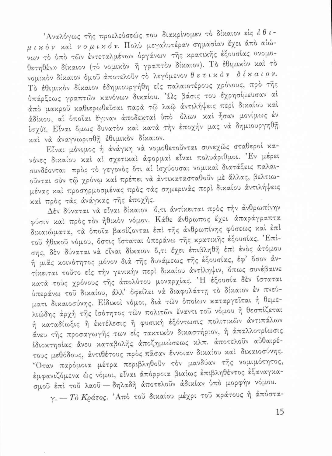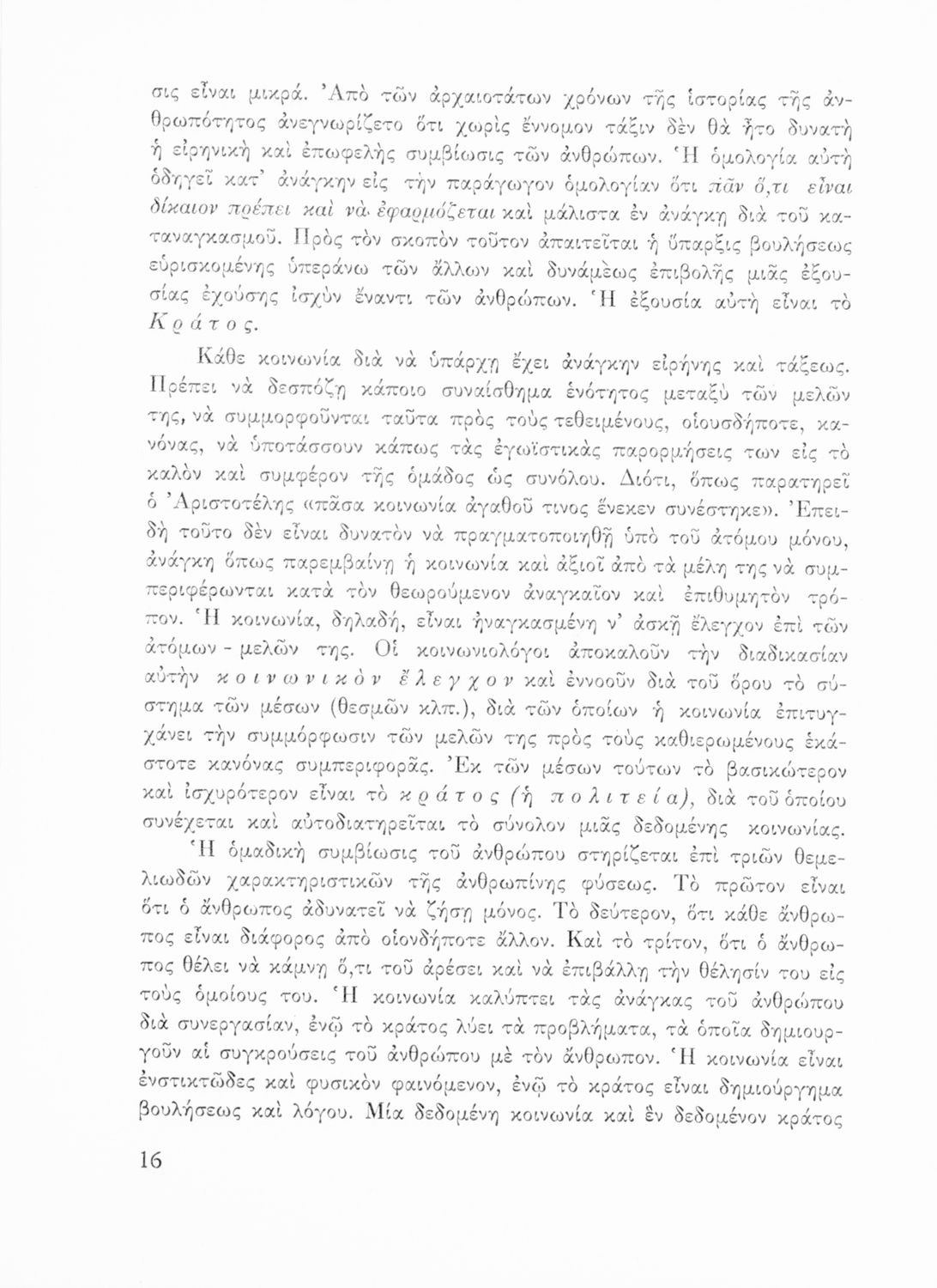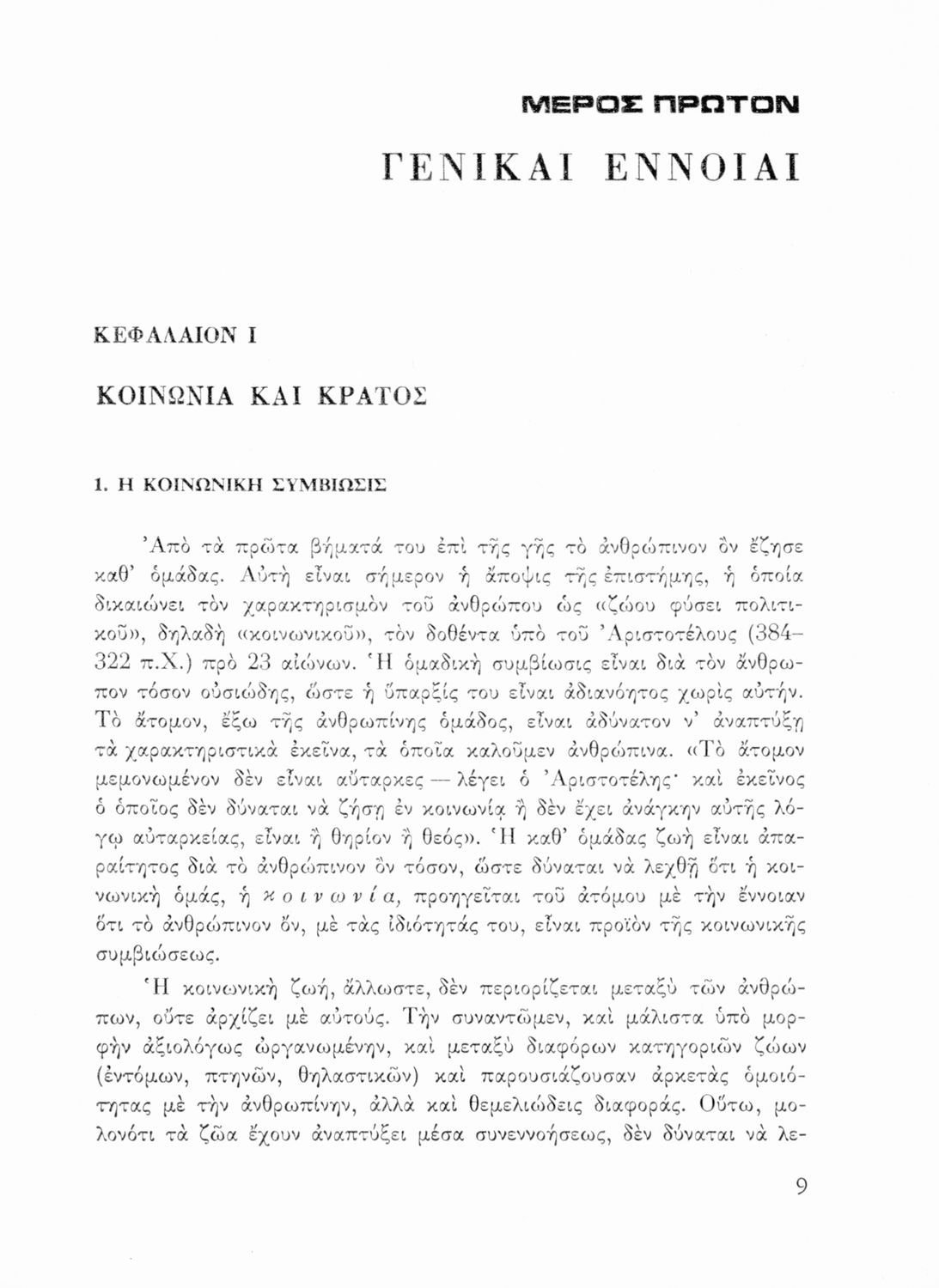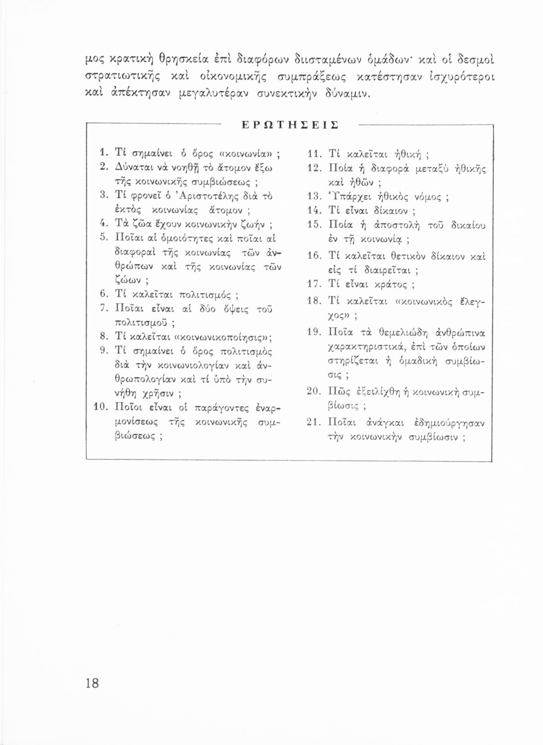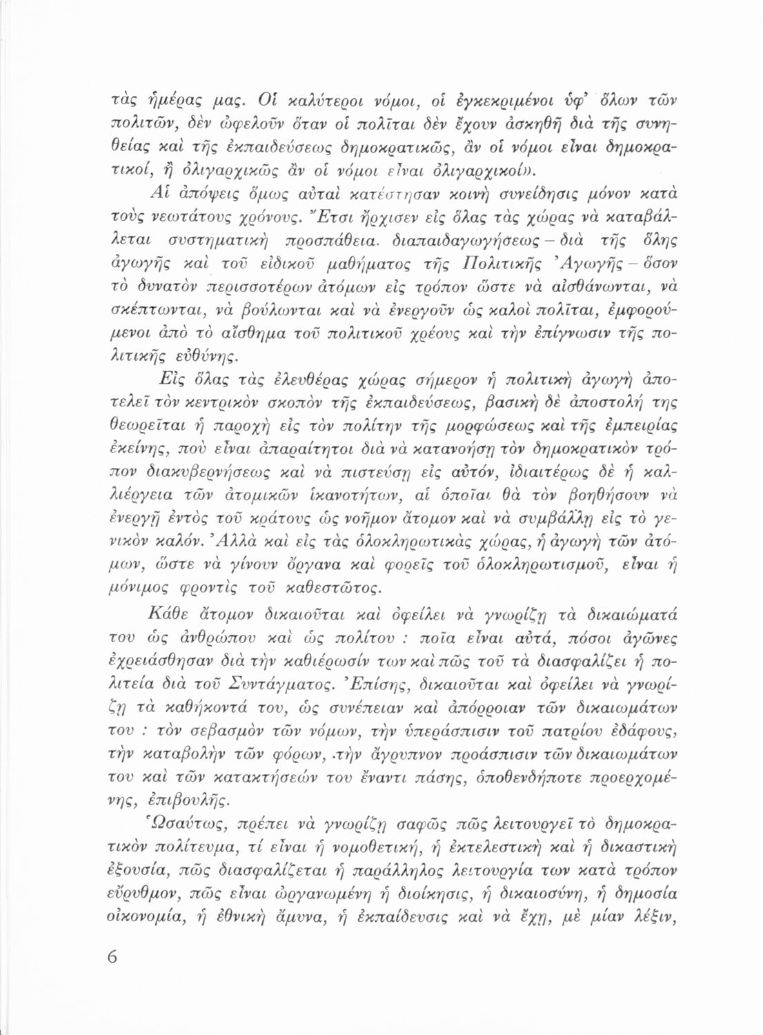 Σχολικό εγχειρίδιο της Γ΄ Γυμνασίου για το μάθημα της Πολιτικής Αγωγής. Αναφέρεται στις γενικές έννοιες του δικαίου, τις μορφές των πολιτευμάτων, τους θεσμούς, το διαχωρισμό των εξουσιών. Συνεχίζει με τη διοίκηση και τις εξουσίες στο Ελληνικό Κράτος. Έπειτα παρουσιάζει τα οικονομικά του κράτους και τους διάφορους τομείς της κοινωνικής ζωής. Αναφέρει την απειλή του Κομμουνισμού και επισημαίνει τα εθνικά σύμβολα. Τέλος γίνεται αναφορά στους Διεθνείς Οργανισμούς. Σκοπός του μαθήματος είναι να αποκτήσουν οι μαθητές ως πολίτες ειδικές αναμορφωμένες στα κοινά γνώσεις, καθώς και την καλλιέργειά της εθνικής συνείδησής.