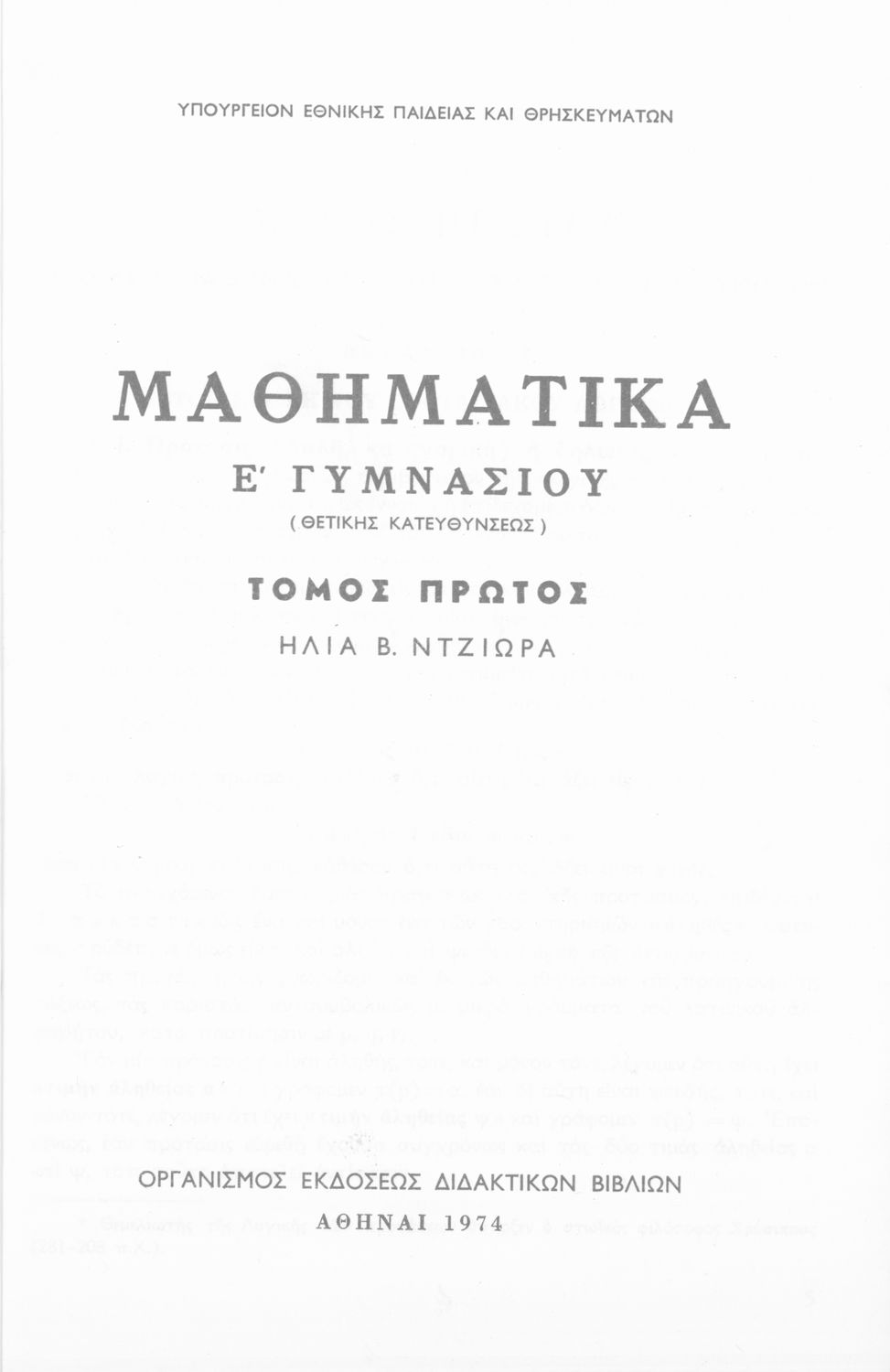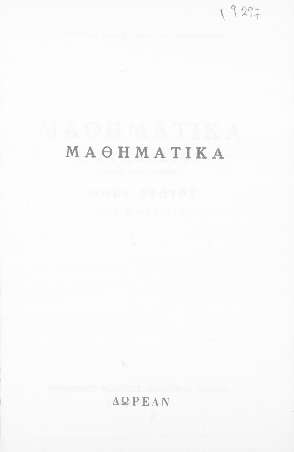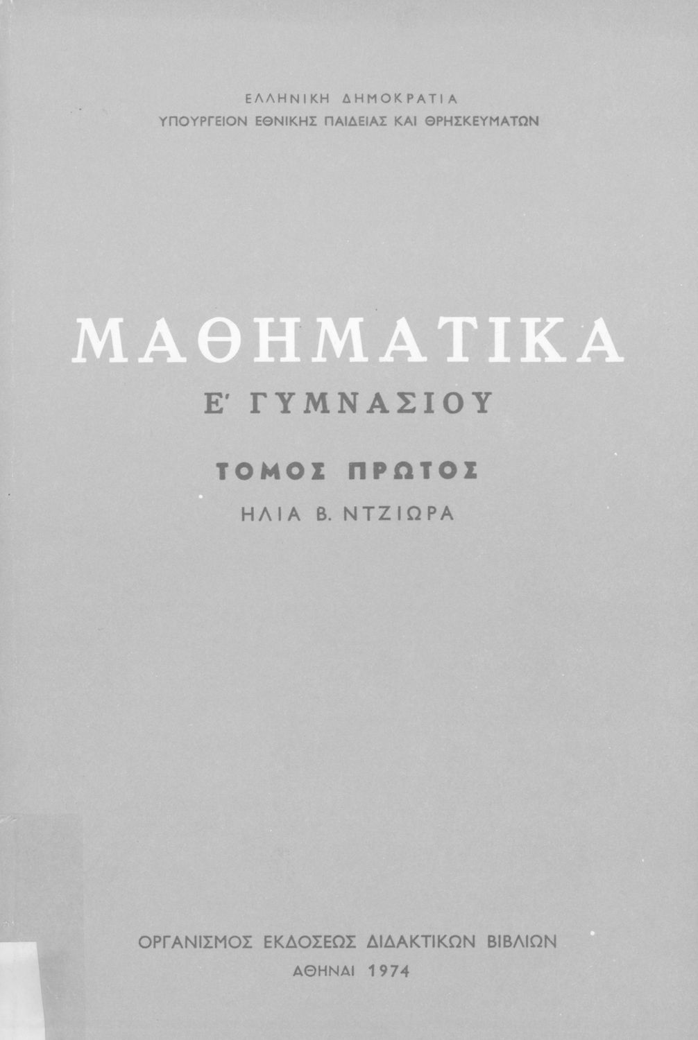 Κωδικός αναγνώρισης: 01-19297 Τίτλος: Μαθηματικά Ε΄ Γυμνασίου (θετικής κατευθύνσεως), τόμος Α΄ Συγγραφέας: Ηλίας Β. Ντζιώρας Μέγεθος και υπόστρωμα: Σχολικό εγχειρίδιο, 22εκ., μαλακό εξώφυλλο, 421 σελίδες. |