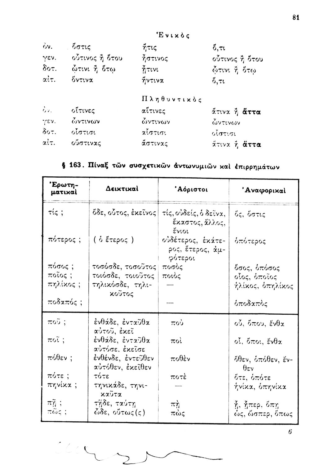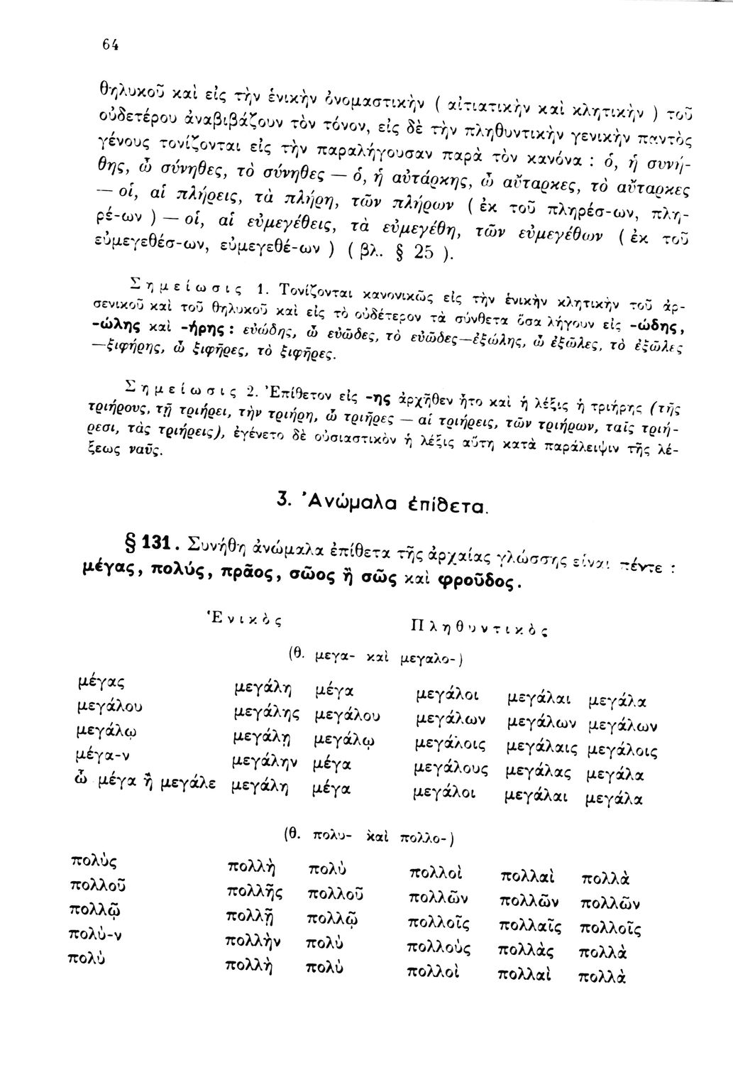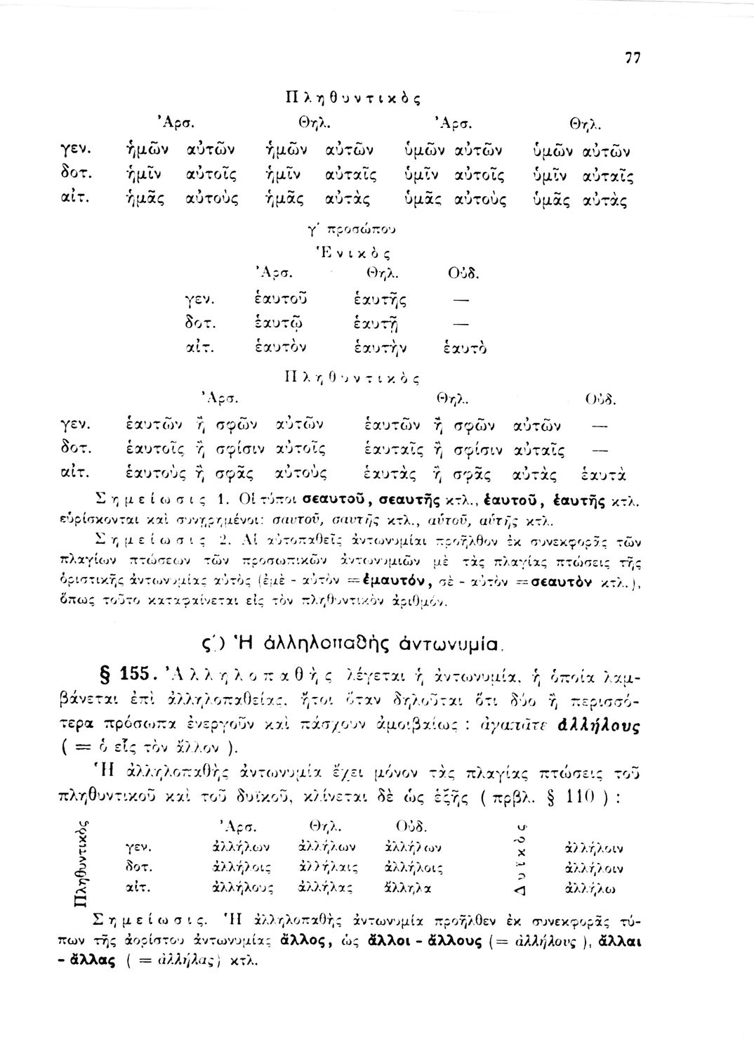 Σχολικό εγχειρίδιο Αρχαίων Ελληνικών Γυμνασίου που περιέχει τους κανόνες γραμματικής και είναι χωρισμένο σε φθογγολογικό, τυπολογικό και ετυμολογικό μέρος. Περιέχει και κατάλογο ανωμάλων ρημάτων.