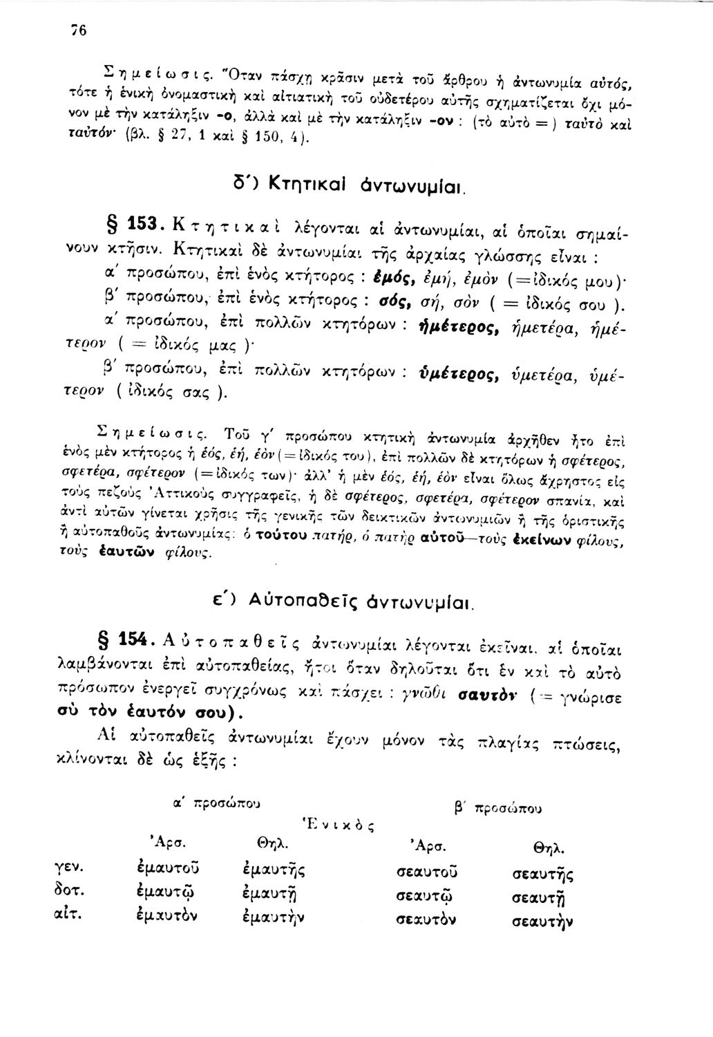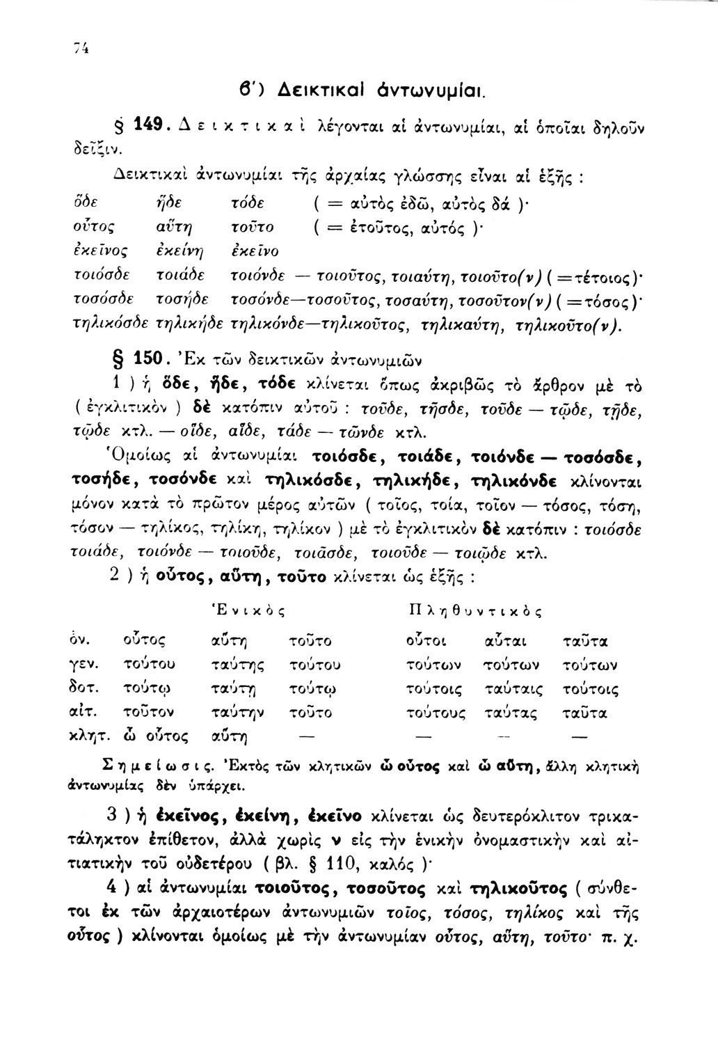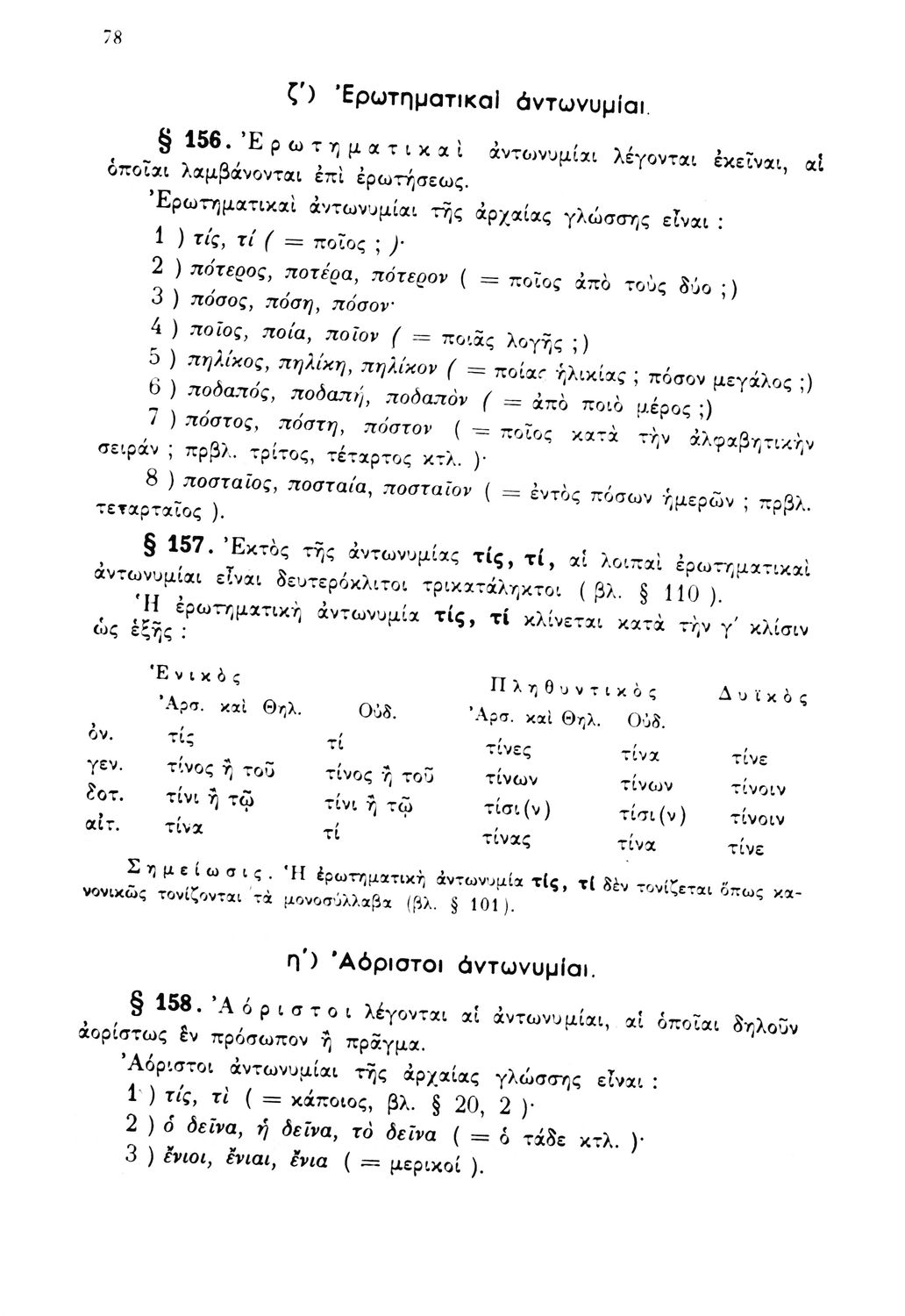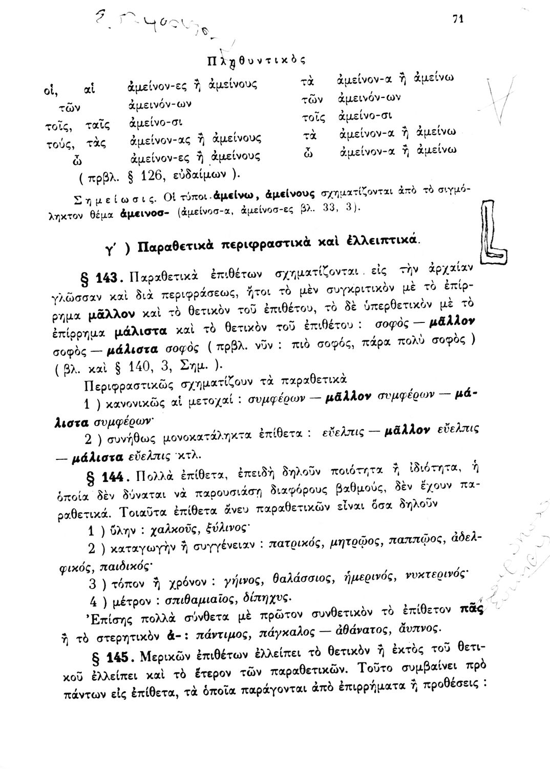 Σχολικό εγχειρίδιο Αρχαίων Ελληνικών Γυμνασίου που περιέχει τους κανόνες γραμματικής και είναι χωρισμένο σε φθογγολογικό, τυπολογικό και ετυμολογικό μέρος. Περιέχει και κατάλογο ανωμάλων ρημάτων.