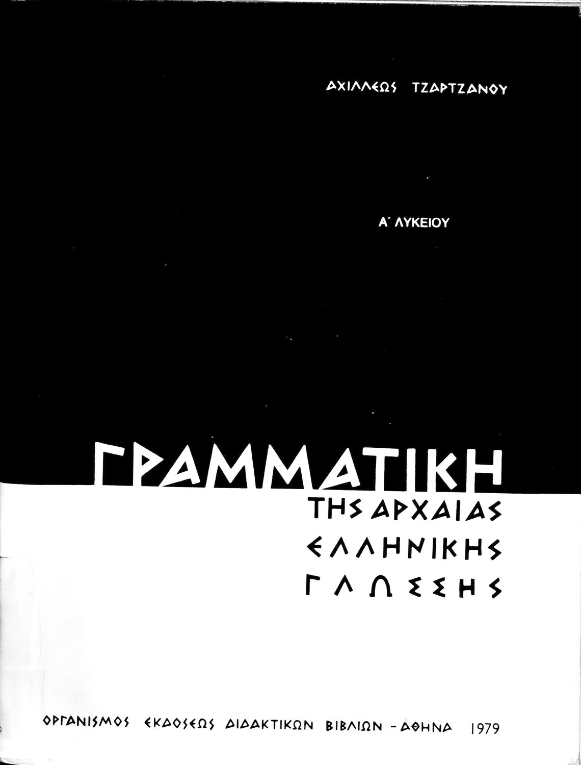 Σχολικό εγχειρίδιο Αρχαίων Ελληνικών Α' Λυκείου που περιέχει τους κανόνες γραμματικής και είναι χωρισμένο σε φθογγολογικό, τυπολογικό και ετυμολογικό μέρος. Περιέχει και κατάλογο ανωμάλων ρημάτων.