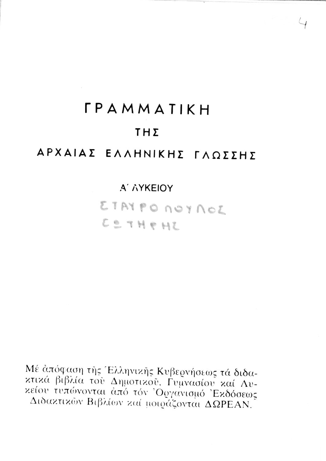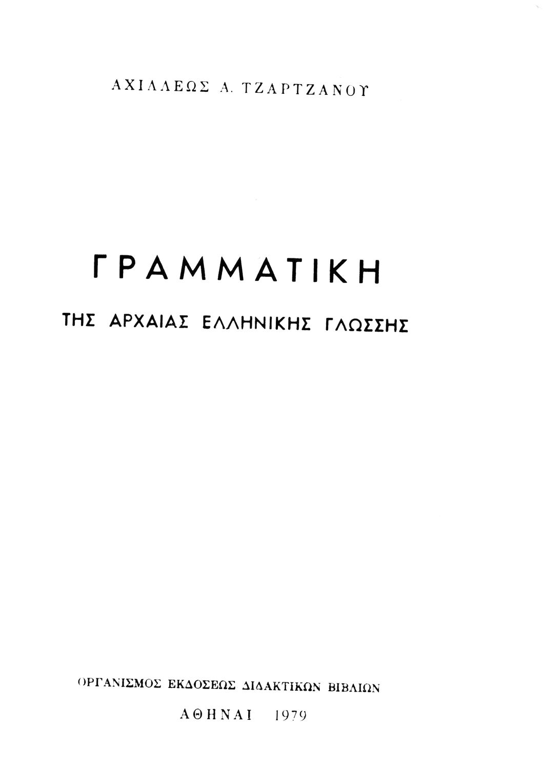 Σχολικό εγχειρίδιο Αρχαίων Ελληνικών Α', Β', Γ' και Δ' Γυμνασίου που περιέχει τους κανόνες γραμματικής και είναι χωρισμένο σε φθογγολογικό, τυπολογικό και ετυμολογικό μέρος. Περιέχει και κατάλογο ανωμάλων ...