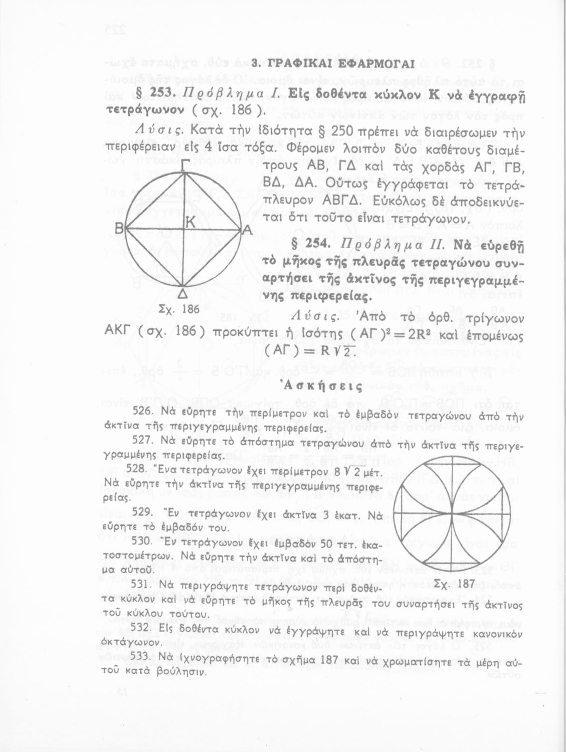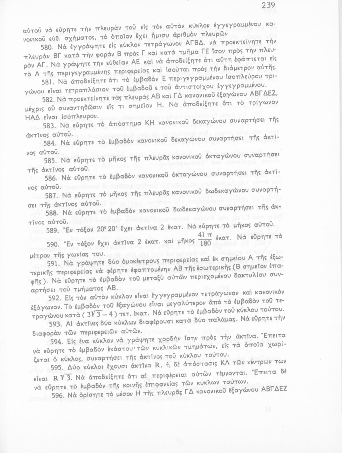 Σχολικό εγχειρίδιο Γεωμετρίας για τις Γ΄, Δ΄, Ε΄, ΣΤ΄ Γυμνασίου που περιλαμβάνει θεωρία και ασκήσεις και είναι χωρισμένο σε Επιπεδομετρία και Στερεομετρία. Φέρει το σύμβολο της δικτατορίας.