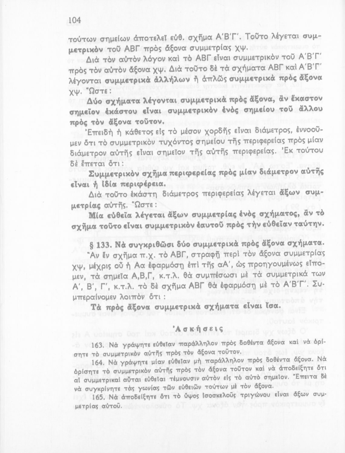 Σχολικό εγχειρίδιο Γεωμετρίας για τις Γ΄, Δ΄, Ε΄, ΣΤ΄ Γυμνασίου που περιλαμβάνει θεωρία και ασκήσεις και είναι χωρισμένο σε Επιπεδομετρία και Στερεομετρία. Φέρει το σύμβολο της δικτατορίας.