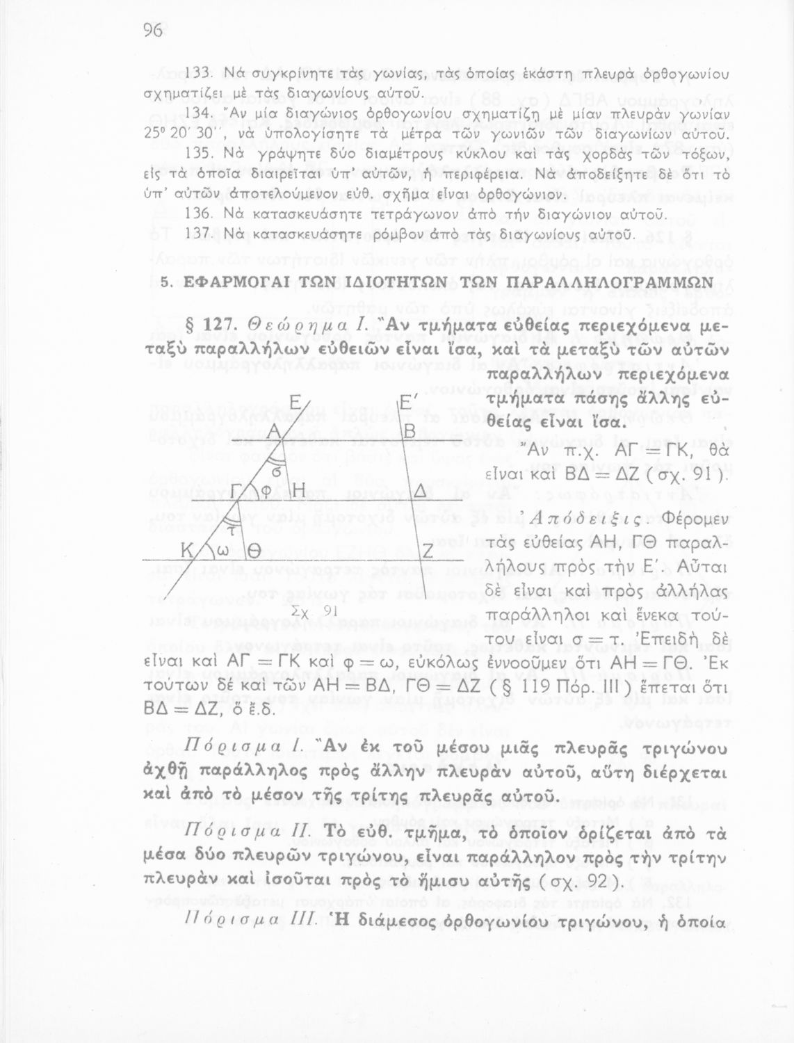 Σχολικό εγχειρίδιο Γεωμετρίας Γυμνασίου που είναι χωρισμένο σε θεωρήματα και ασκήσεις και εστιάζει στα βασικά θεωρήματα και ιδιότητες των γεωμετρικών σχημάτων. .
