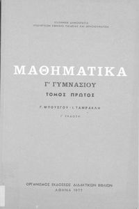 Σχολικό εγχειρίδιο μαθηματικών Γ΄ Γυμνασίου που περιλαμβάνει θεωρία, παραδείγματα και ασκήσεις. Φέρει το σύμβολο της δικτατορίας.