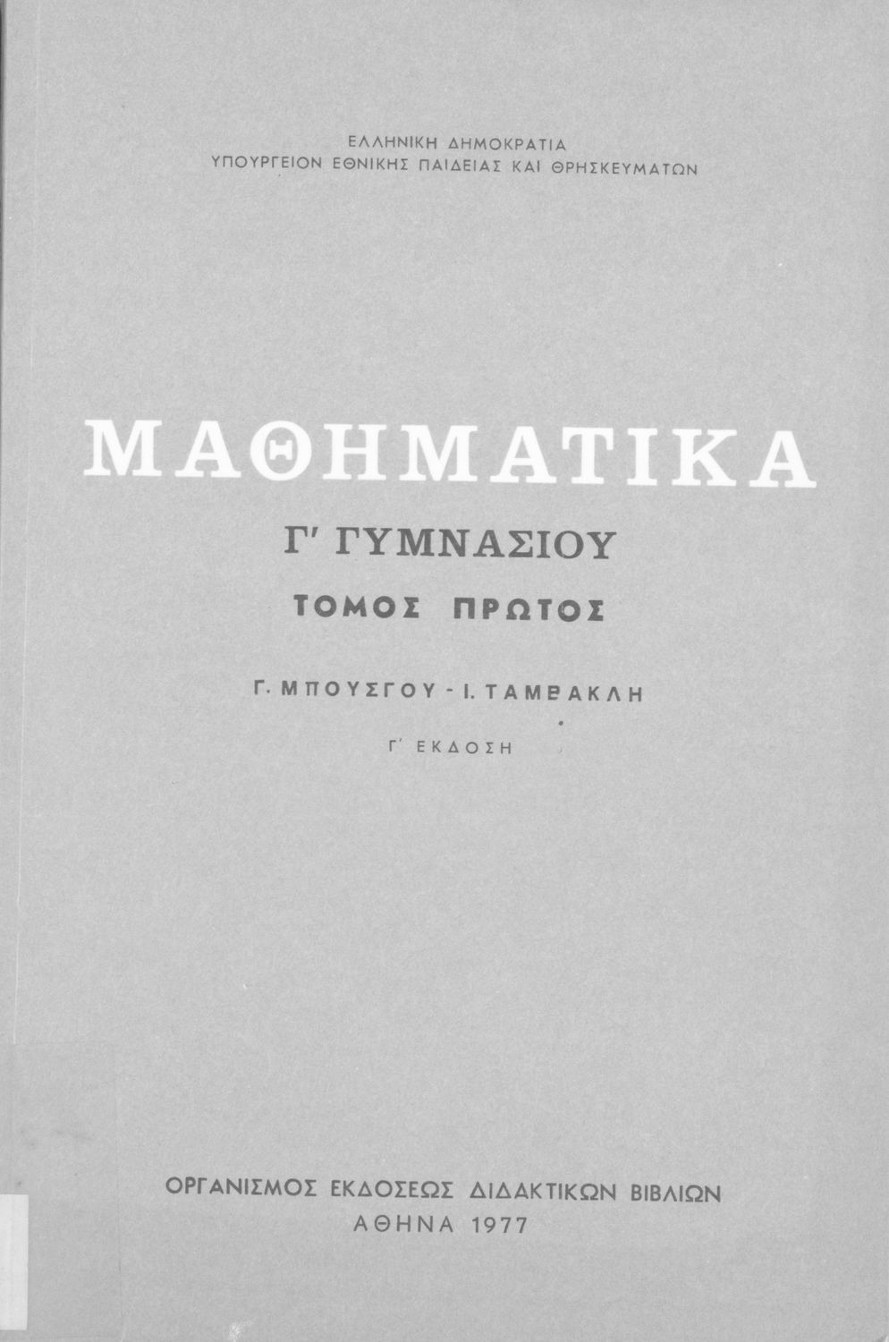 Σχολικό εγχειρίδιο Μαθηματικών Γ΄ Γυμνασίου που εστιάζει στη Γεωμετρία. Φέρει το σύμβολο της δικτατορίας. Ο συγγραφέας ήταν επιμελητής στο ΕΜΠ.