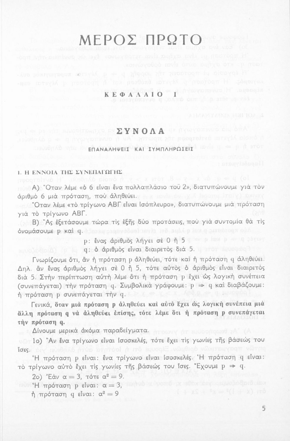 Σχολικό εγχειρίδιο Μαθηματικών για την Ε΄ Γυμνασίου, χωρισμένο σε προβλήματα, εφαρμογές και ασκήσεις, που εστιάζει στην Τριγωνομετρία. Φέρει το σύμβολο της δικτατορίας.