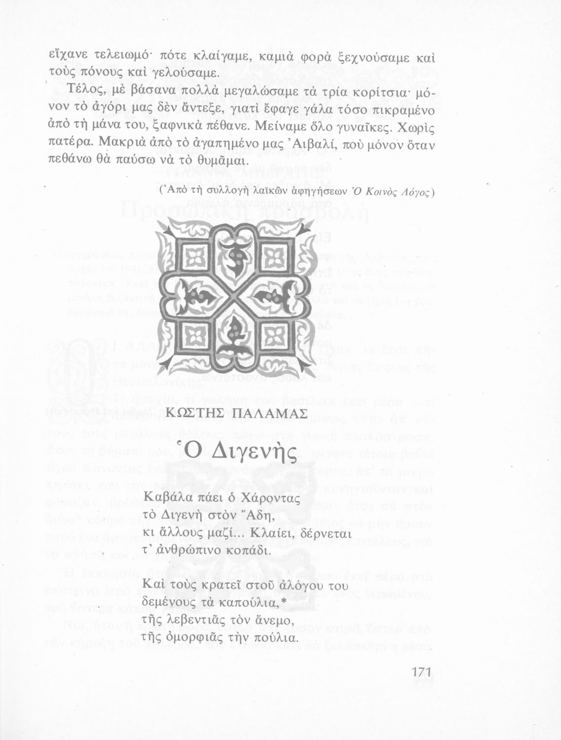 Αναγνωστικό για τις Ε' και ΣΤ΄ Δημοτικού που περιλαμβάνει πεζά και ποιήματα της Νέας Ελληνικής Λογοτεχνίας εμπνευσμένα από την καθημερινότητα των παιδιών και των οικογενειών τους, την ελληνική ιστορία, τις οικογενειακές στιγμές και εορτές, το παιχνίδι και την εθνική παράδοση, και τα δημοτικά και ακριτικά τραγούδια. Περιέχει και 5 κείμενα γραμμένα στην καθαρεύουσα με θέματα από τον κοινωνικό και εθνικό βίο, και ερμηνευτικό λεξιλόγιο.. Το βιβλίο είναι αφιερωμένο στη μνήμη της Πηνελόπης Δέλτα.