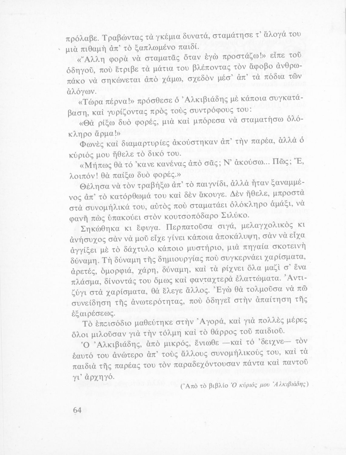 Αναγνωστικό για τις Ε' και ΣΤ΄ Δημοτικού που περιλαμβάνει πεζά και ποιήματα της Νέας Ελληνικής Λογοτεχνίας εμπνευσμένα από την καθημερινότητα των παιδιών και των οικογενειών τους, την ελληνική ιστορία, τις οικογενειακές στιγμές και εορτές, το παιχνίδι και την εθνική παράδοση, και τα δημοτικά και ακριτικά τραγούδια. Περιέχει και 5 κείμενα γραμμένα στην καθαρεύουσα με θέματα από τον κοινωνικό και εθνικό βίο, και ερμηνευτικό λεξιλόγιο.. Το βιβλίο είναι αφιερωμένο στη μνήμη της Πηνελόπης Δέλτα.