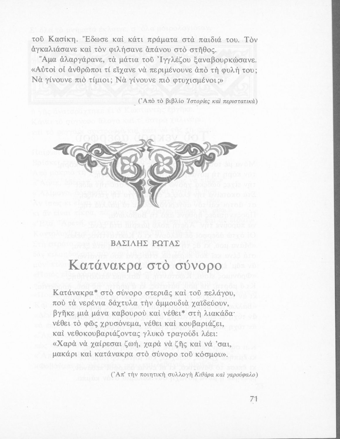 Αναγνωστικό που περιλαμβάνει πεζά και ποιήματα της νέας ελληνικής λογοτεχνίας για τους μαθητές του Δημοτικού. Το βιβλίο είναι αφιερωμένο στη μνήμη του Ζαχαρία Παπαντωνίου και αναδημοσιεύει αρκετά κείμενα από ...