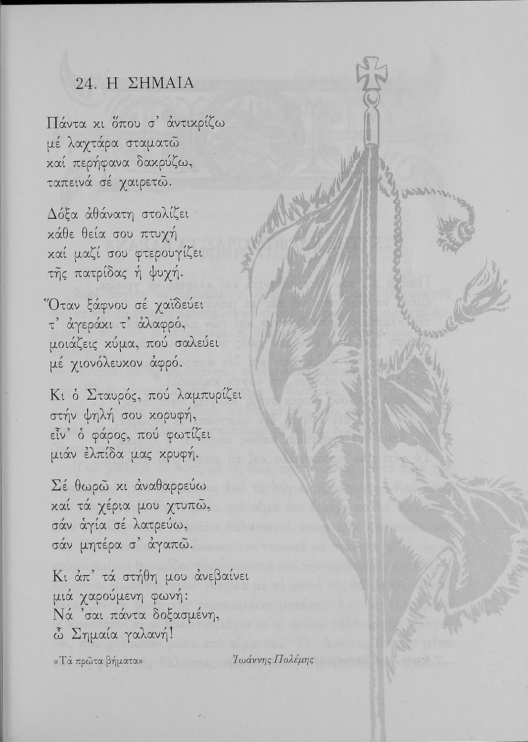 Αναγνωστικό Ε΄ Δημοτικού που περιέχει κείμενα εμπνευσμένα από την εθνική, κοινωνική και οικογενειακή ζωή και την ελληνική φύση, μυθολογία και ιστορία. Φέρει το σύμβολο της δικτατορίας.