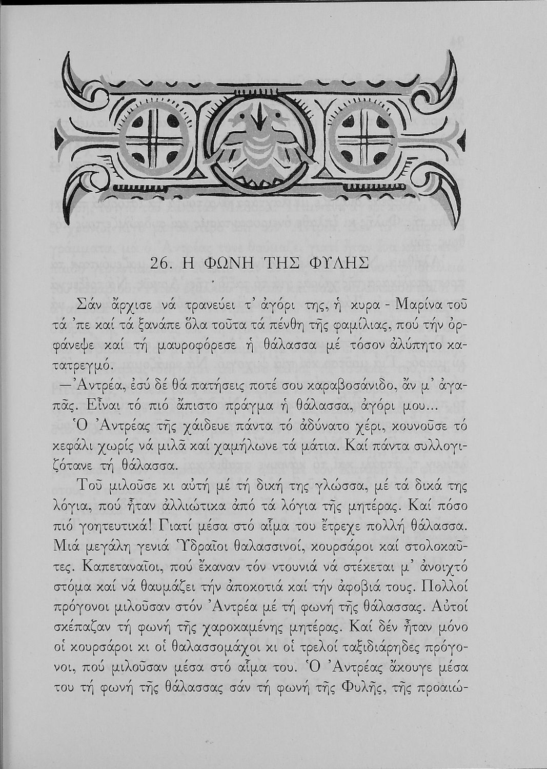 Αναγνωστικό Ε΄ Δημοτικού που περιέχει κείμενα εμπνευσμένα από την εθνική, κοινωνική και οικογενειακή ζωή και την ελληνική φύση, μυθολογία και ιστορία.